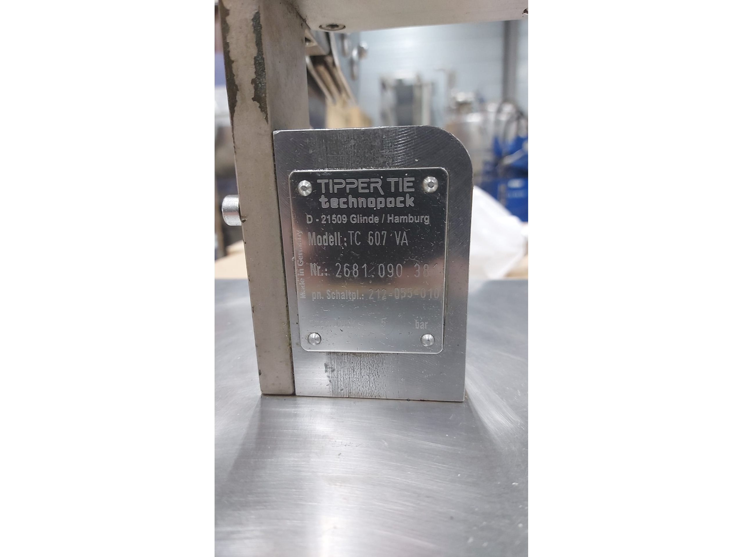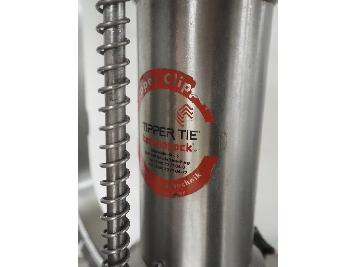 TipperTie Technopack clipper, type: TCV 607 VA, number: 2681.090.38, air pressure: 5 bar, dimensions: 450 mm x 370 mm x 920 mm. Including pallet with large amount of boxes with clips, type: 603 T, 1400 clips per box, dimensions pallet: 1200 mm x 800 mm x 710 mm.