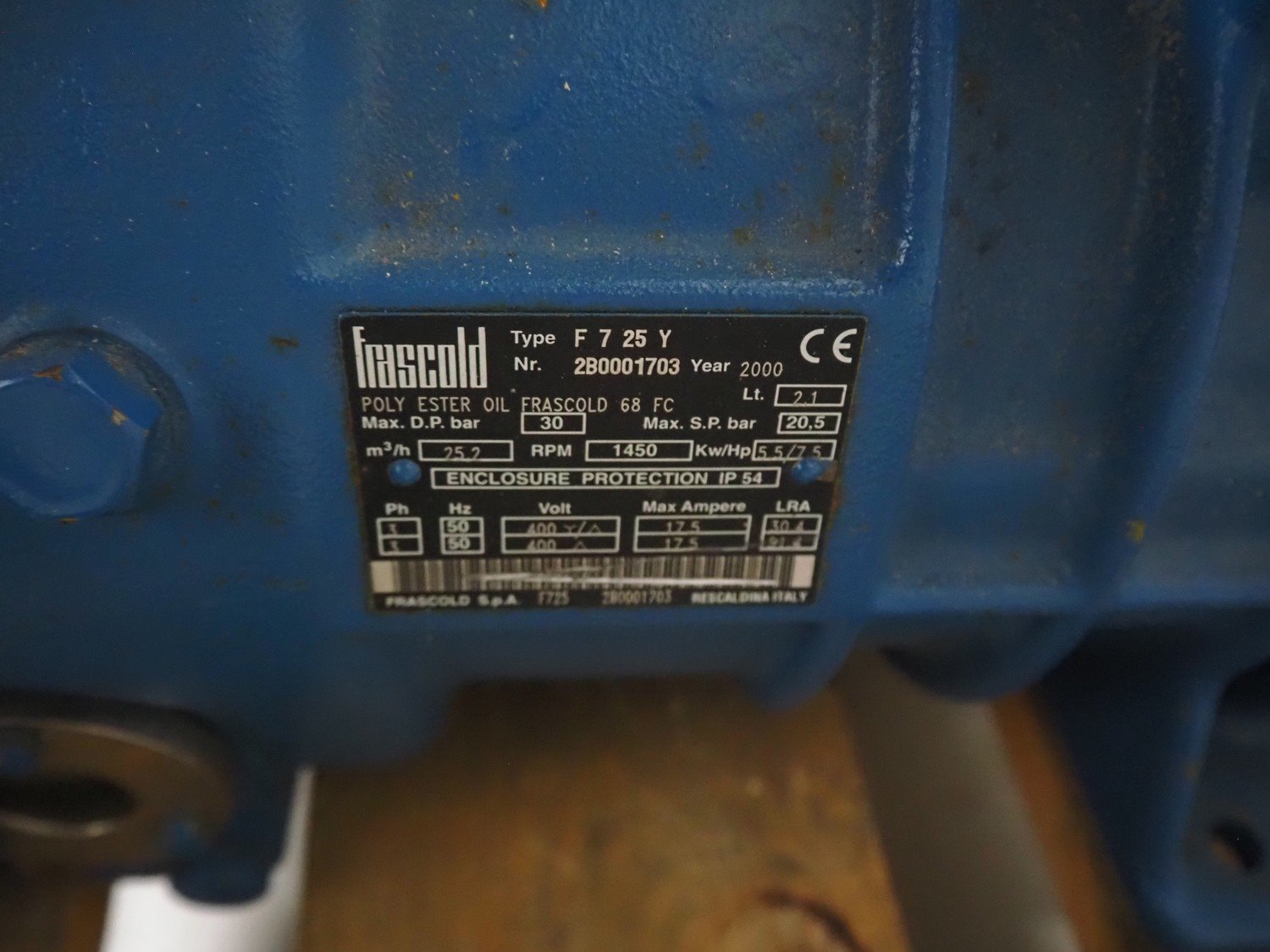 Frascold cooling compressor, type: F 7 25 Y, number: 2B0001703, year of construction: 2000, capacity: 25.2 M³ per hour, dimensions: 480 mm x 250 mm x 350 mm. Incomplete.