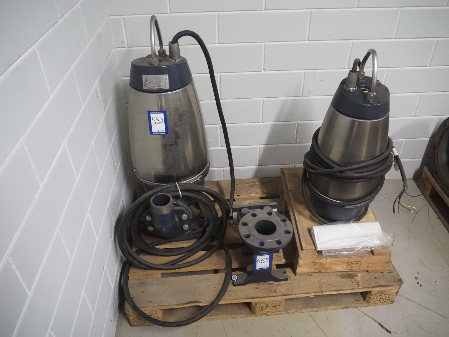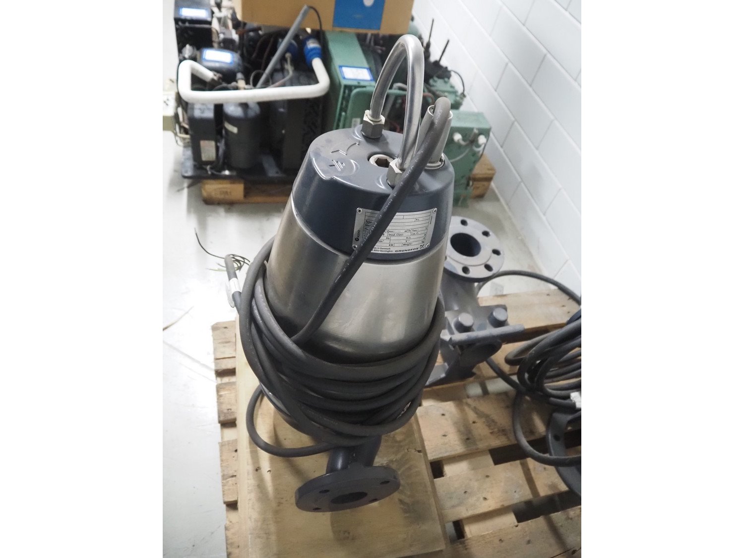 Pallet with 2 Grundfos sewage pumps, type: SEV.65.65.22.2.50D, capacity: 45 m³ per hour, dimensions: 1200 mm x 800 mm x 1000 mm.