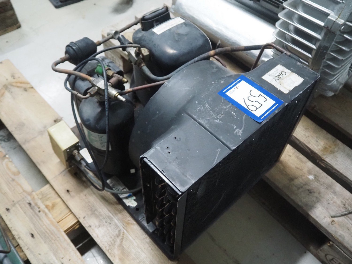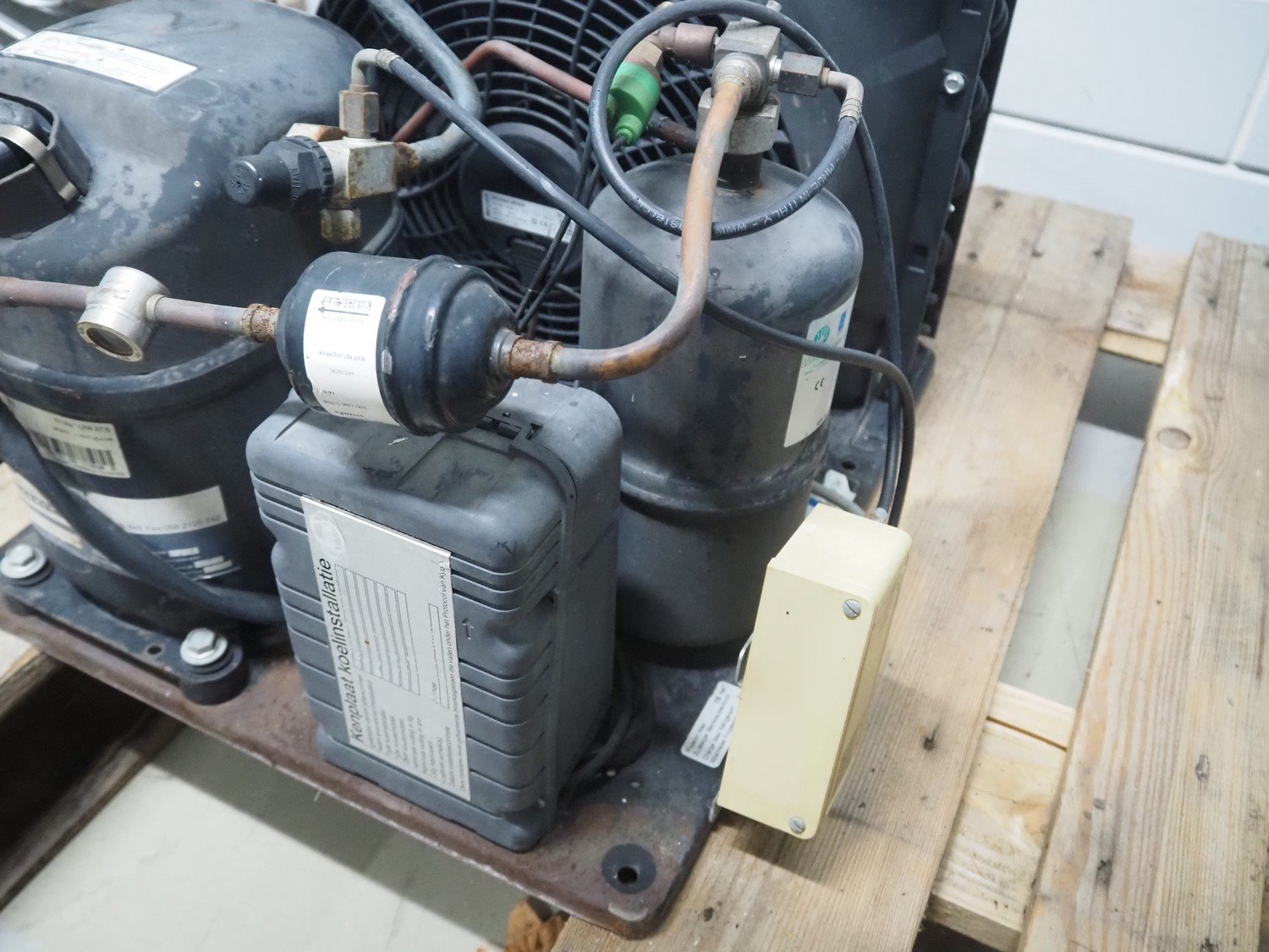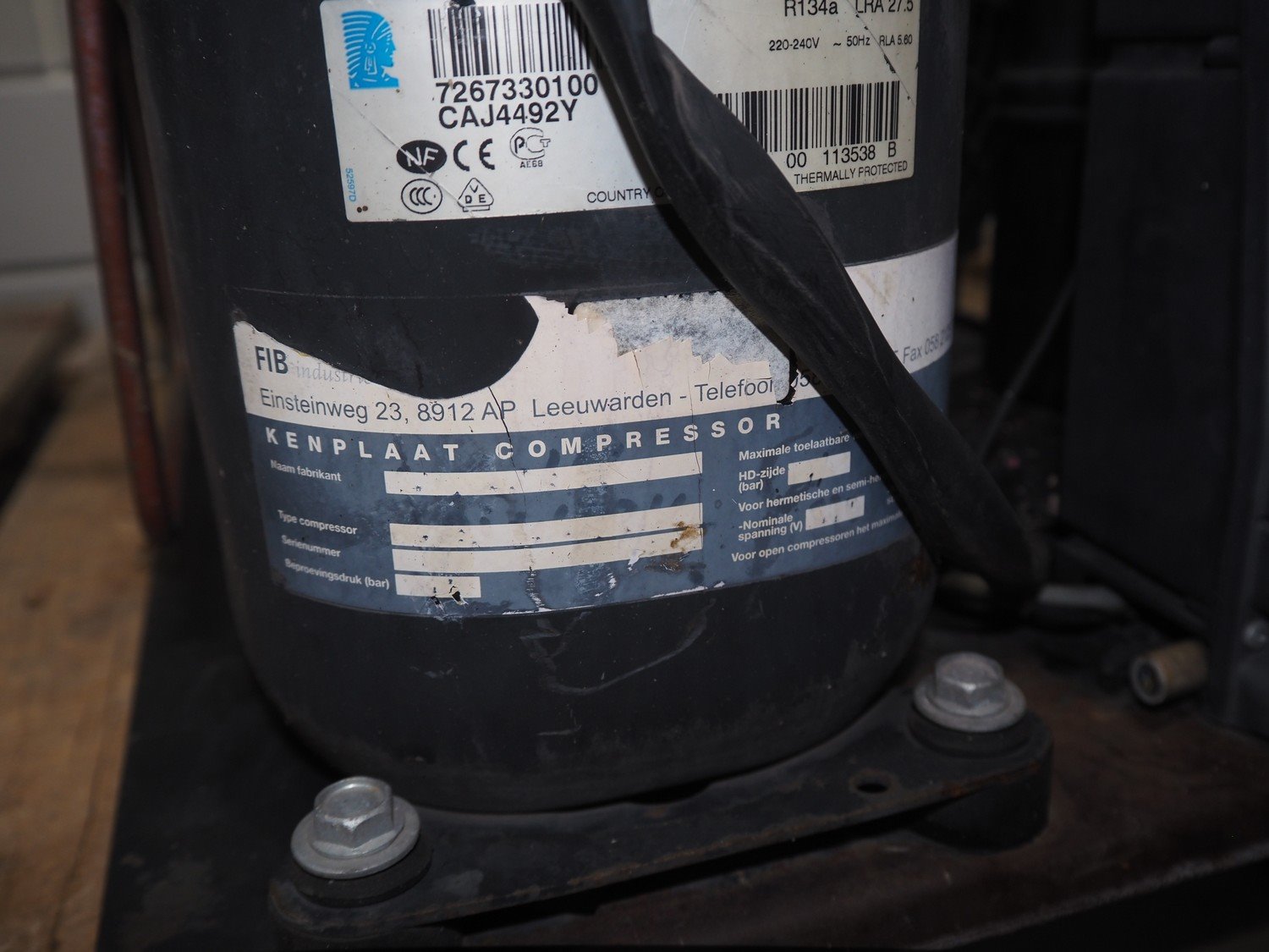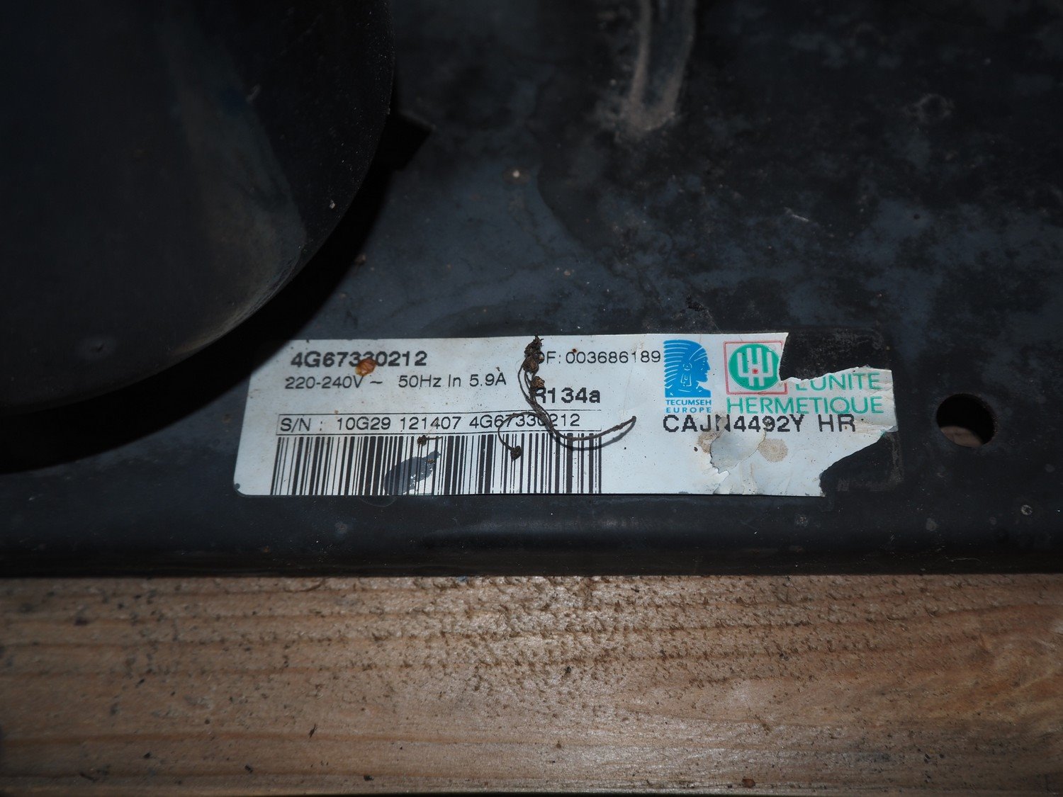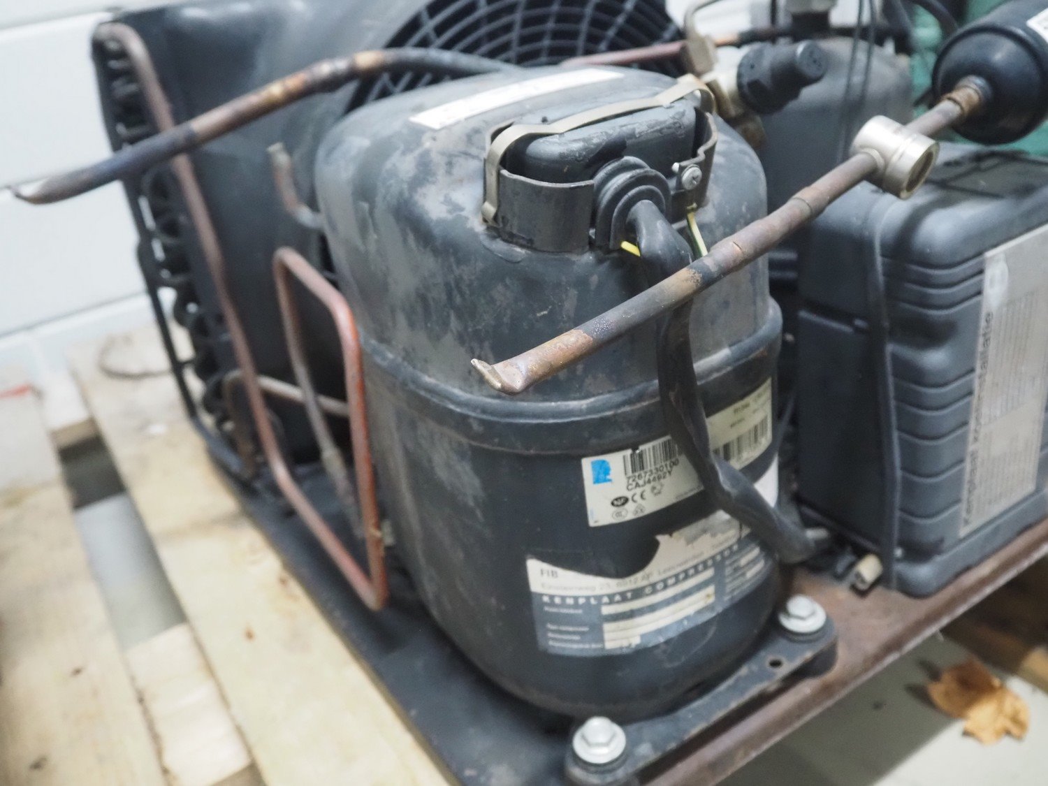 L'Unite Hermetique cooling compressor with condenser, model: CAJN4492Y HR, serial number: 10G29 121407, 220-240 V, 50 Hz, 5.9 A, refrigerant: R134a, dimensions: 500 mm x 500 mm x 400 mm.