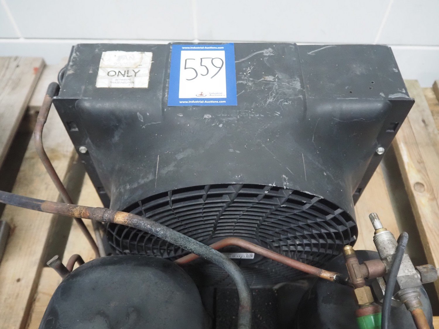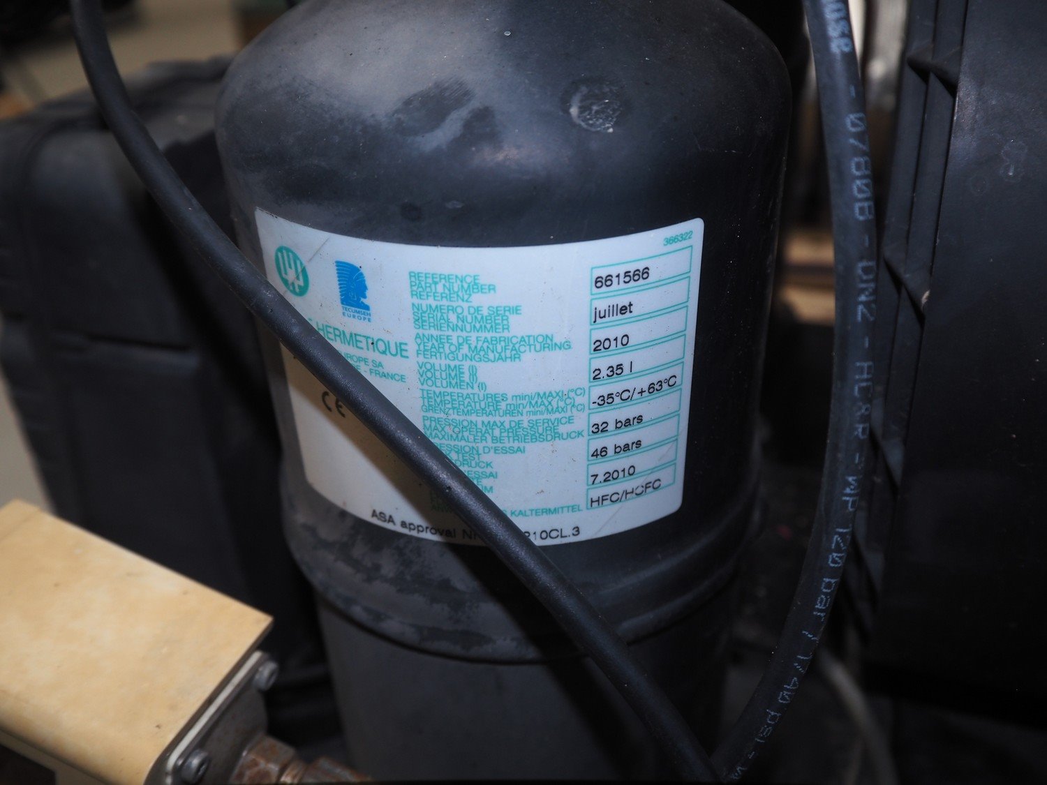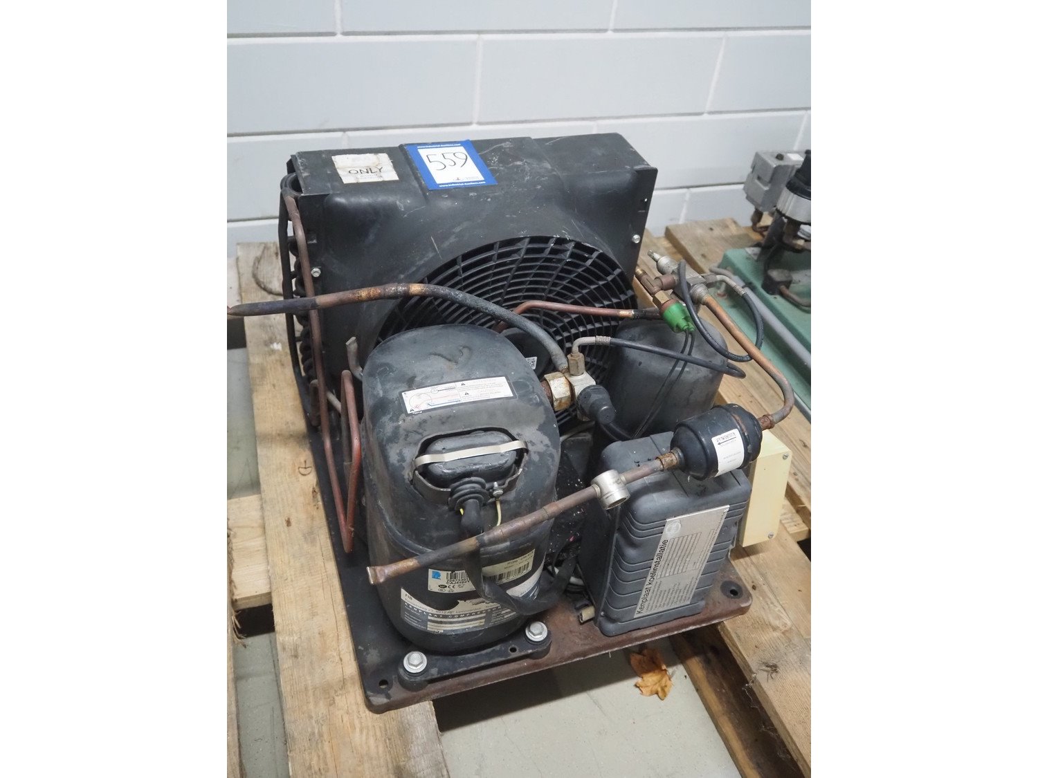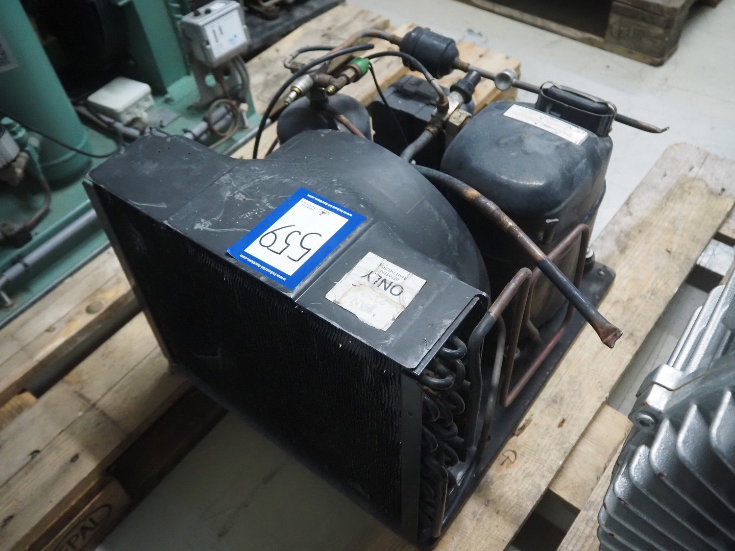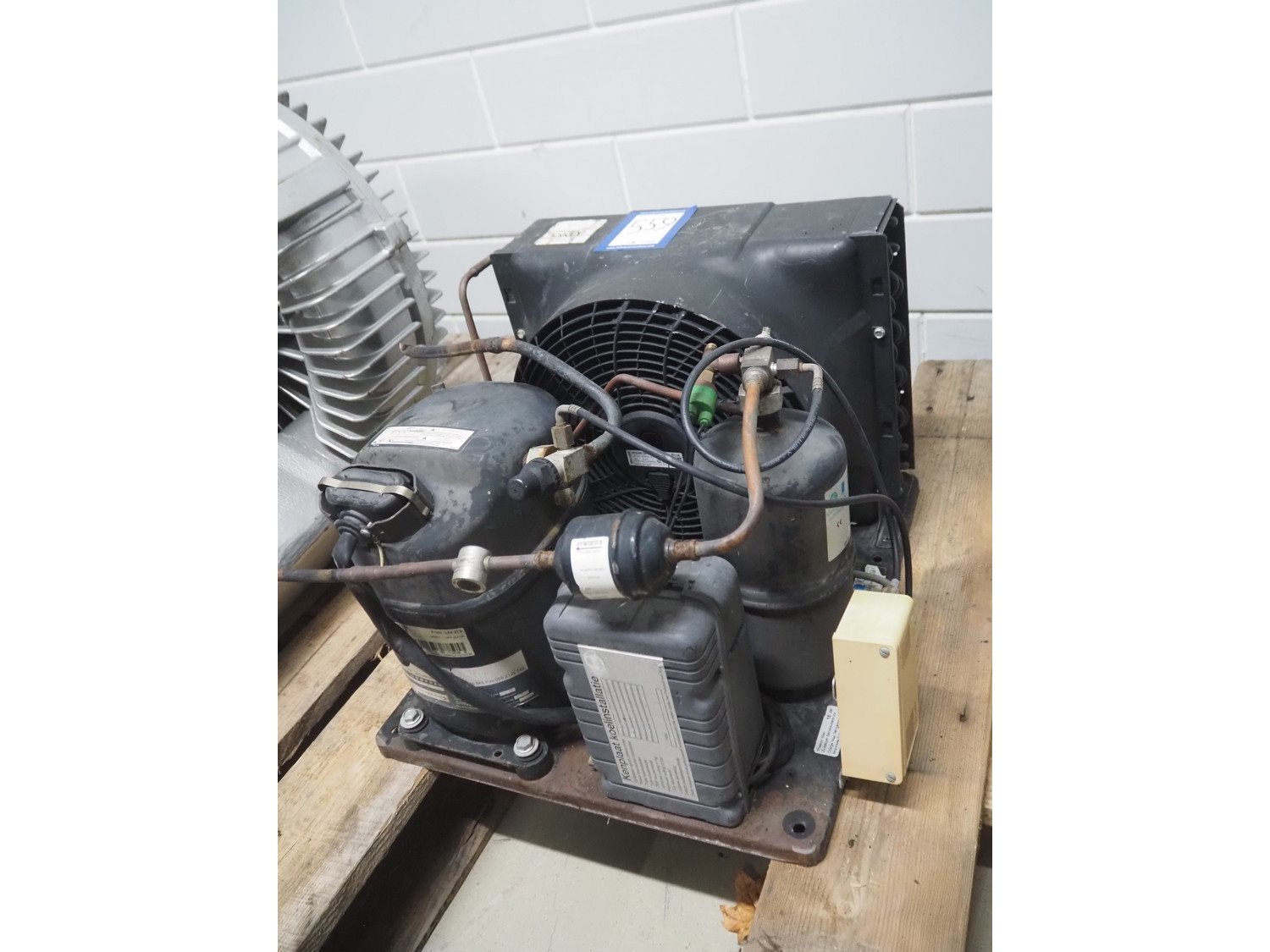 L'Unite Hermetique cooling compressor with condenser, model: CAJN4492Y HR, serial number: 10G29 121407, 220-240 V, 50 Hz, 5.9 A, refrigerant: R134a, dimensions: 500 mm x 500 mm x 400 mm.