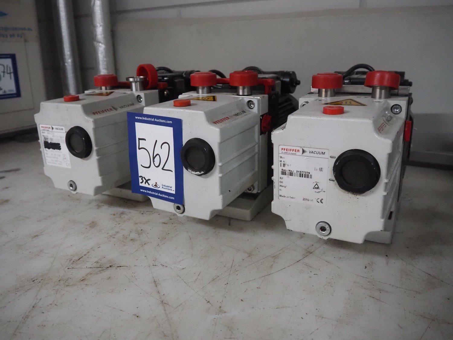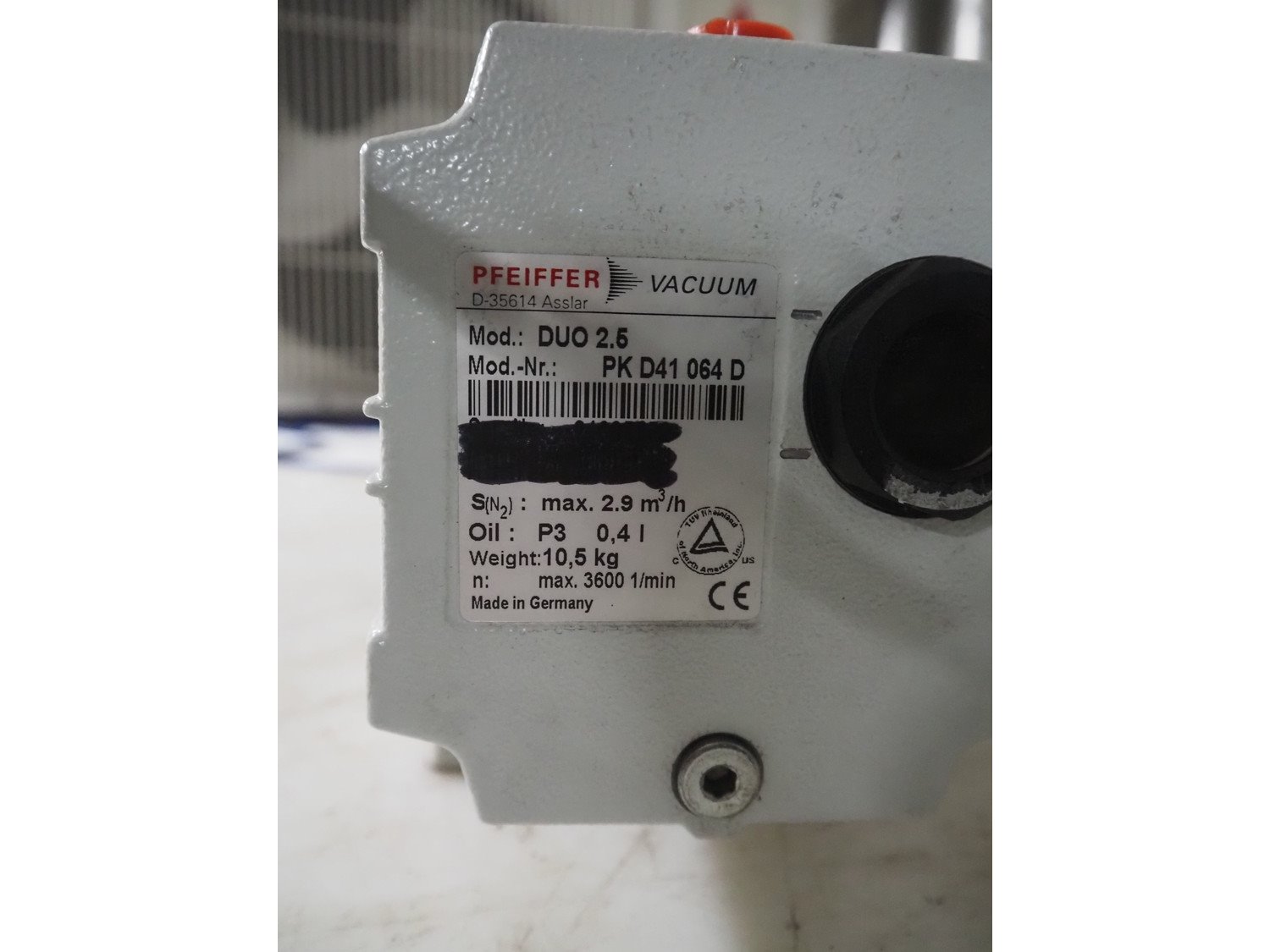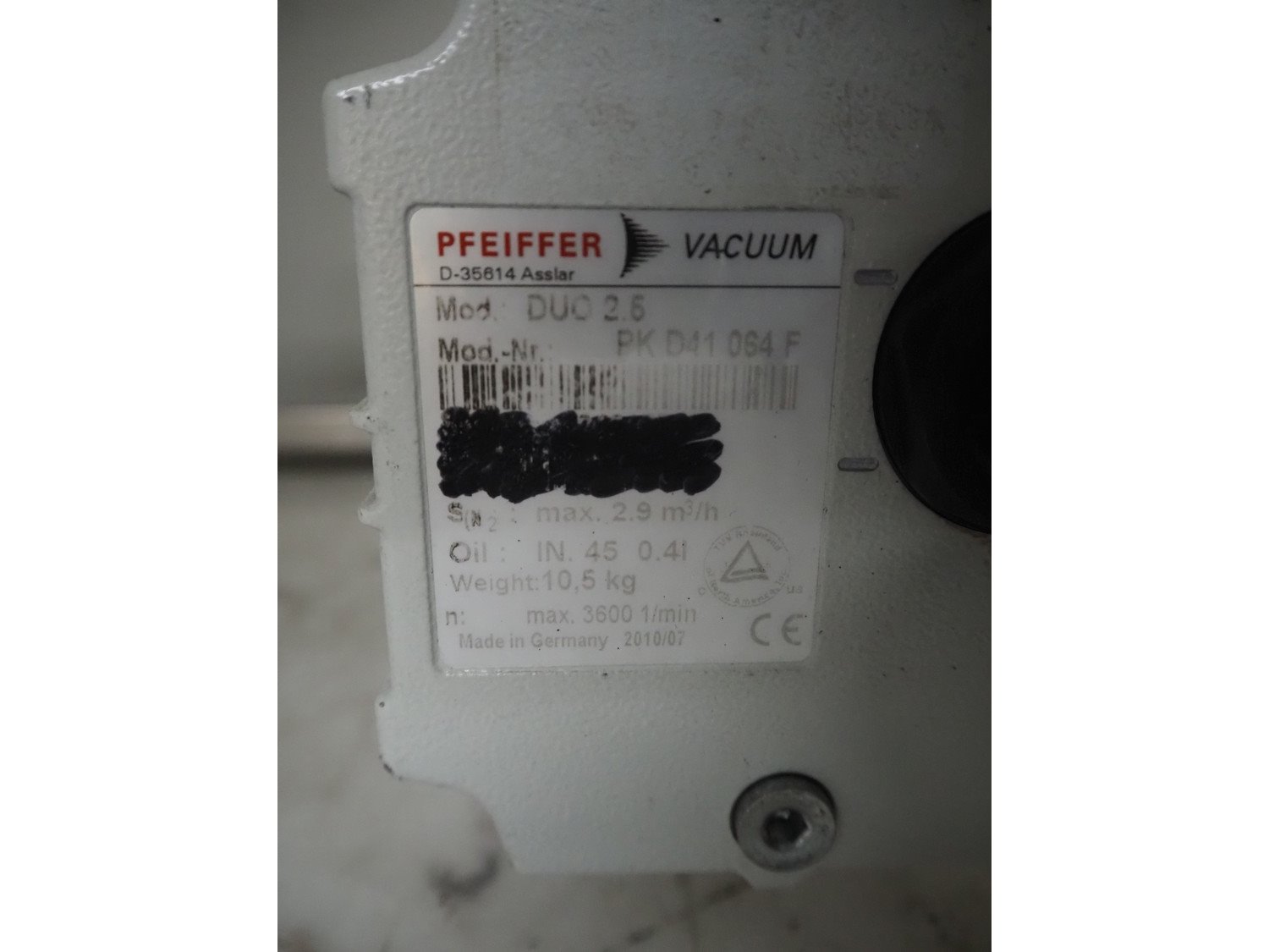 3 Pfeiffer Vacuum pumps, model: DUO 2.5 and DUO 2.6, serial number: 21577376, year of construction: 2010, capacity: 2.9 m³ per hour, weight: 10.5 kg, dimensions: (3x) 310 mm x 120 mm x 190 mm.