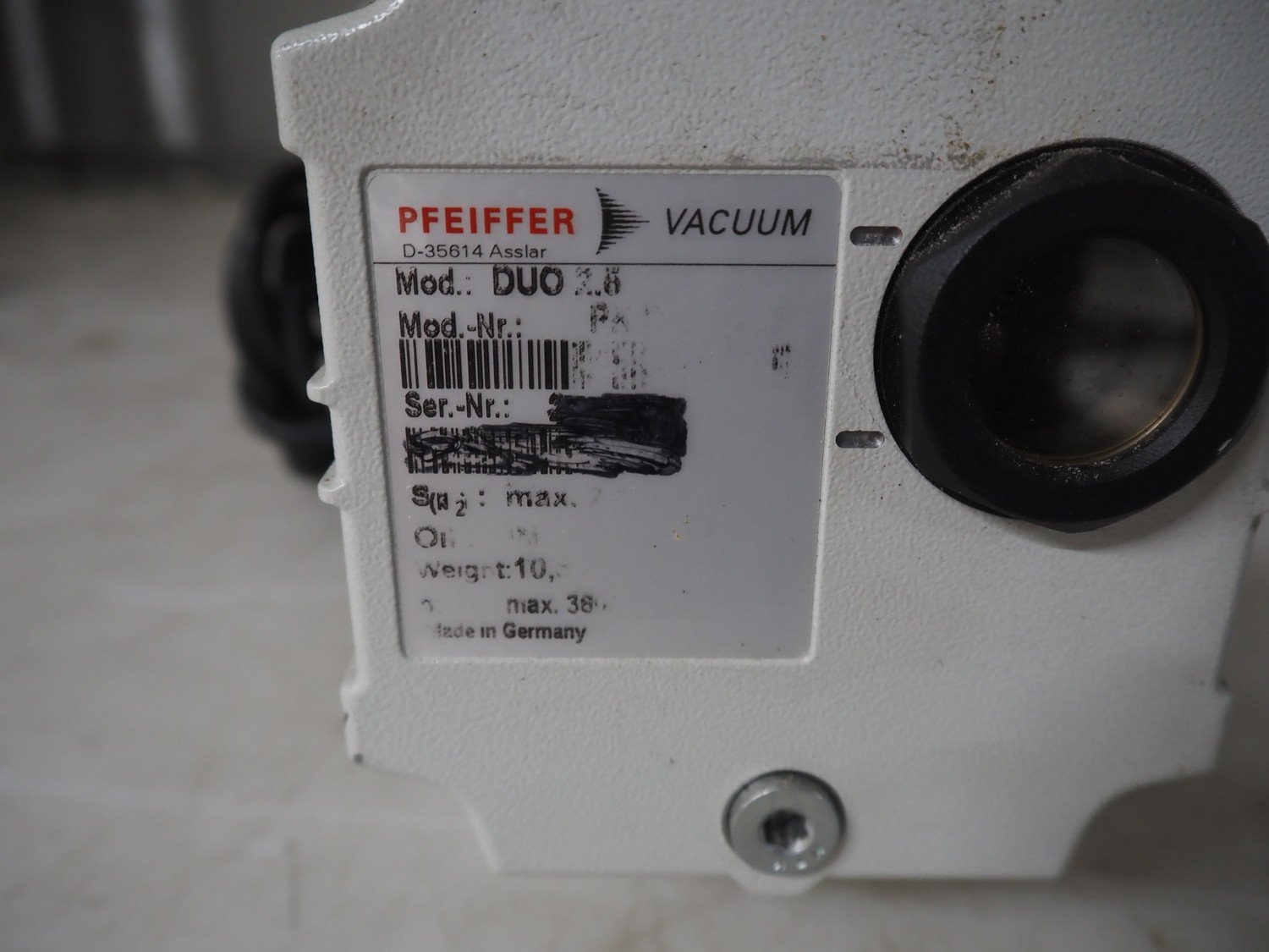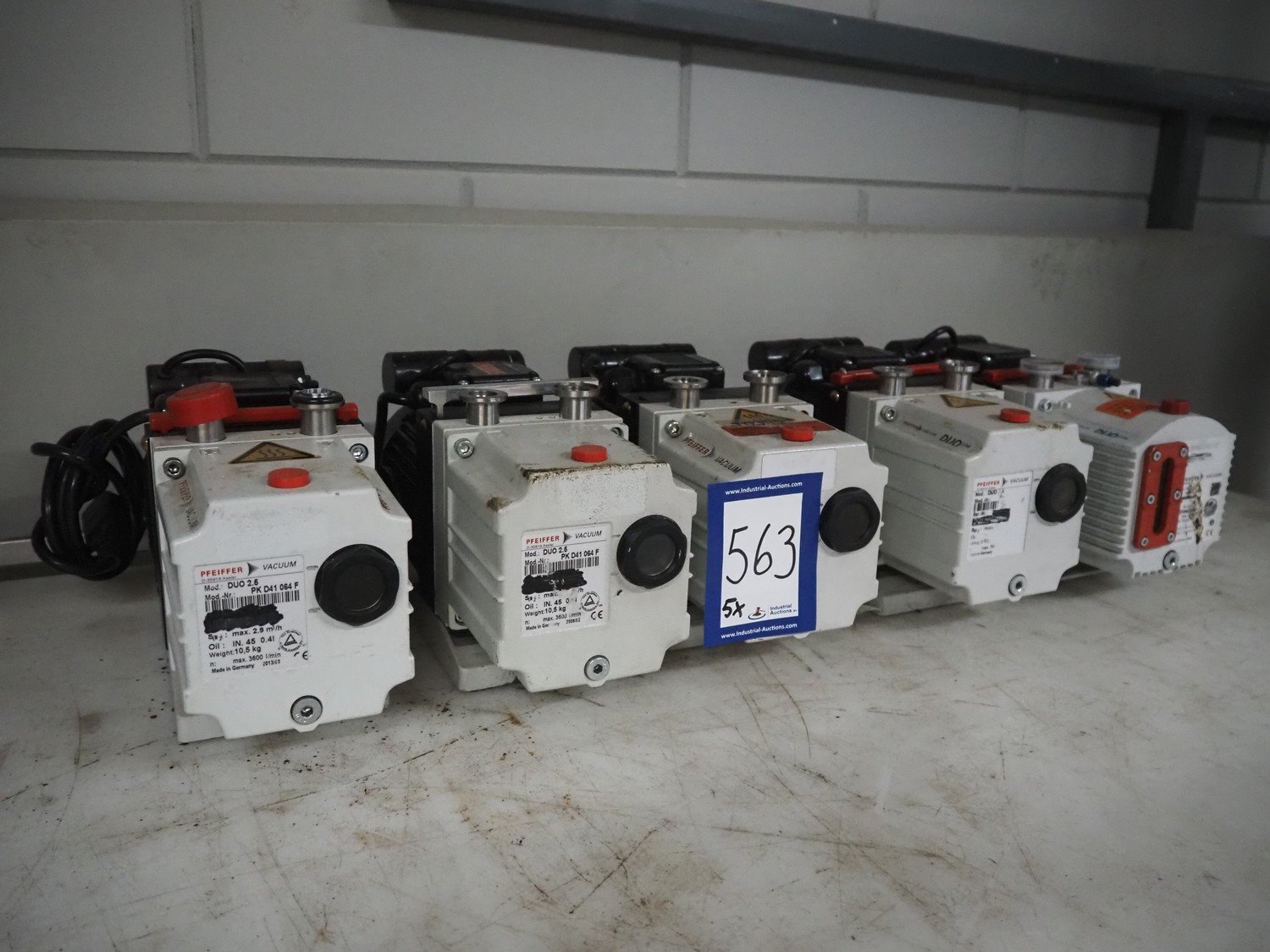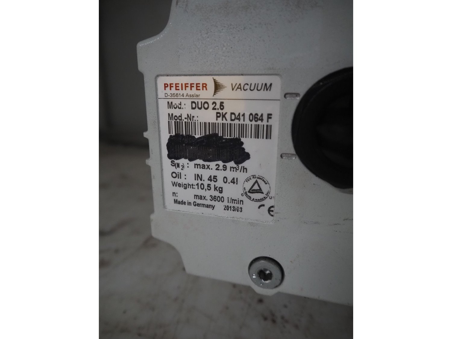 5 Pfeiffer Vacuum pumps, model: DUO 2.5 and DUO 2.6, year of construction: 2018/2013/2006, capacity: 2.9 m³ per hour, weight: 10.5 kg, dimensions: (3x) 310 mm x 120 mm x 190 mm.