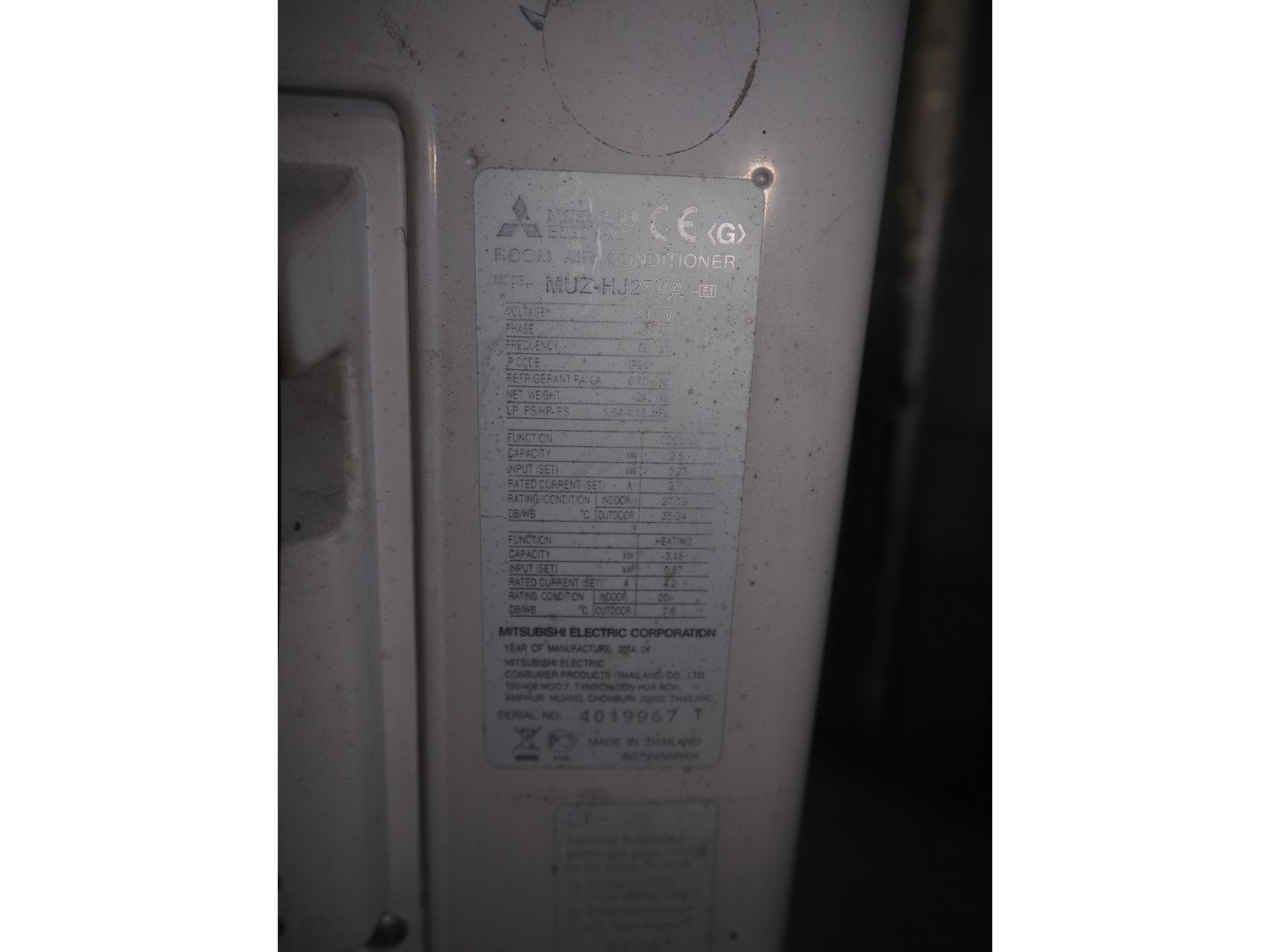 Mitsubishi inside and outside air conditioning unit, type outside unit: MUZ-HJ25VA, 230 V, 50 Hz, dimensions: 800 mm x 300 mm x 230 mm, type inside unit: MSZ-HJJ25VA, serial number: 3005070, year of construction: 2013, 230 V, 50 Hz, refrigerant: R410A, dimensions: 700 mm x 270 mm x 530 mm.