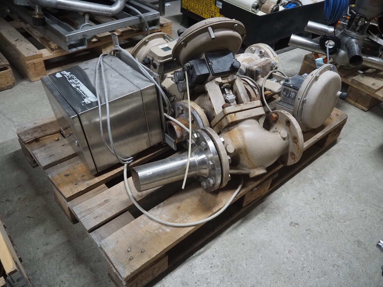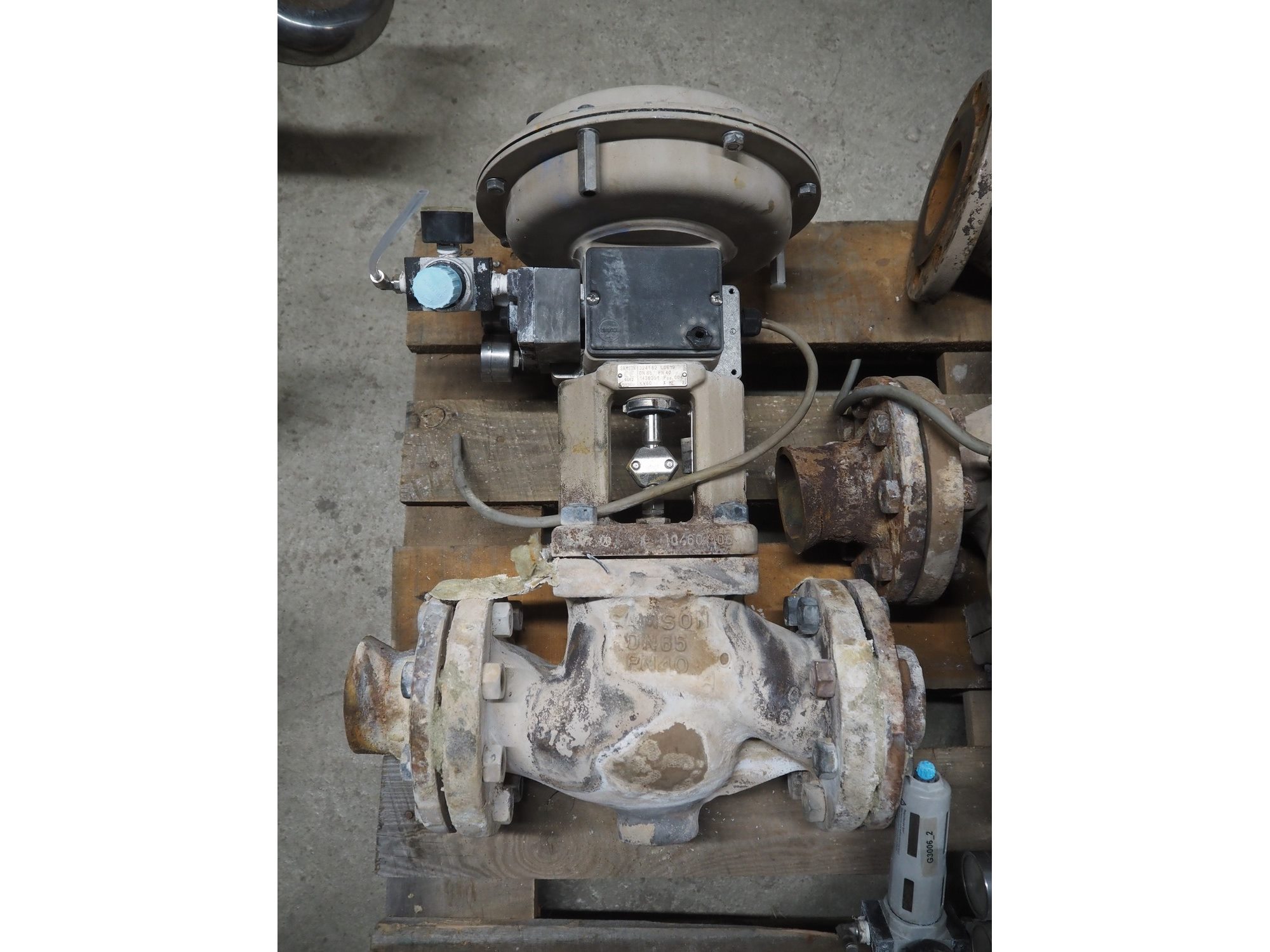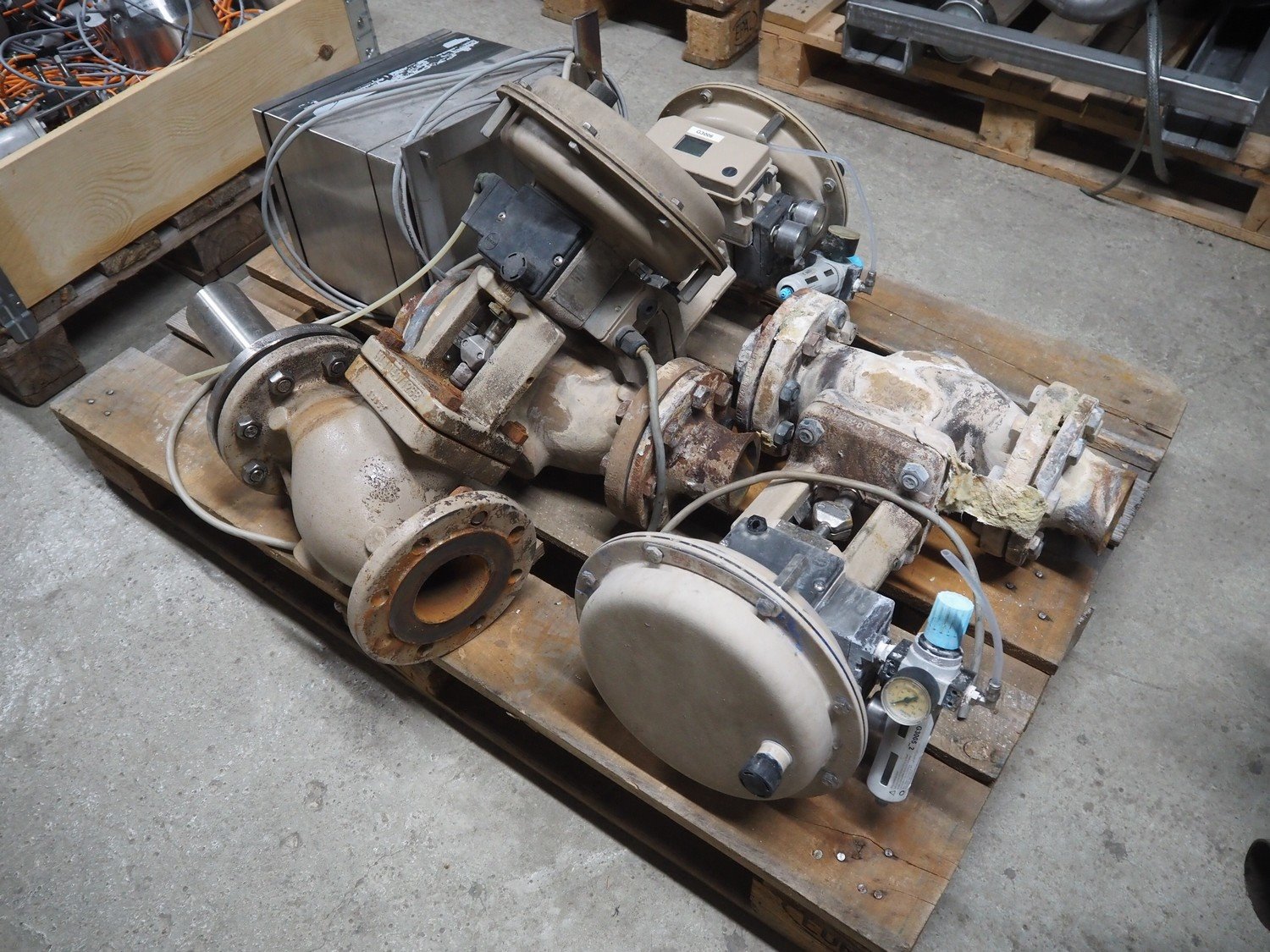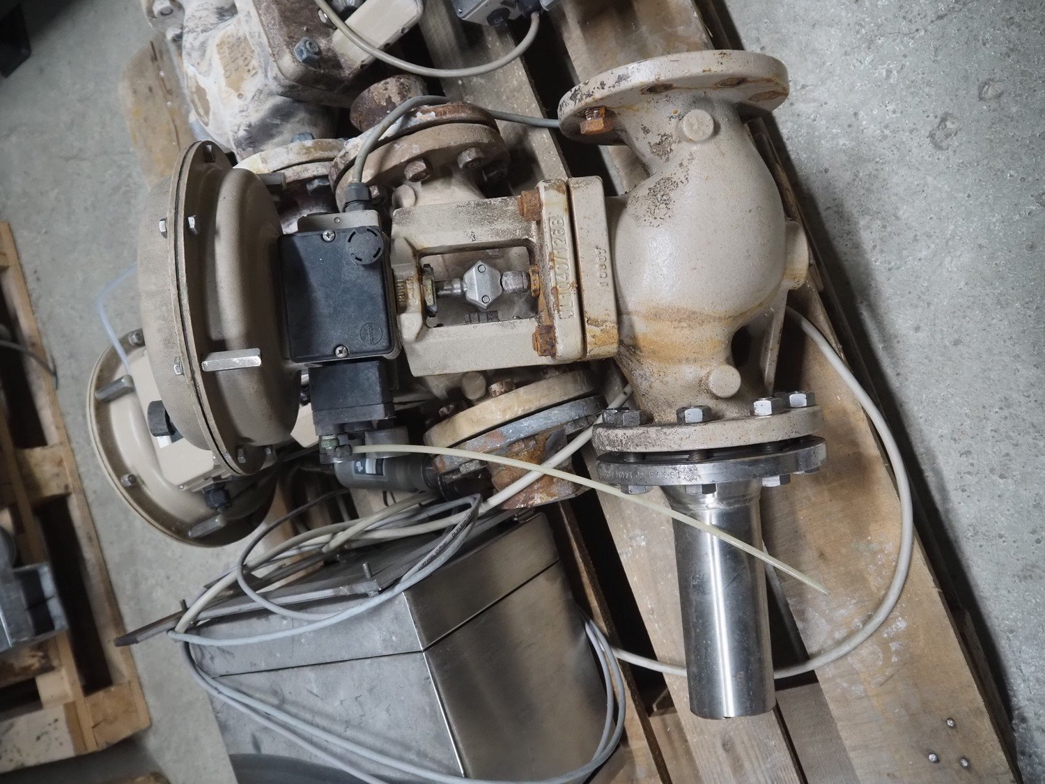 Pallet with 3 Samson valves, type: 3277, dimensions: 1200 mm x 800 mm x 500 mm.