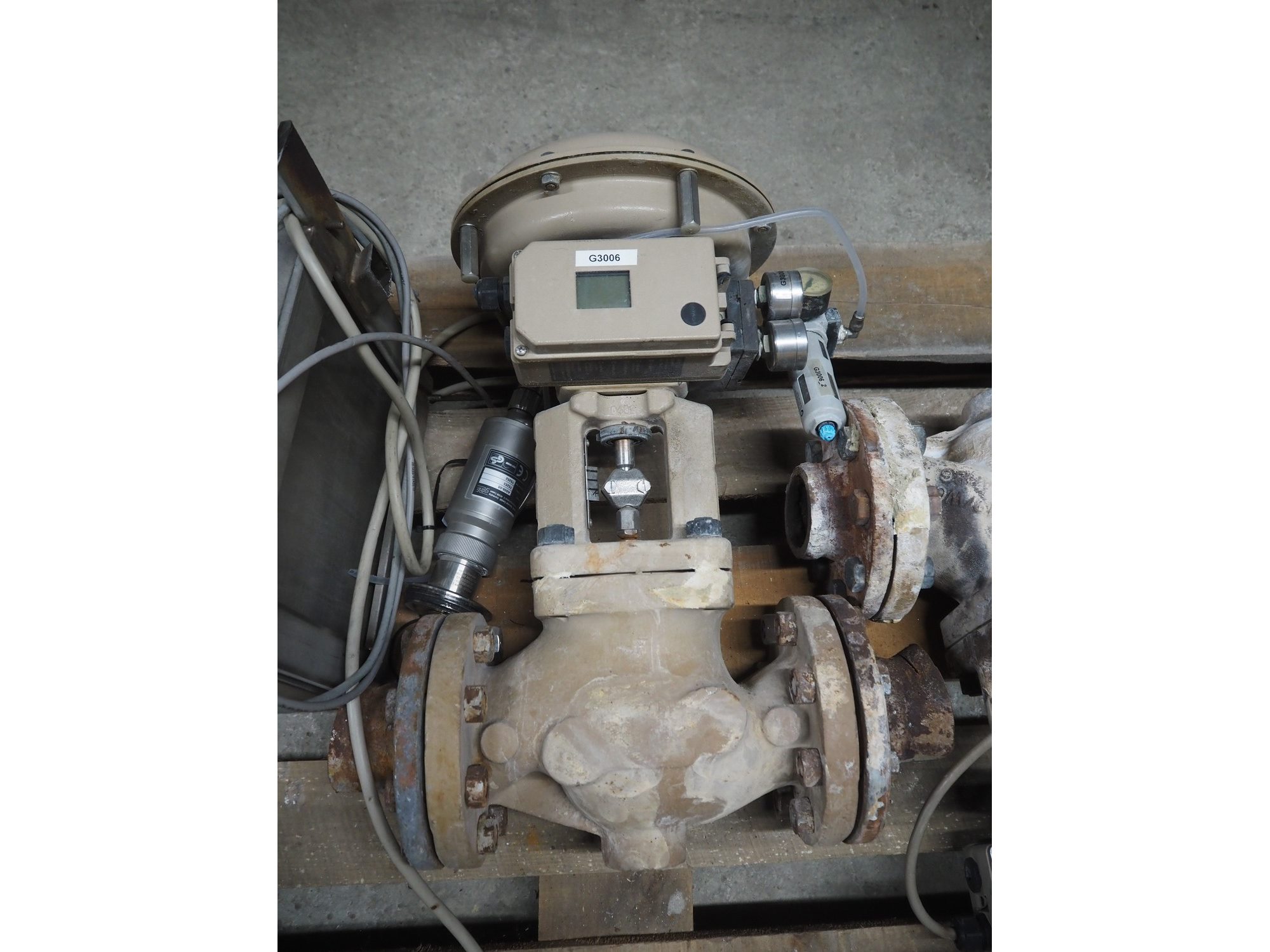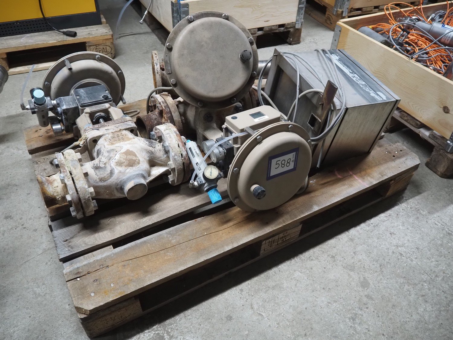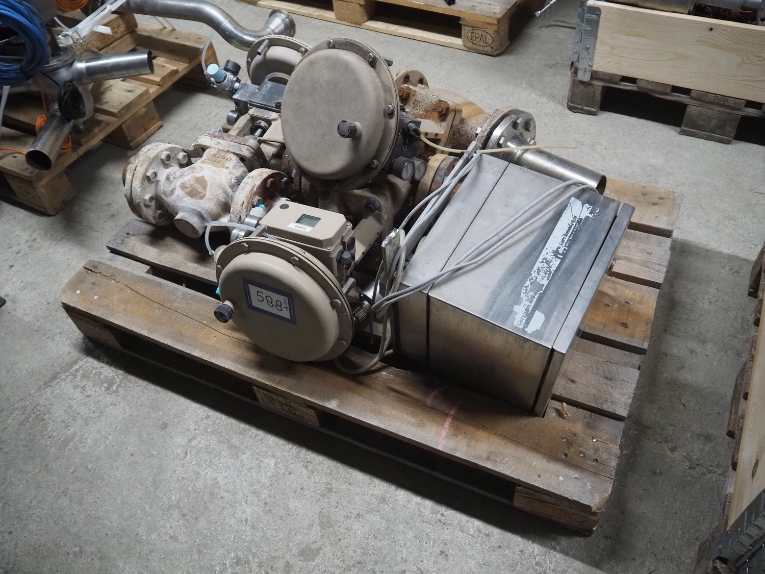 Pallet with 3 Samson valves, type: 3277, dimensions: 1200 mm x 800 mm x 500 mm.