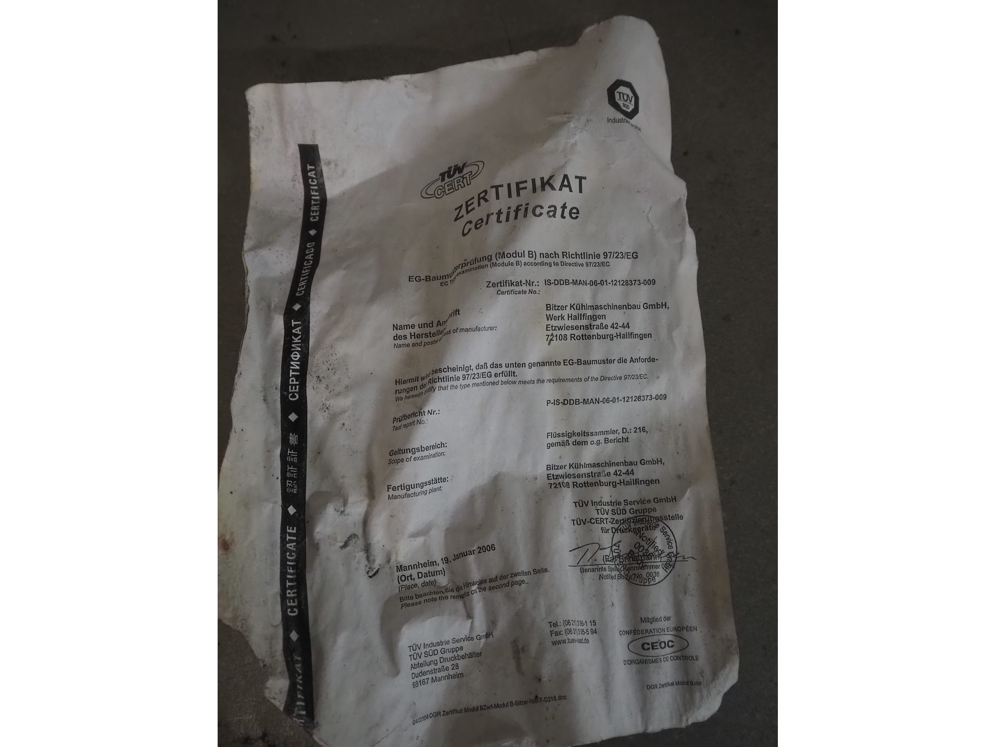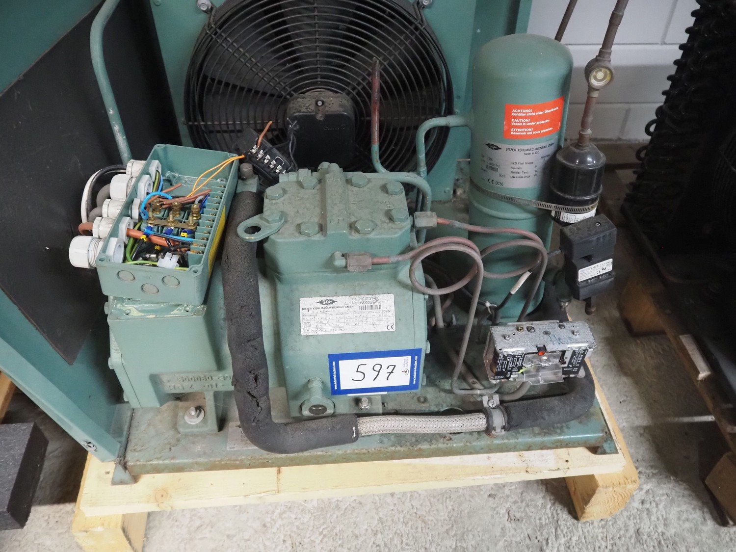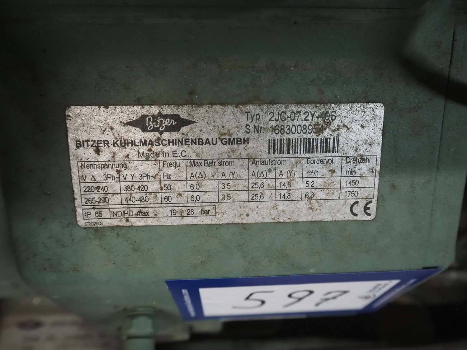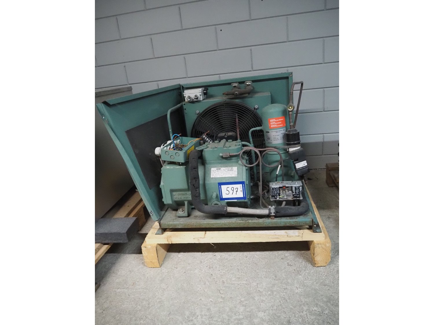 Bitzer Kühlmaschinenbau GmbH condensing unit with Bitzer Kühlmaschinenbau GmbH cooling compressor, type cooling compressor: 2JC-07.2Y-40S, serial number: 1683008954, capacity: 5.2/6.3 m³ per hour, dimensions: 670 mm x 500 mm x 570 mm.