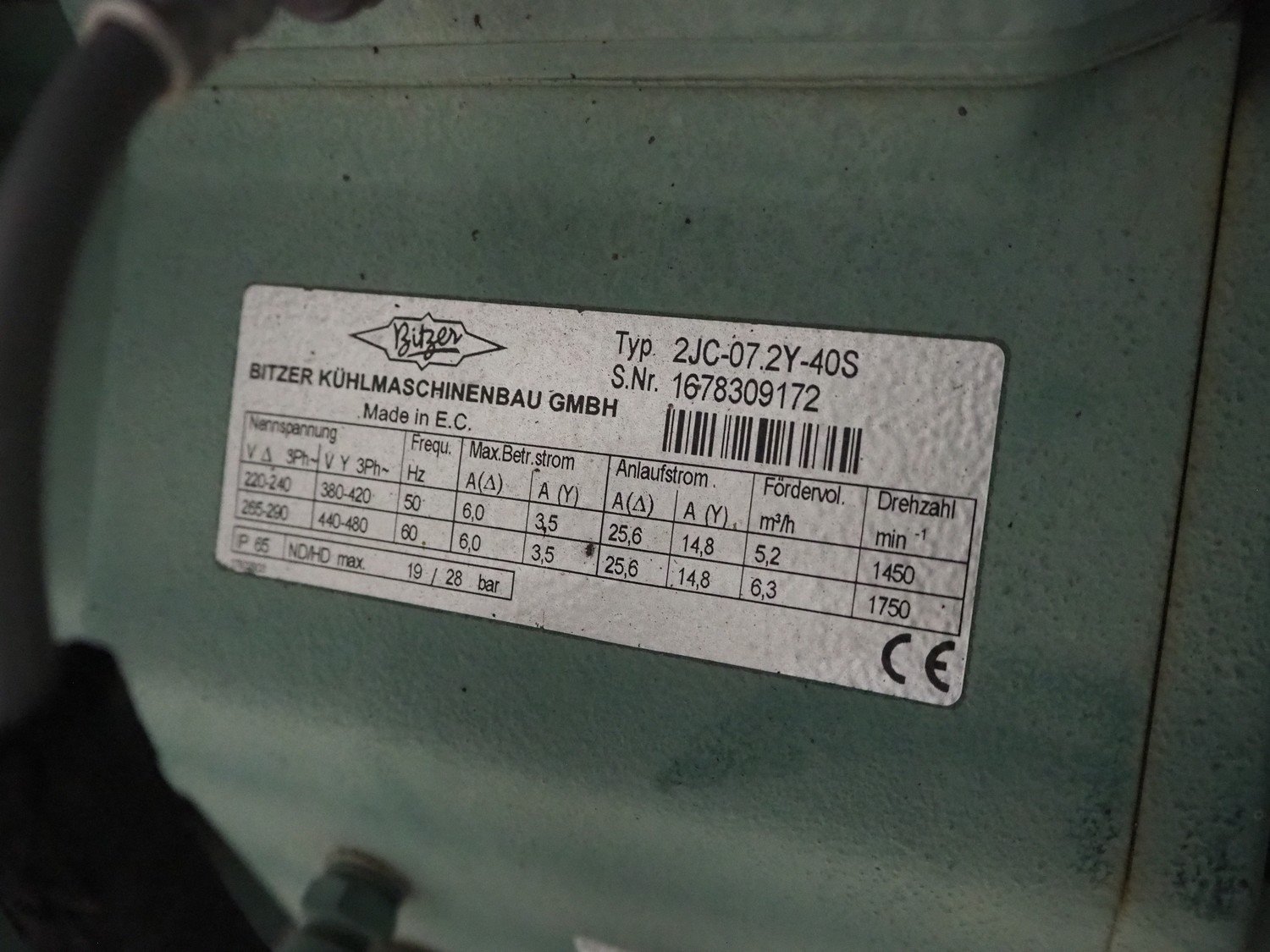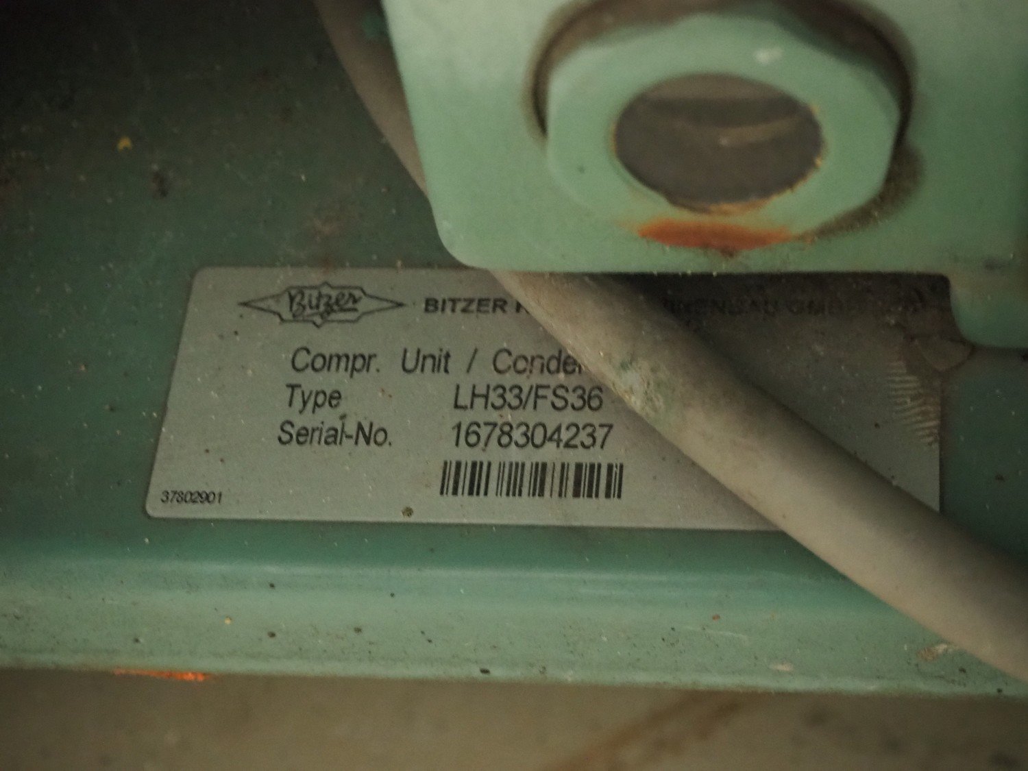 Bitzer Kühlmaschinenbau GmbH condensing unit with cooling compressor, type condensing unit: FS36, serial number: 1678304237, type cooling compressor: 2JC-07.2Y-40S, serial number: 1678309172, capacity: 5.2/6.3 m³ per hour, dimensions: 680 mm x 900 mm x 635 mm.