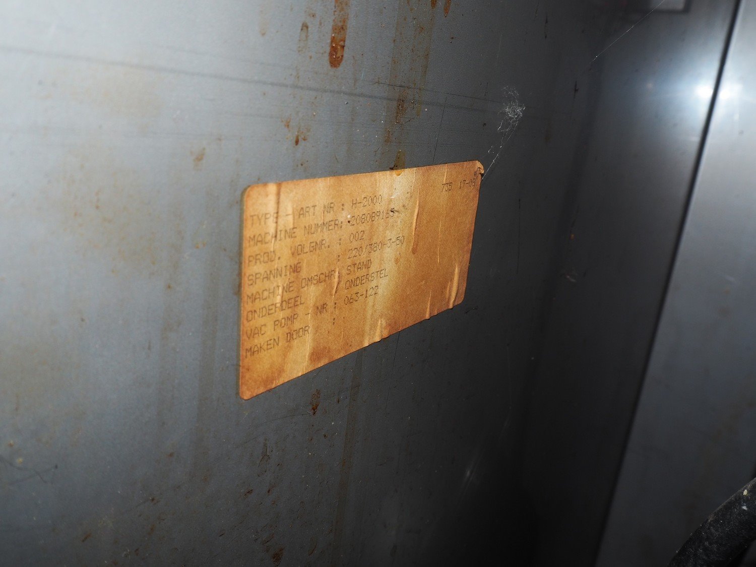 Henkovac mobile vacuum machine, type: H-2000, machine number: 208089165, 220/380 V, 3 Ph, 50 Hz, seal length: (2x) 505 mm, chamber dimensions: 510 mm x 610 mm, Busch vacuum pump, type: 063-122, capacity: 63 m³ per hour, total dimensions: 650 mm x 680 mm x 1080 mm.