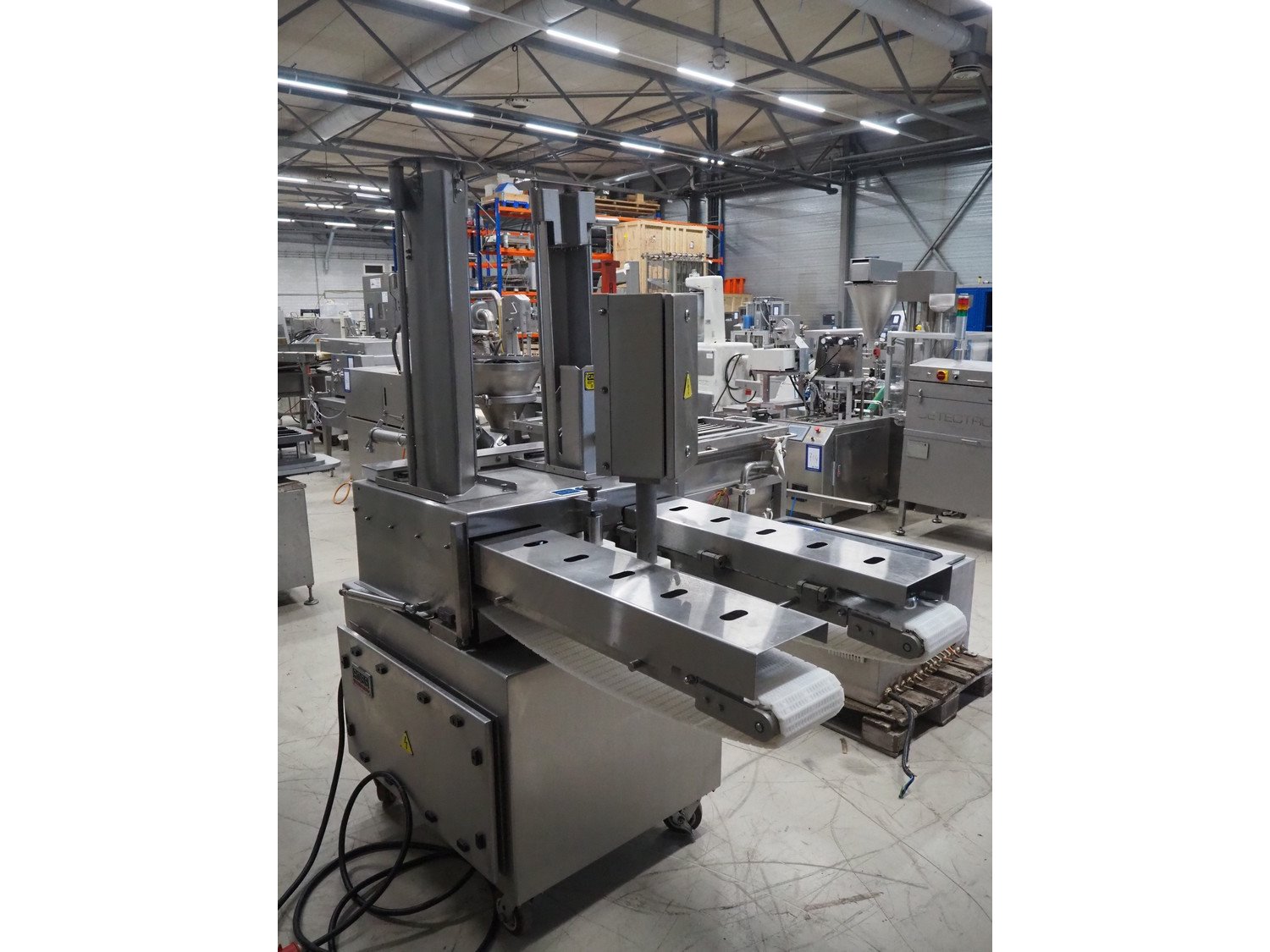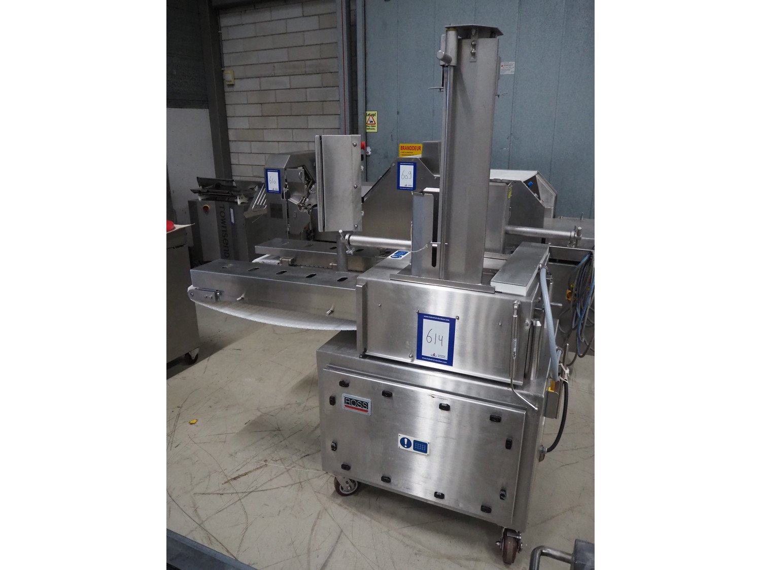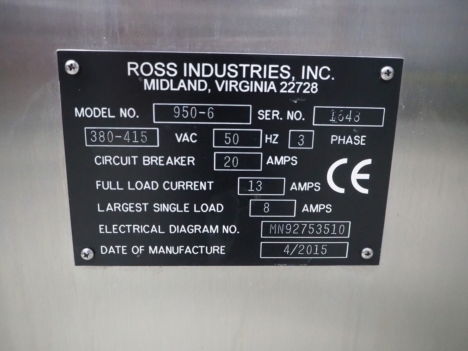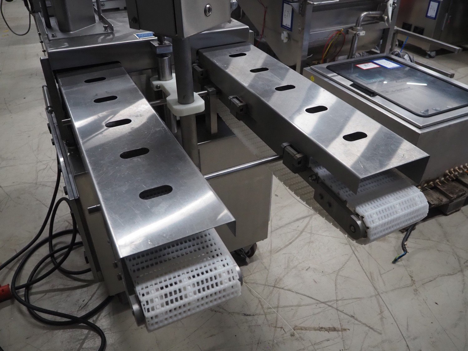 Ross Industries, Inc. mobile slicer, model: 950-6, serial number: 1648, year of construction: 4/2015, 380/415 V, 3 Ph, 50 Hz, 20/13/8 A, plastic mesh belts, belt width: (2x) 180 mm, total dimensions: 1660 mm x 800 mm x 1660 mm. Including extra knife and parts.