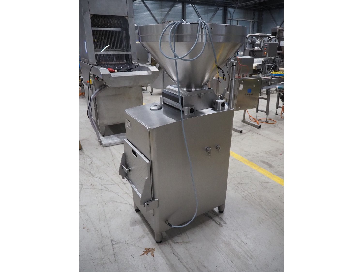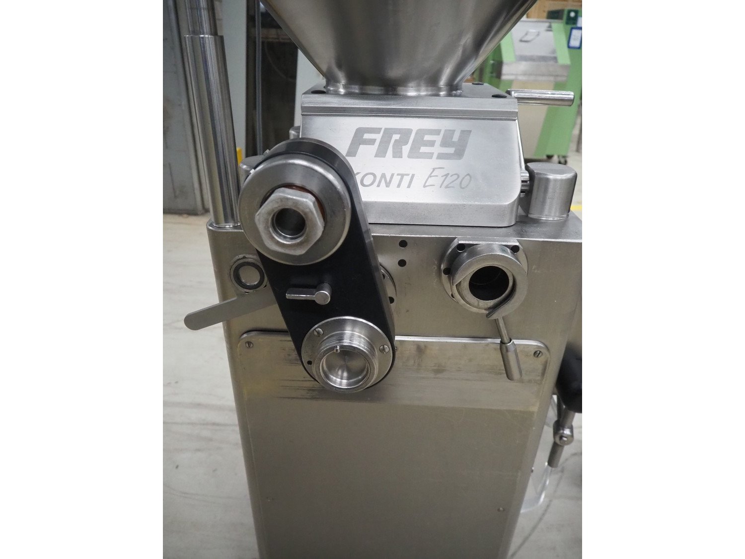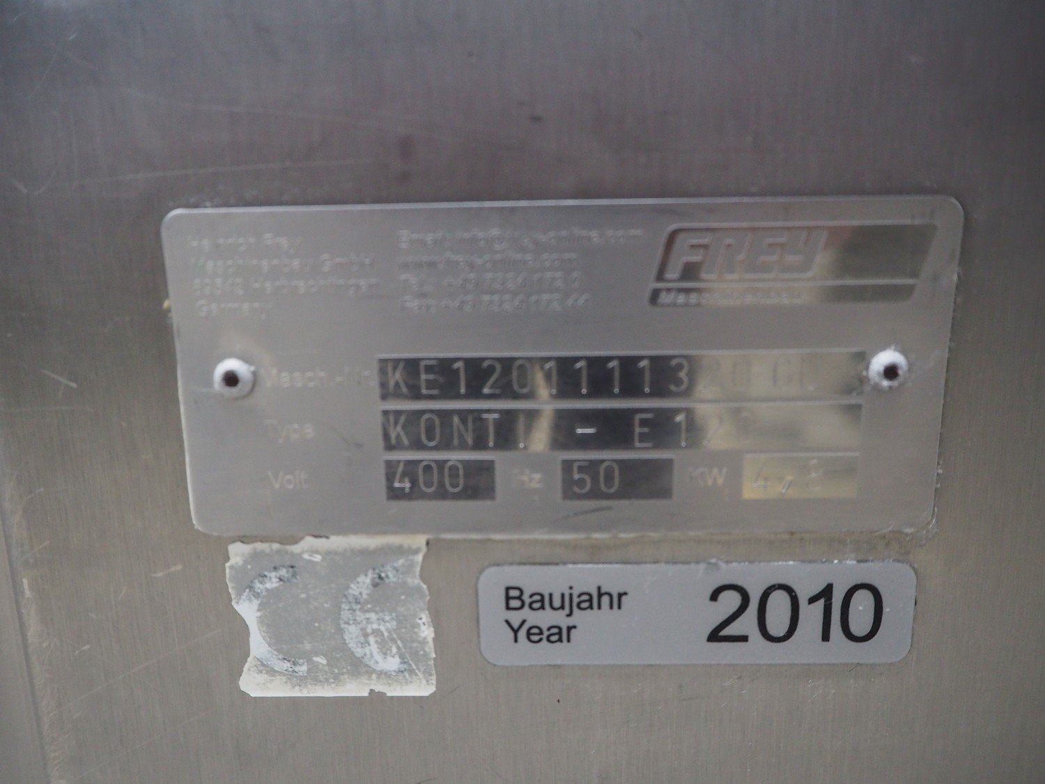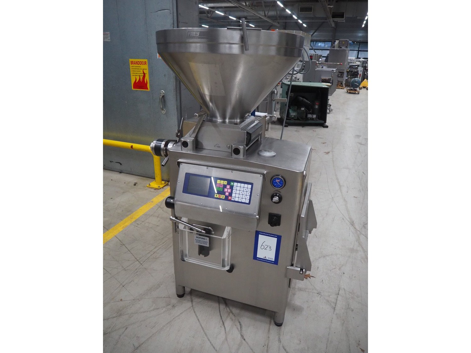 Frey vacuum filling machine with linking attachment, type: Konti-E120, machine number: KE1201111320GU, year of construction: 2010, 400 V, 50 Hz, 4.8 kW, Busch vacuum pump, operating hours: 28406, dimensions: 950 mm x 700 mm x 1620 mm.
