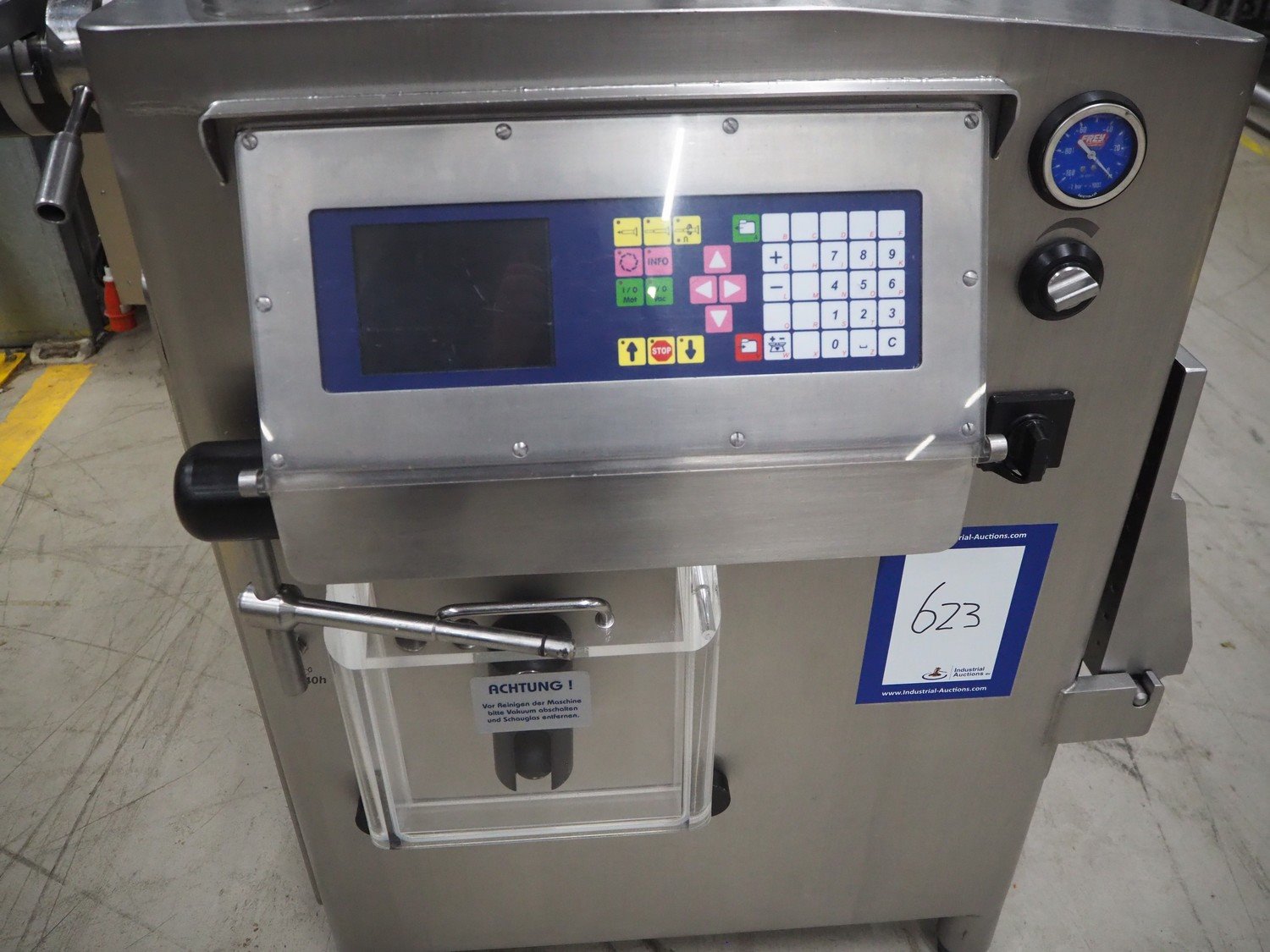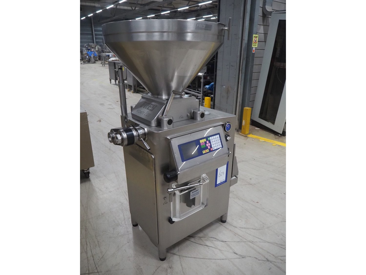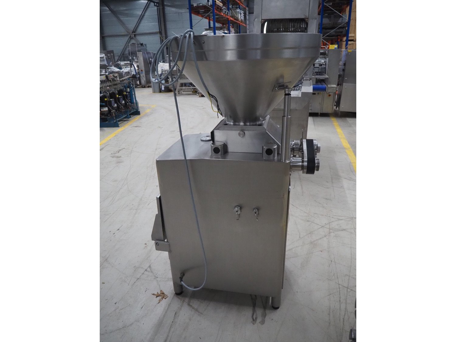 Frey vacuum filling machine with linking attachment, type: Konti-E120, machine number: KE1201111320GU, year of construction: 2010, 400 V, 50 Hz, 4.8 kW, Busch vacuum pump, operating hours: 28406, dimensions: 950 mm x 700 mm x 1620 mm.