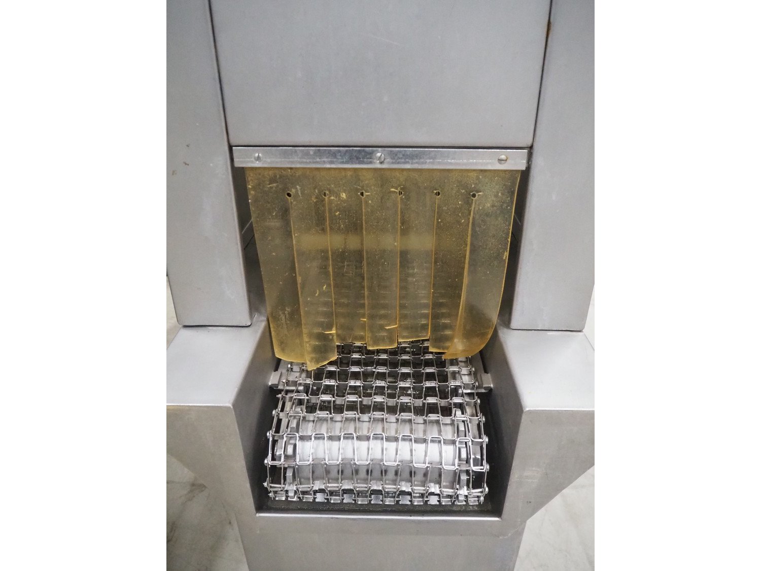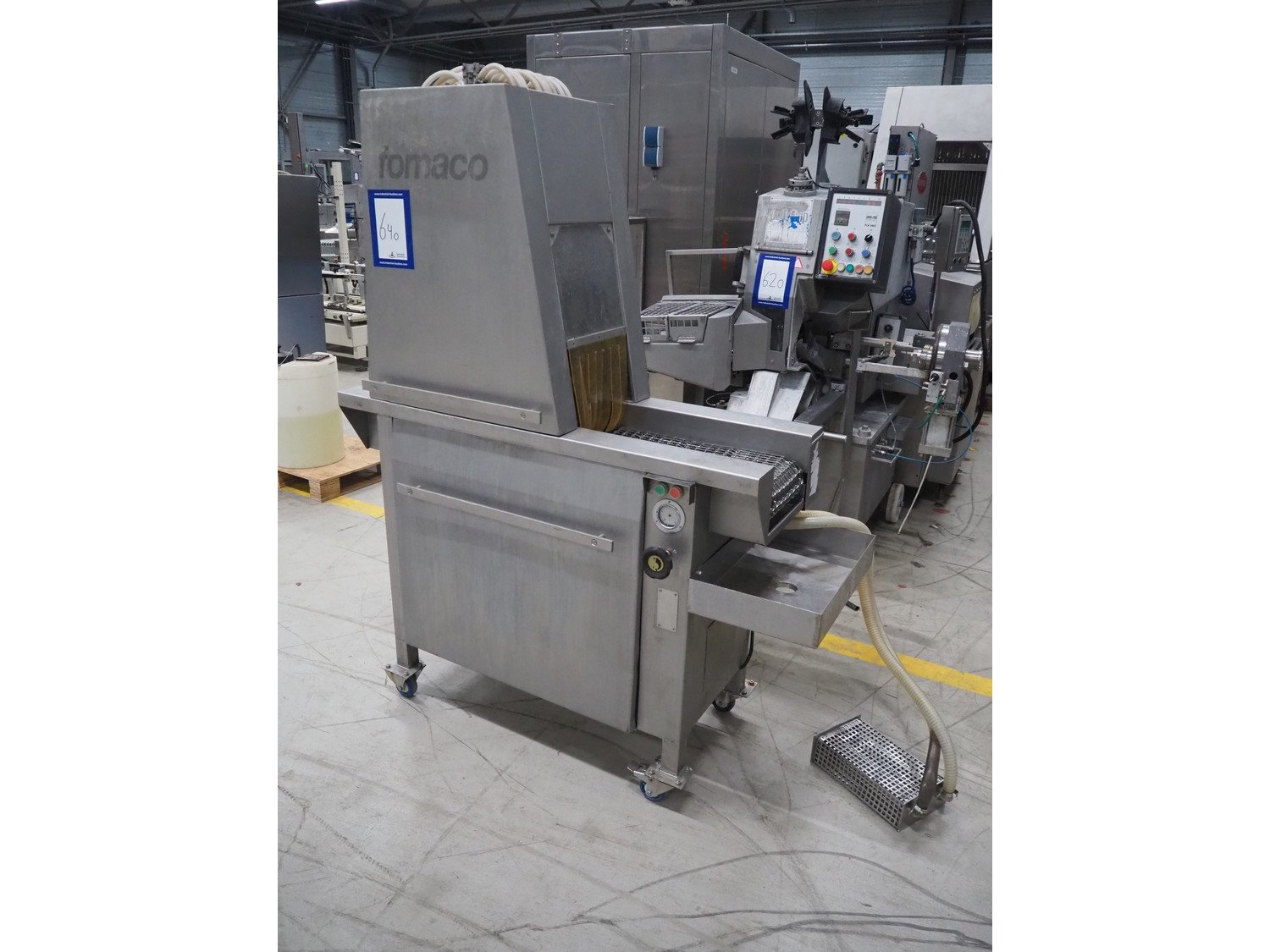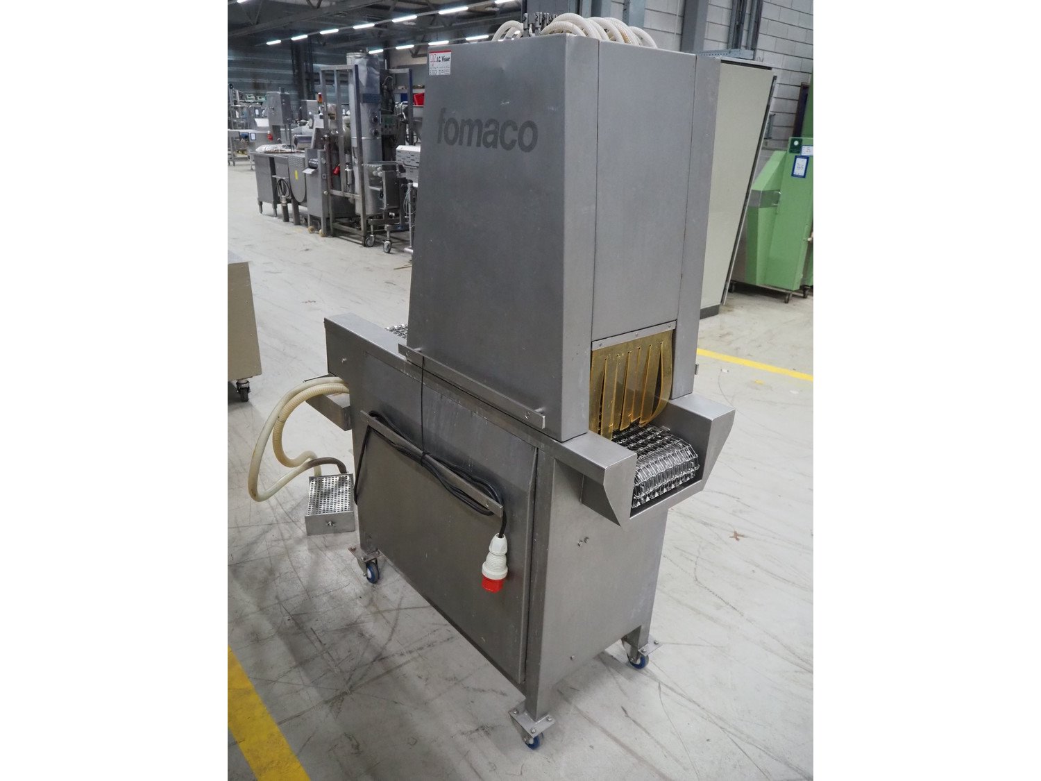 Fomaco Food Machinery Company A/S mobile injector, model: FGM 20 40, machine number: 3520 1986, s/s mesh belt, belt width: 235 mm, clearance: 280 mm x 240 mm, total dimensions: 1450 mm x 580 mm x 1880 mm.