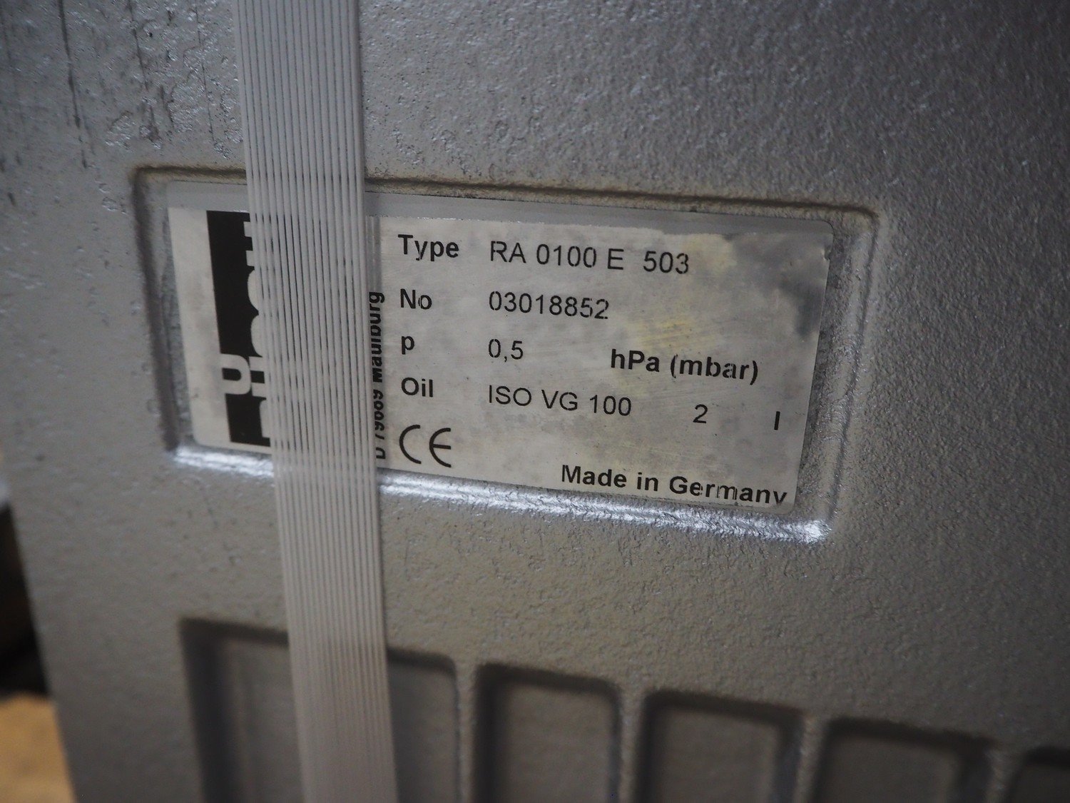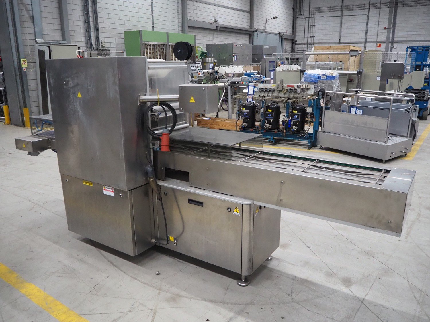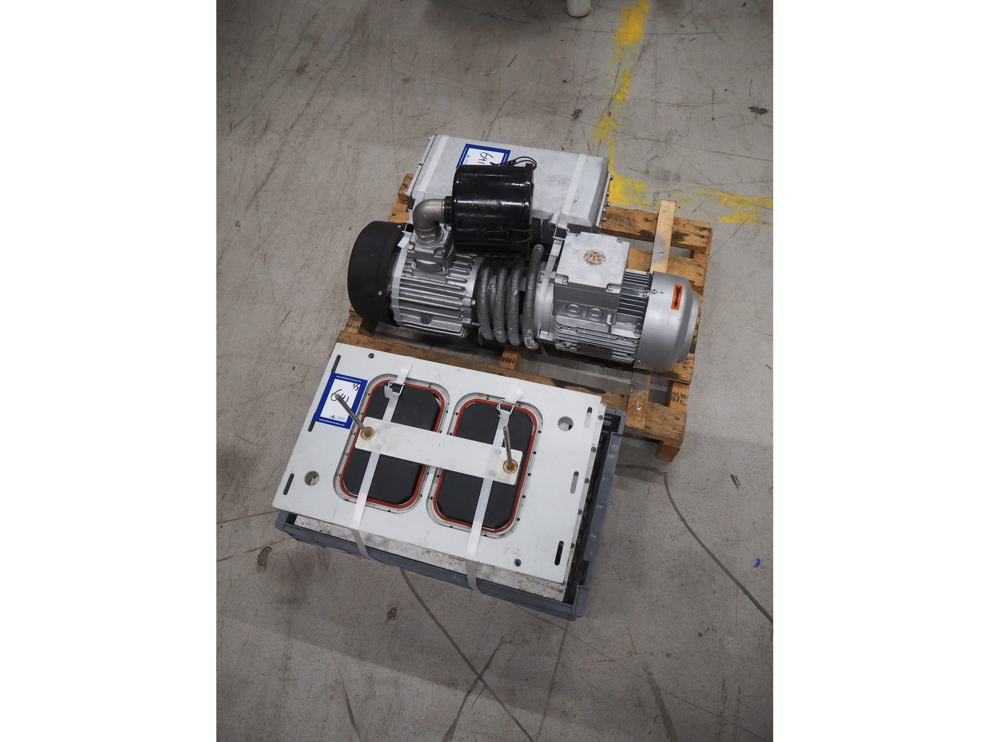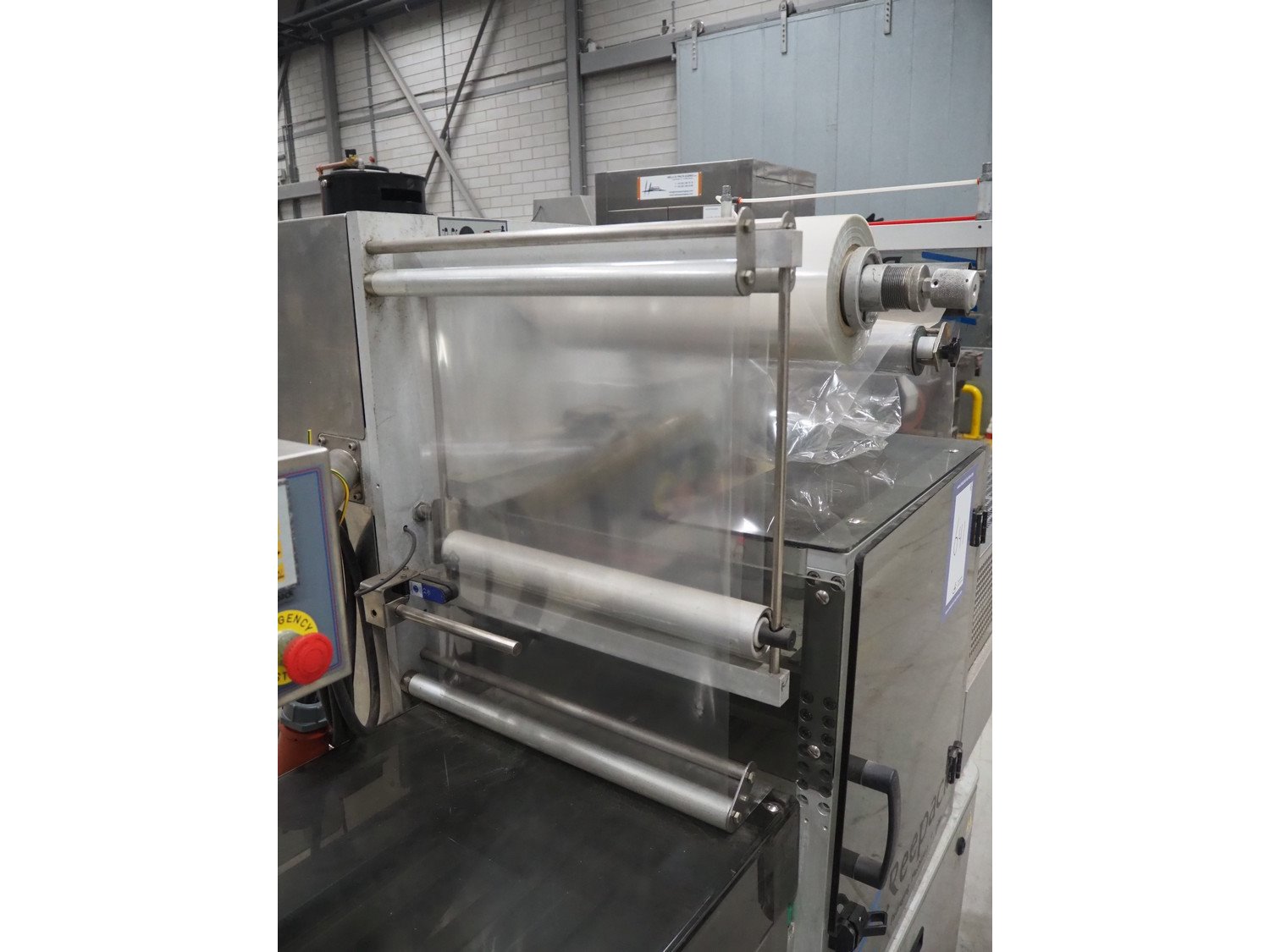 Reepack traysealer, model: Reeflex, serial number: 0402025, year of construction: 2002, 400 V, 3 Ph, 50 Hz, 21 A, s/s chain and pin conveyor, belt width: 360 mm, distance between dividers: 440 mm, divider height: 20 mm, 2 lanes, lane width: 140 mm, film width: 400 mm, dimensions dyes: (2x) 220 mm x 140 mm, plastic outfeed belt, belt width: 420 mm, total dimensions: 3550 mm x 900 mm x 1750 mm. With additional dye, dimensions dye: (2x) 220 mm x 140 mm, and Busch vacuum pump, type: RA 0100 E 503, number: 03018852.