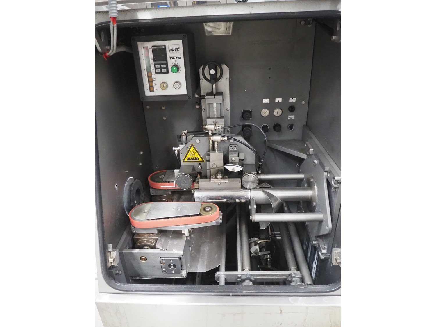 Poly-clip System GmbH & Co. KG automatic clipping and sealing machine, type: TSA 120 HS, number: 142, year of construction: 1999, 400 V, 50 Hz, 16 A, air pressure: 5/7 bar, dimensions: 1400 mm x 980 mm x 1660 mm.