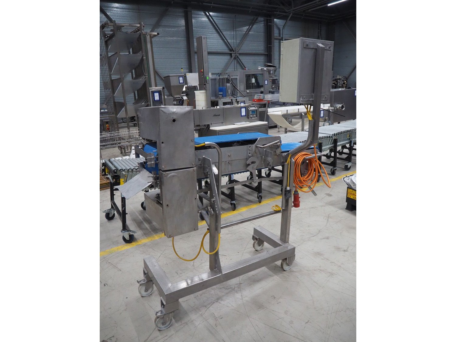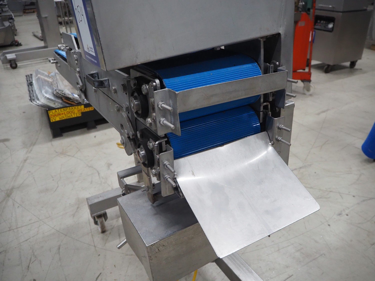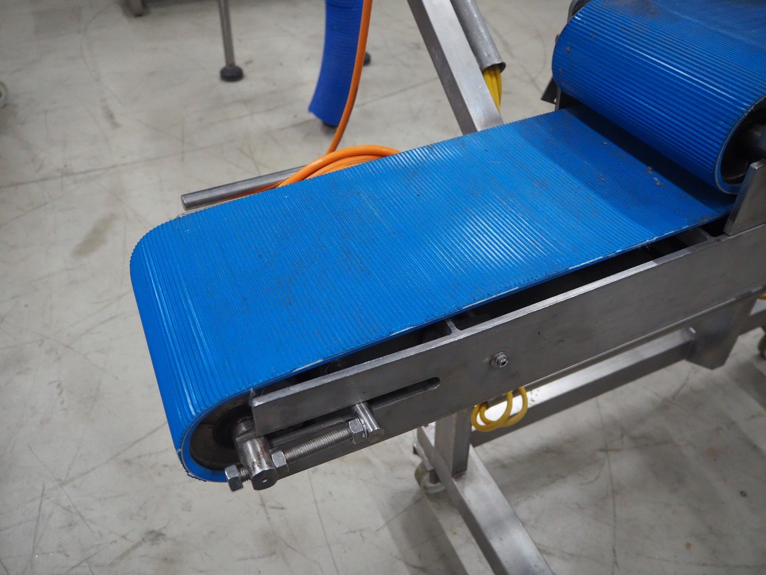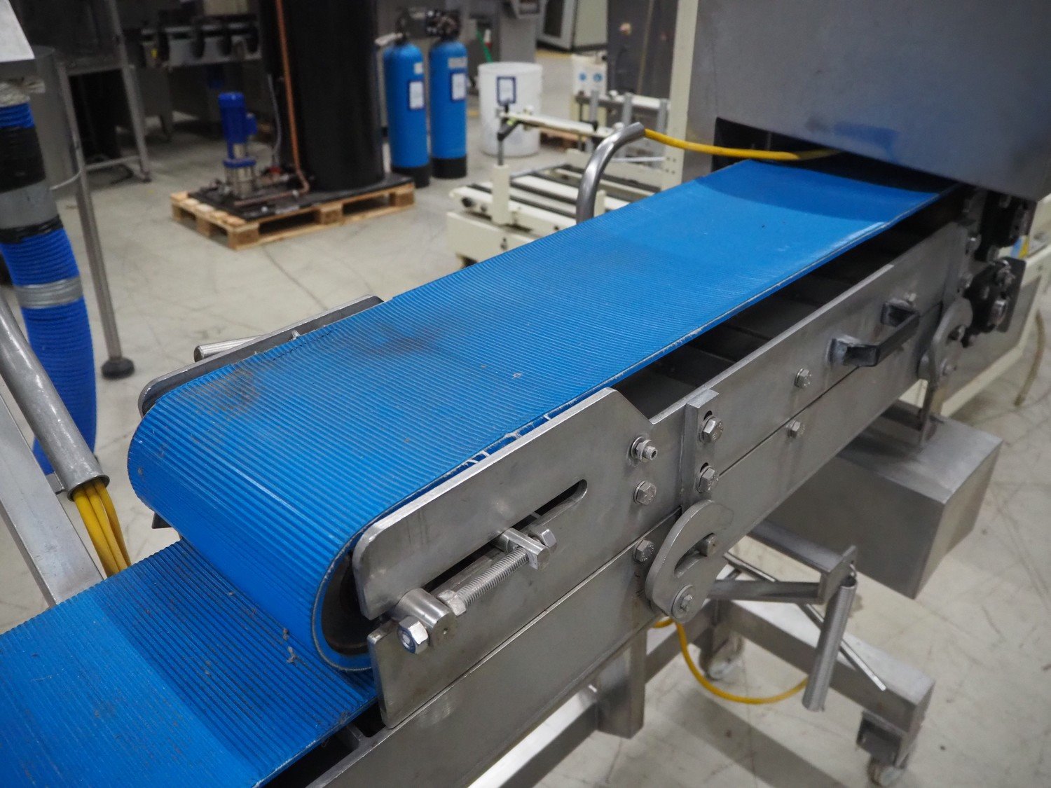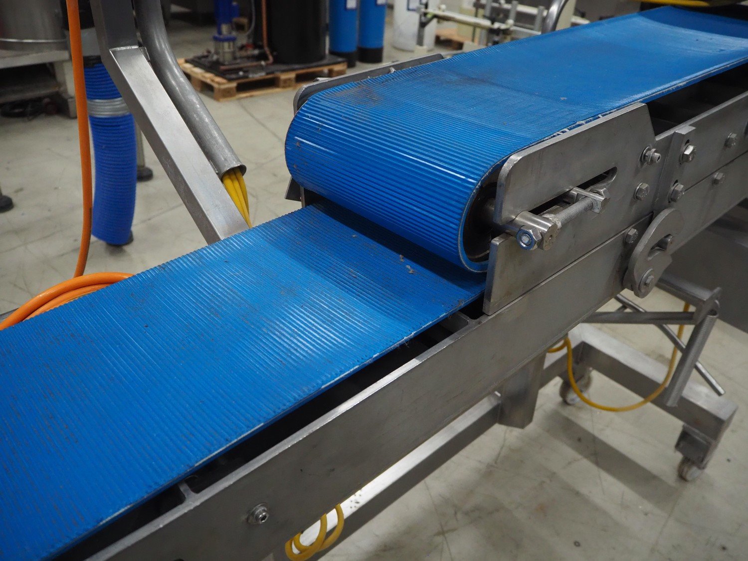 Mobile flattener, plastic belts, belt width: 250 mm, total dimensions: 1800 mm x 650 mm x 1910 mm.