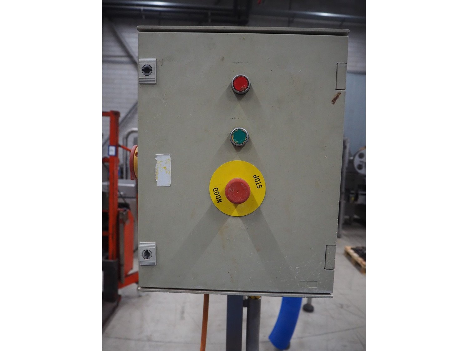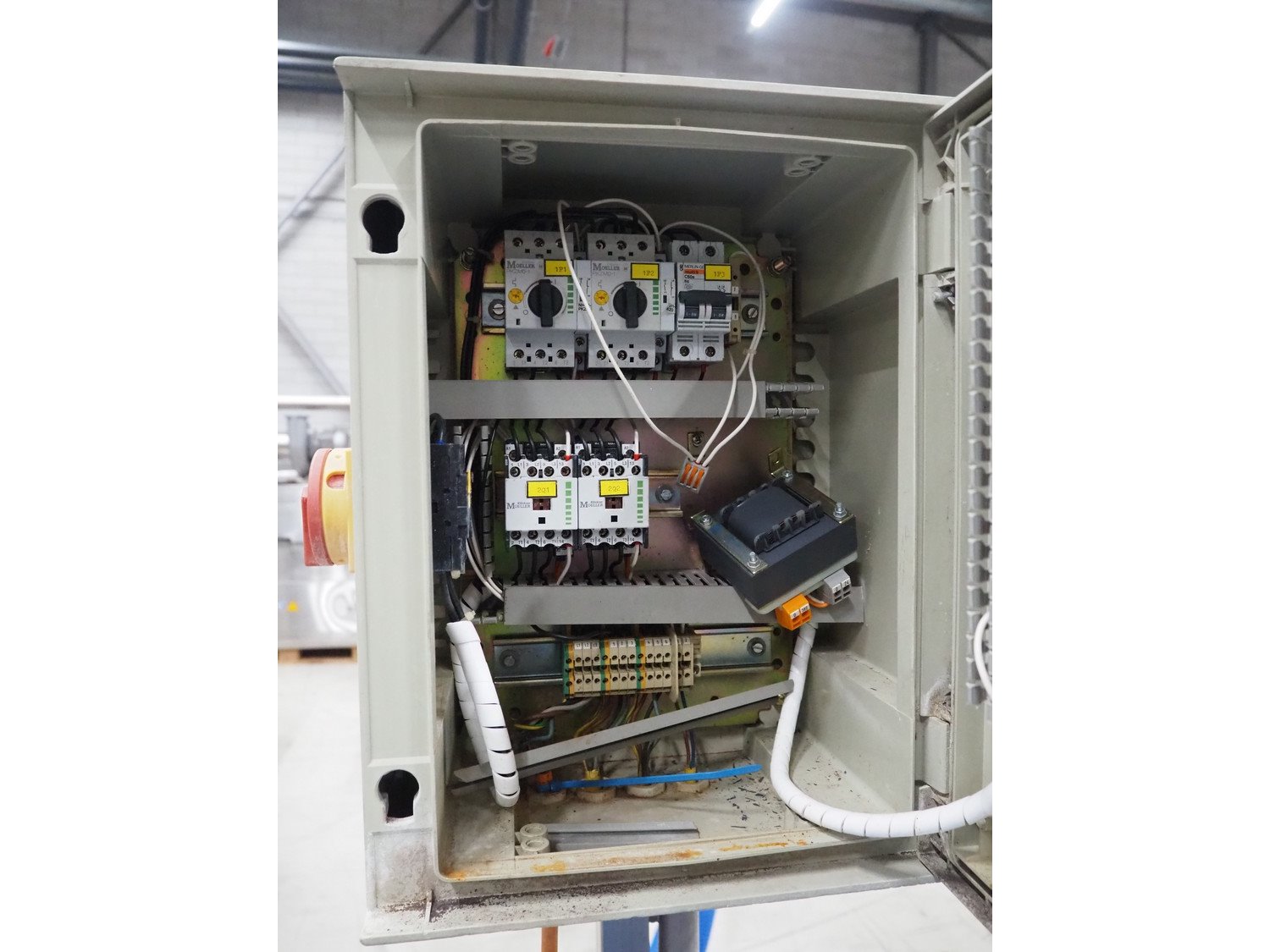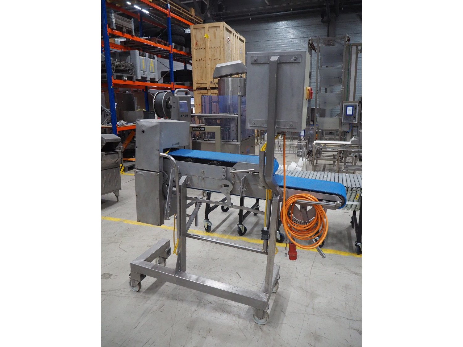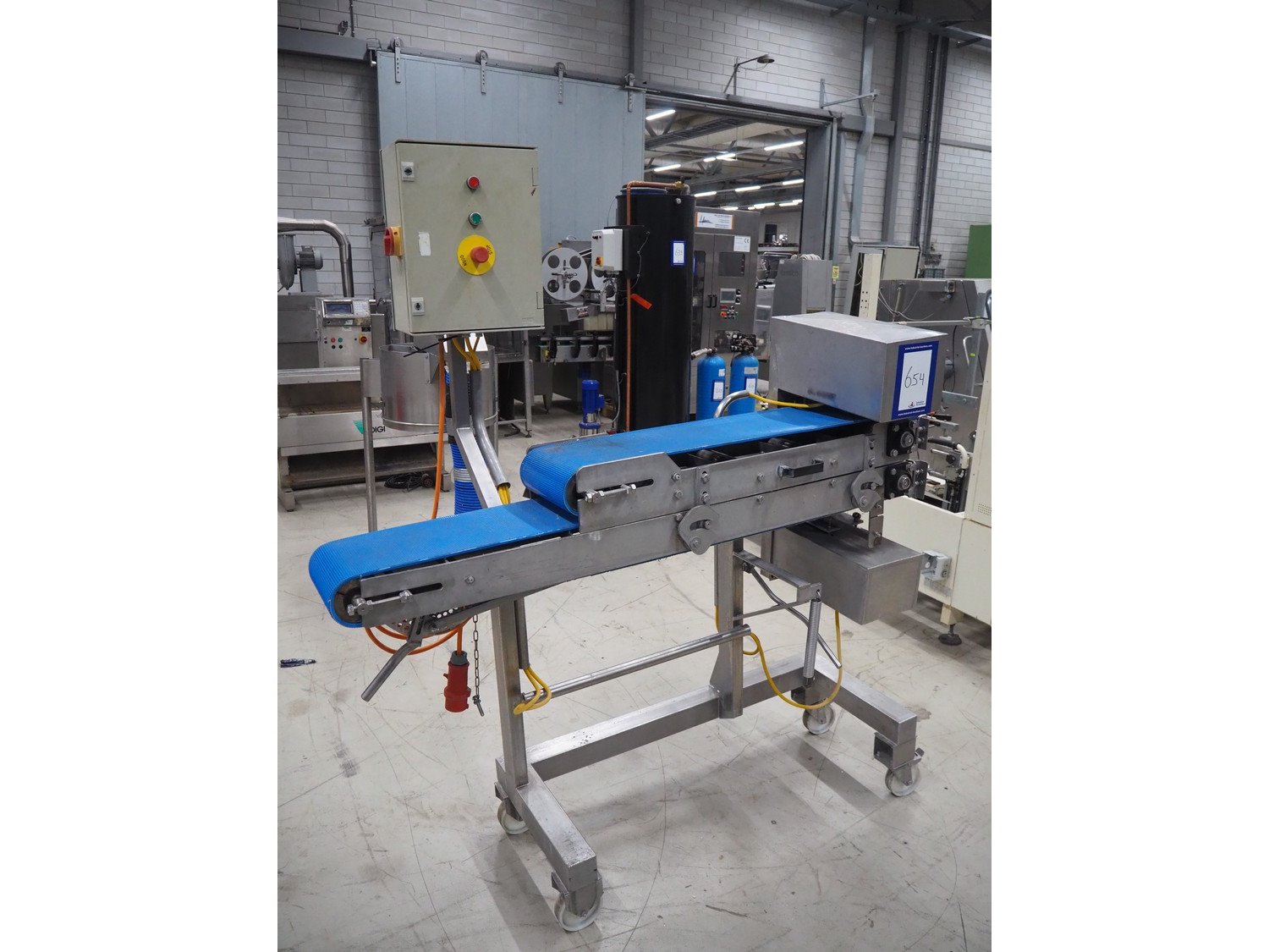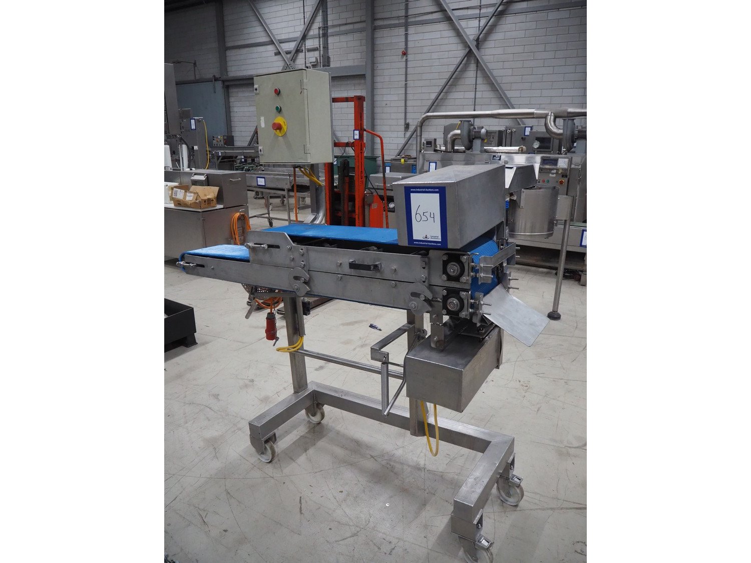 Mobile flattener, plastic belts, belt width: 250 mm, total dimensions: 1800 mm x 650 mm x 1910 mm.