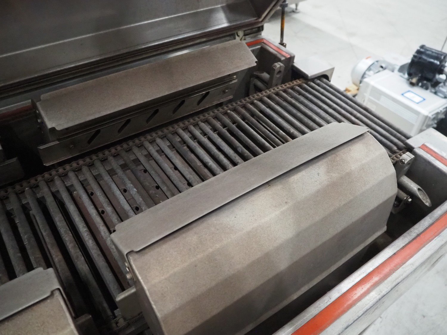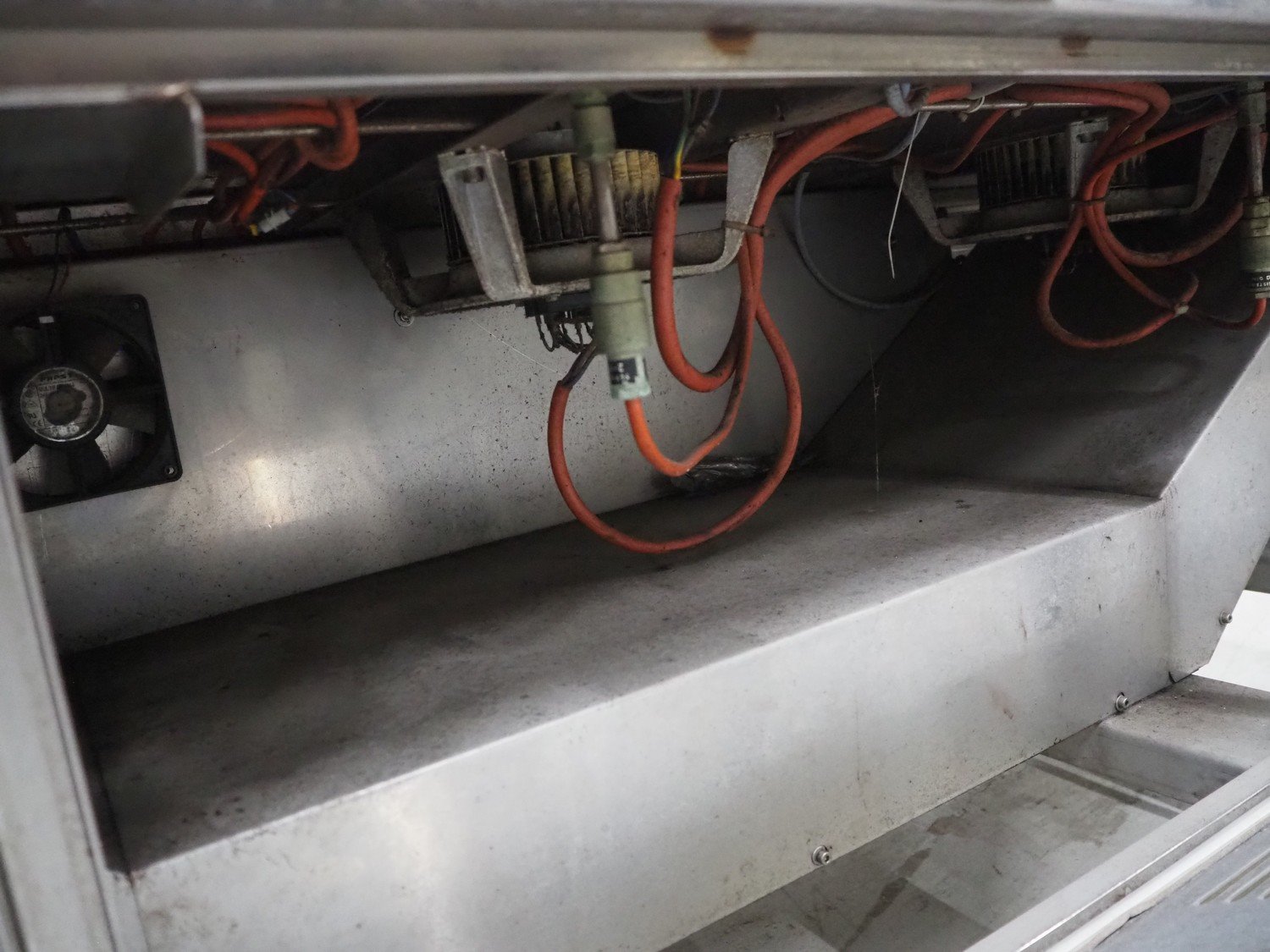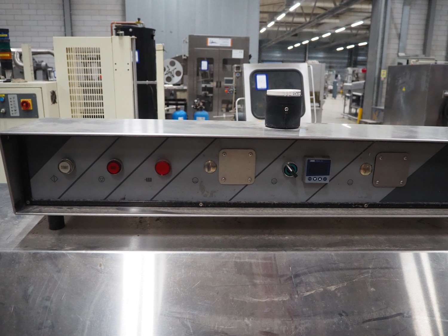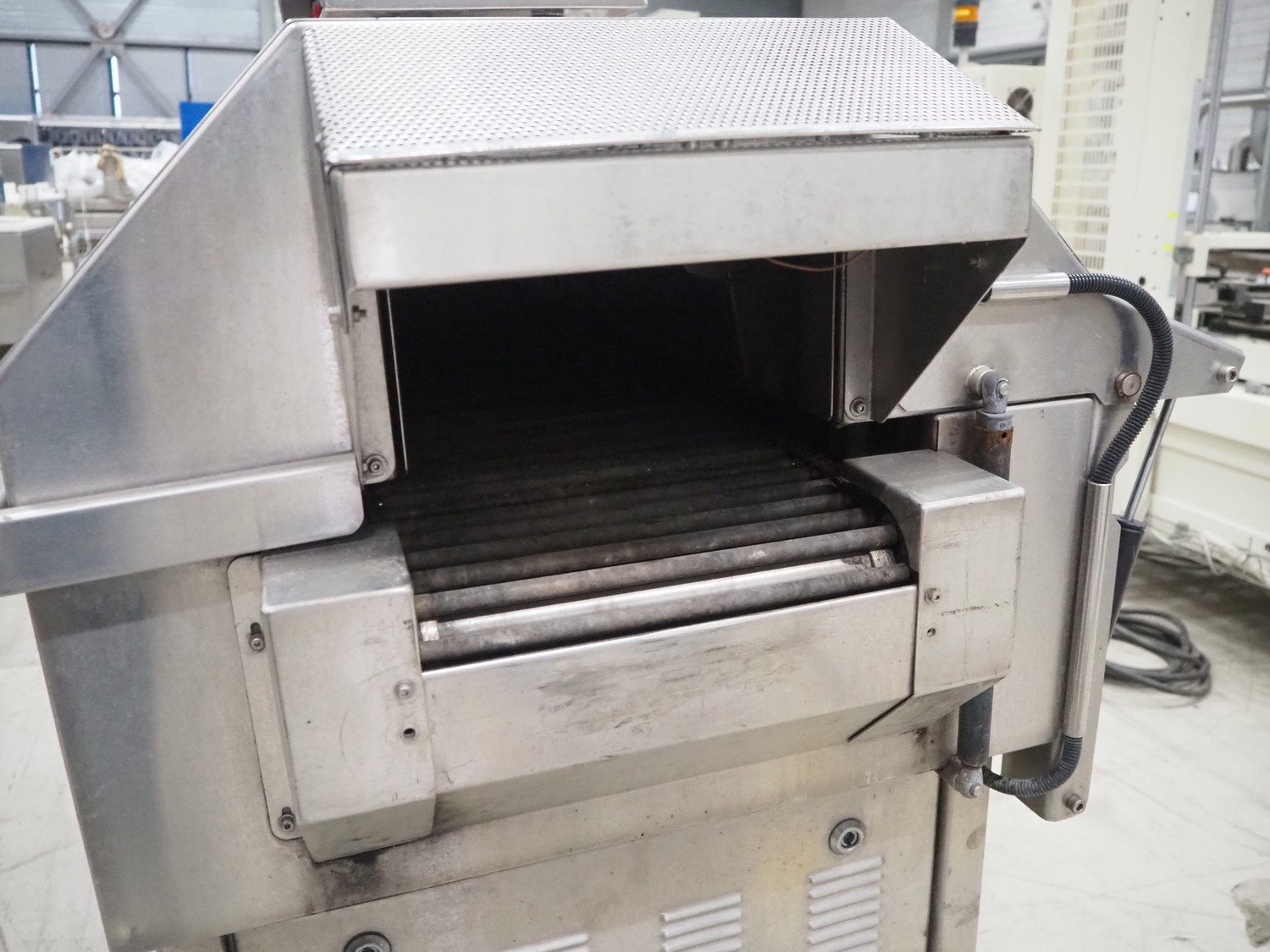 Cryovac shrink tunnel, model: CJ51T LH, serial number: 03103, year of construction: 1995, 380 V, 50 Hz, 23 A, 15 kW, roller belt, belt width: 280 mm, clearance: 280 mm x 150 mm, total dimensions: 2100 mm x 880 mm x 1450 mm.
