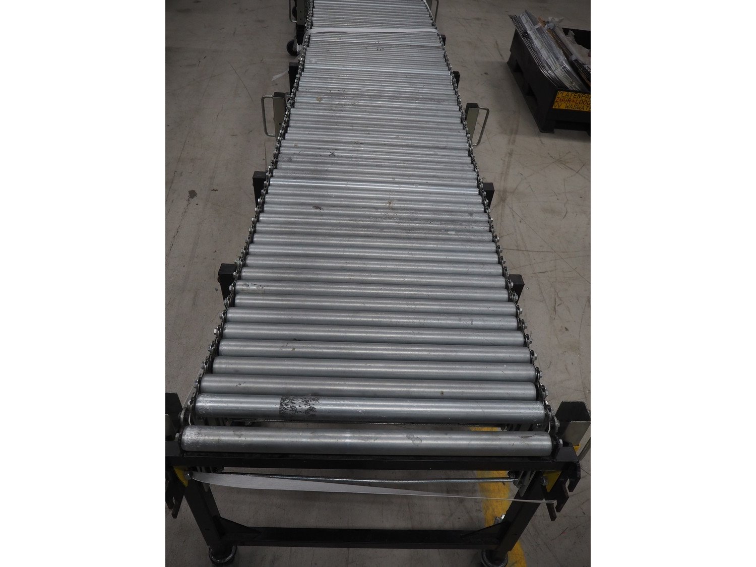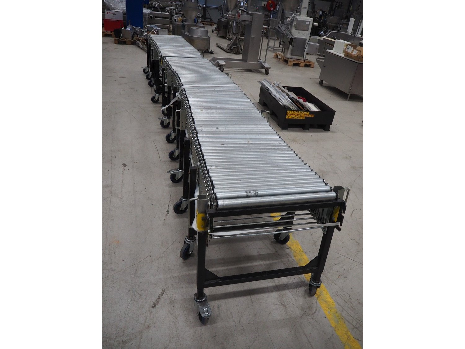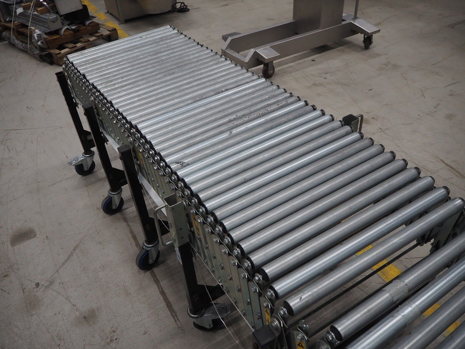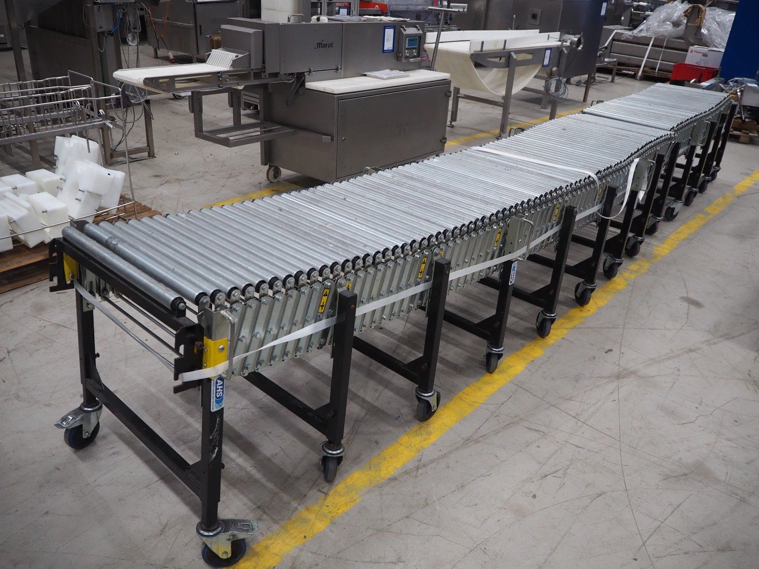 AHS mobile extendable roller conveyor, s/s rollers, roller width: 600 mm, total dimensions: 13500 mm x 870 mm x 830 mm.