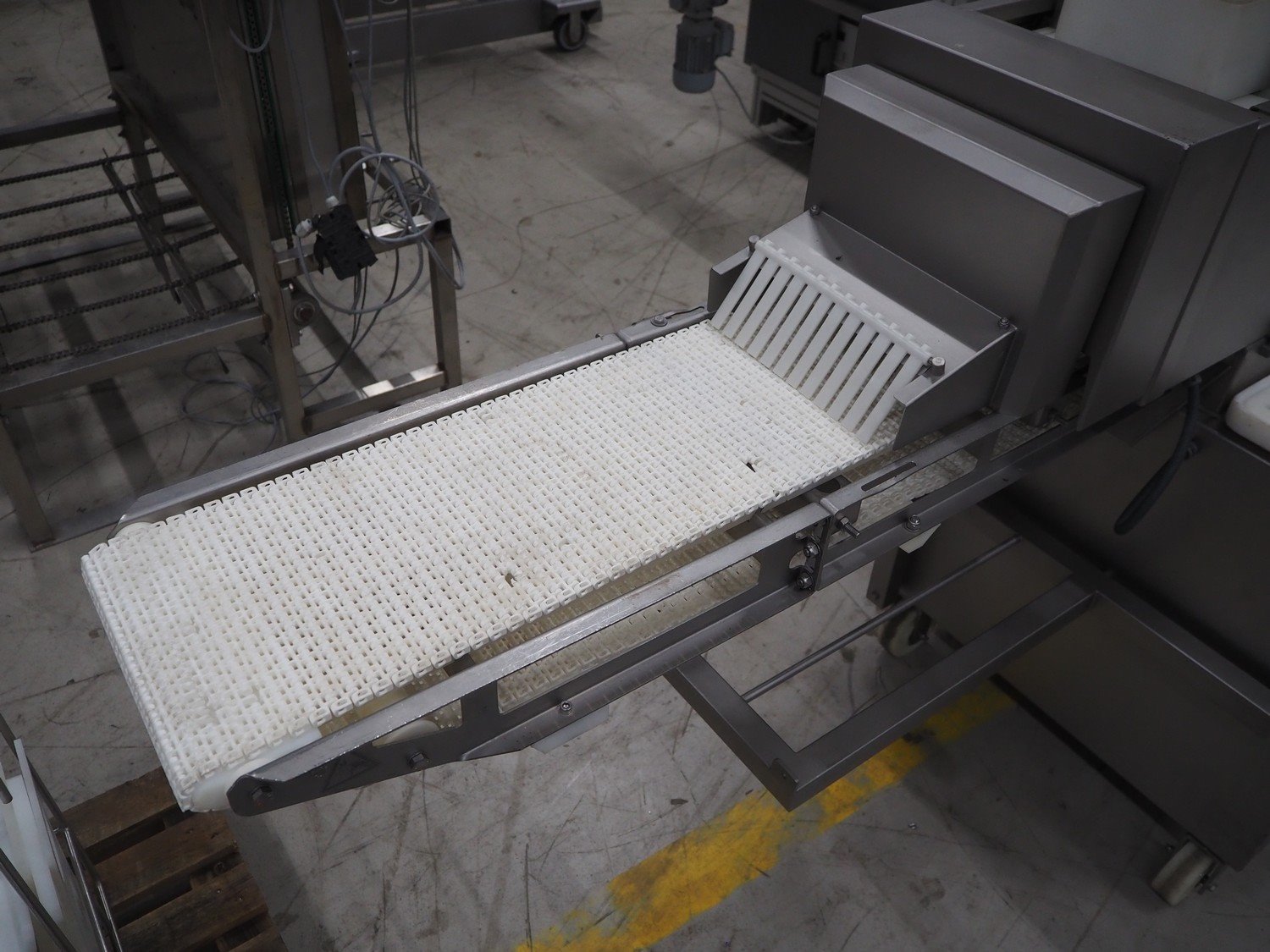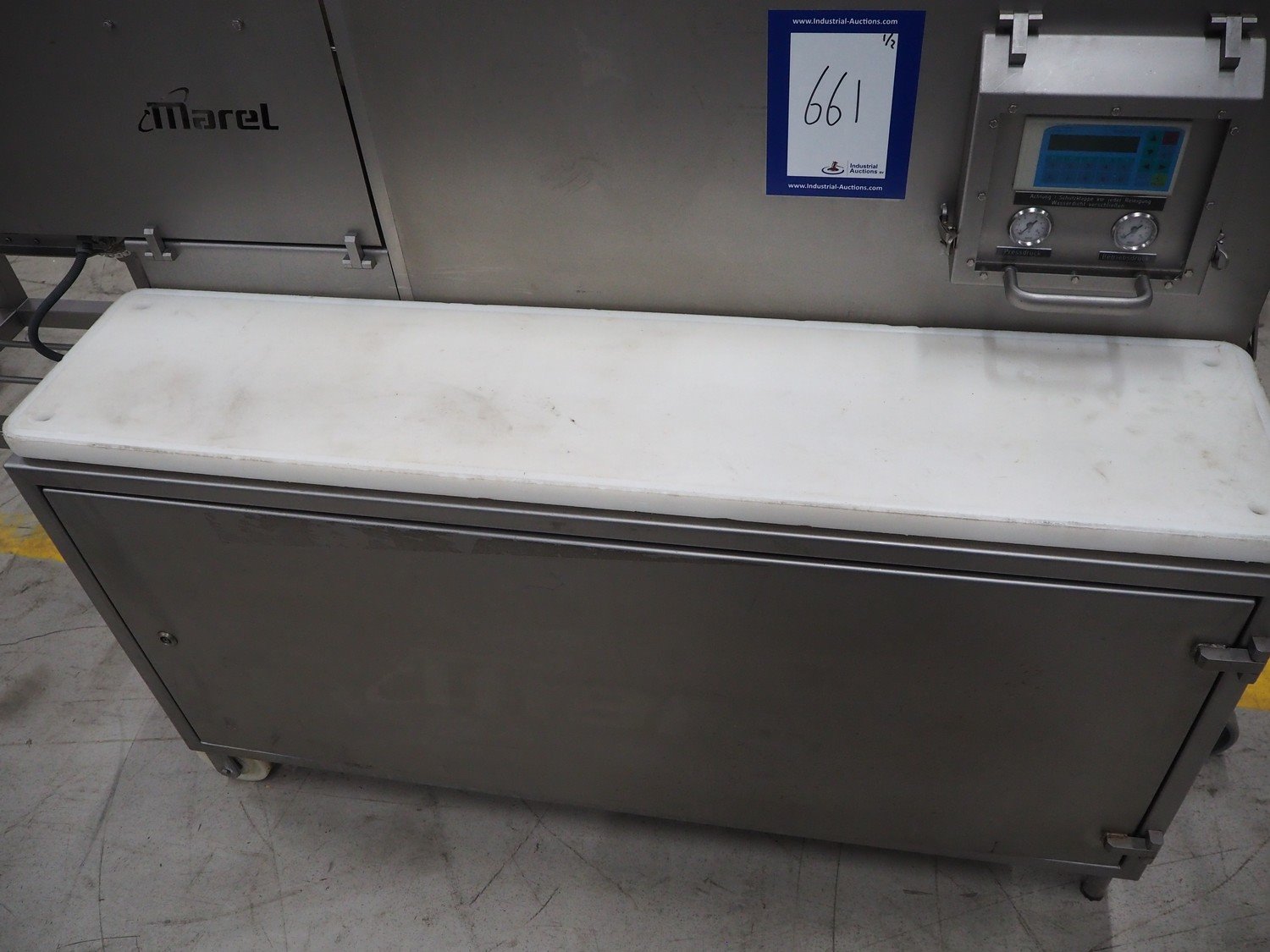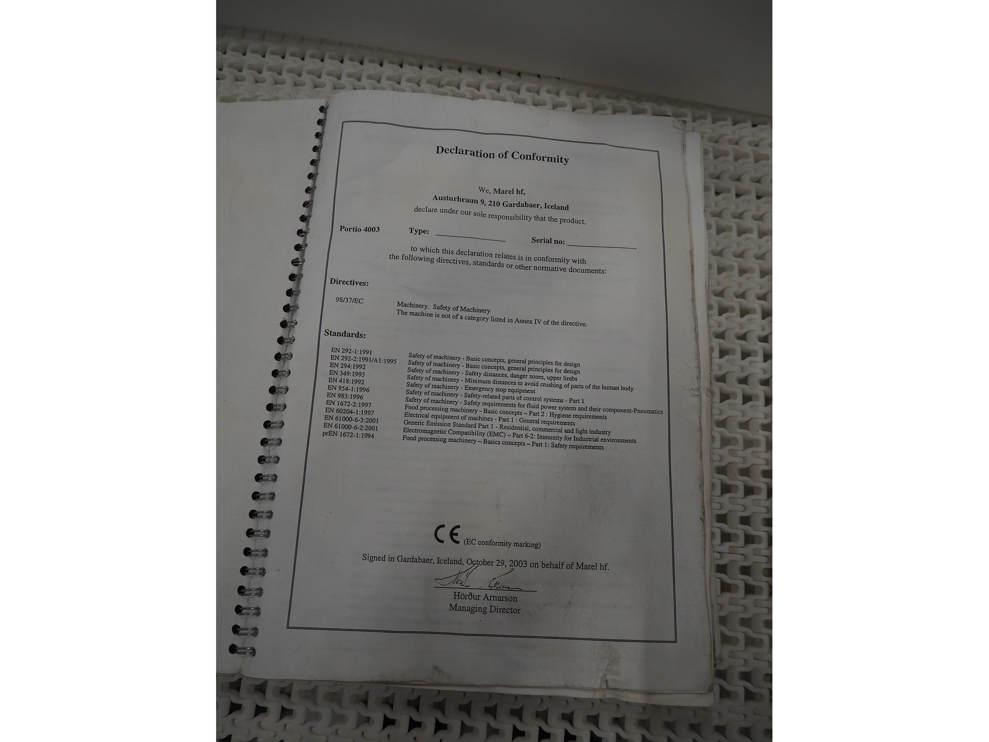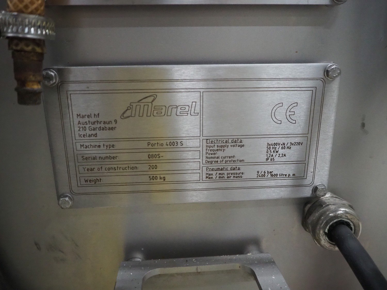 Marel mobile portioning machine, type: Portio 4003 S, serial number: 080S-0020, year of construction: 2004, 400/220 V, 3 Ph, 50/60 Hz, 1.2/2.2 A, 0.5 kW, weight: 500 kg, pressure: 6 / 9 bar, dye: (2x) 90 mm x 90 mm, plastic mesh outfeed belt, belt width: 250 mm, total dimensions: 2600 mm x 740 mm x 2550 mm. Including pallet with parts.