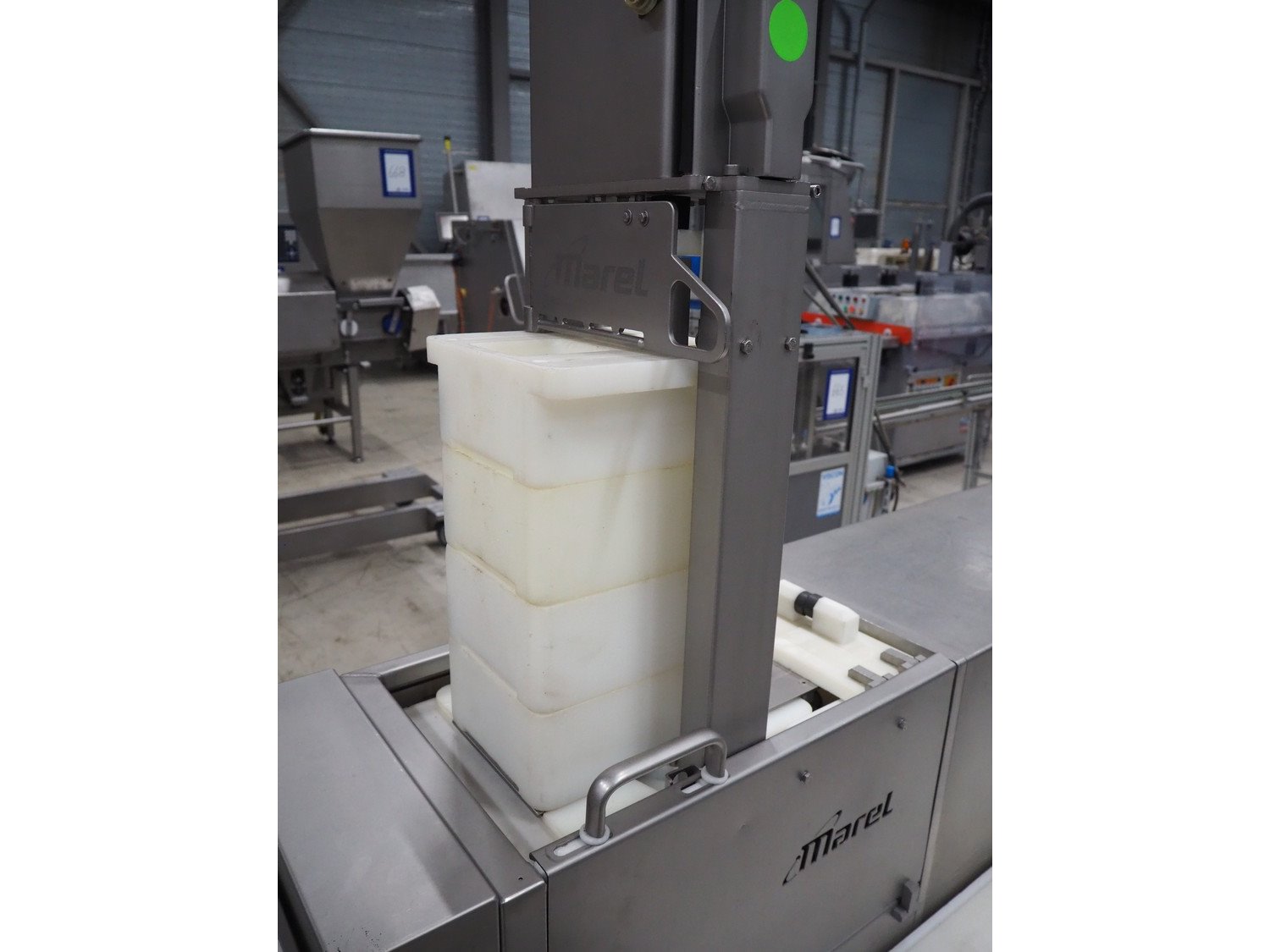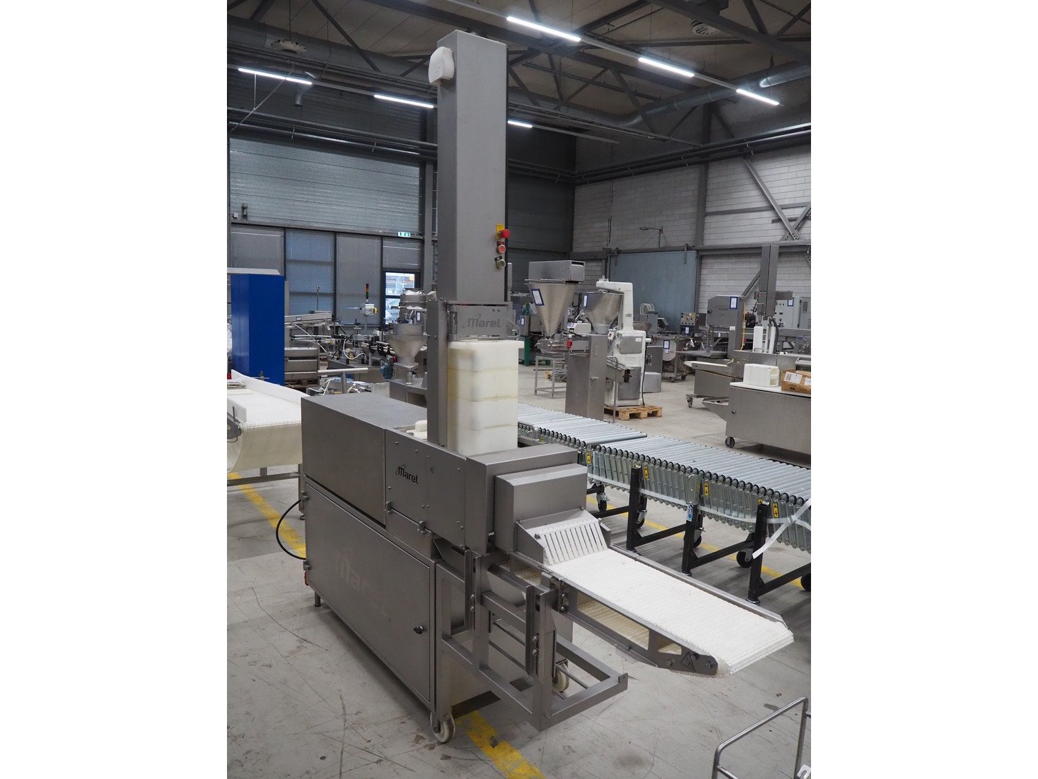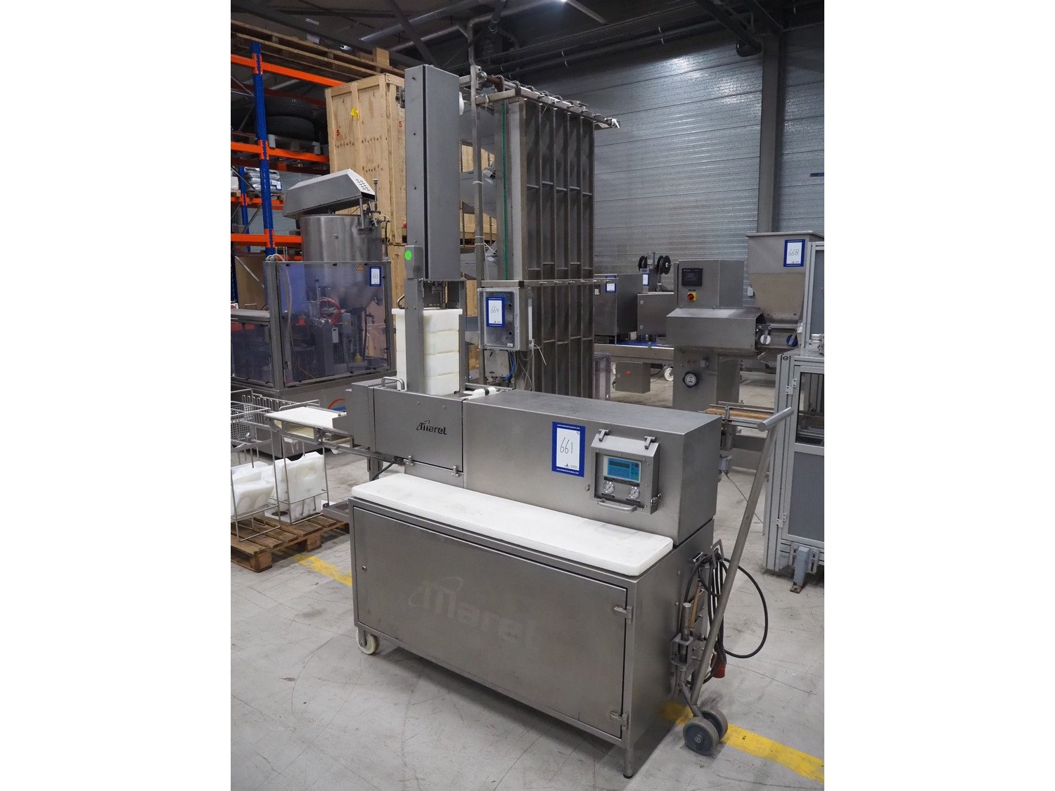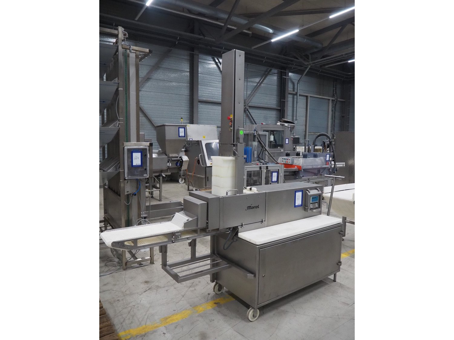 Marel mobile portioning machine, type: Portio 4003 S, serial number: 080S-0020, year of construction: 2004, 400/220 V, 3 Ph, 50/60 Hz, 1.2/2.2 A, 0.5 kW, weight: 500 kg, pressure: 6 / 9 bar, dye: (2x) 90 mm x 90 mm, plastic mesh outfeed belt, belt width: 250 mm, total dimensions: 2600 mm x 740 mm x 2550 mm. Including pallet with parts.