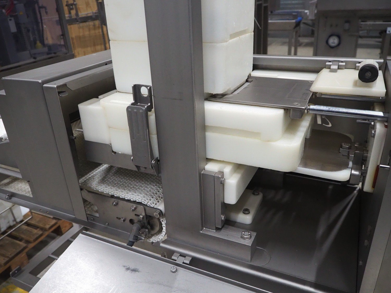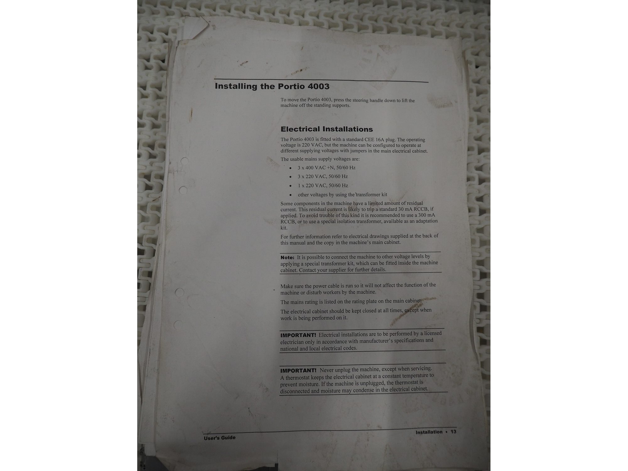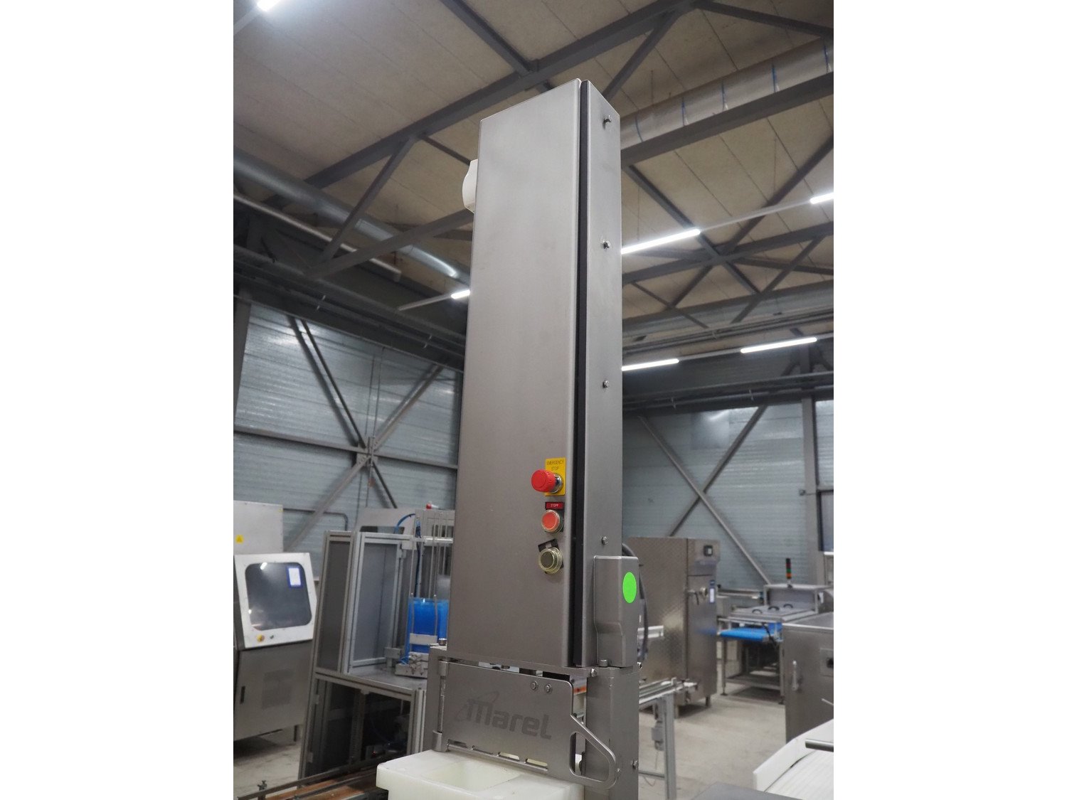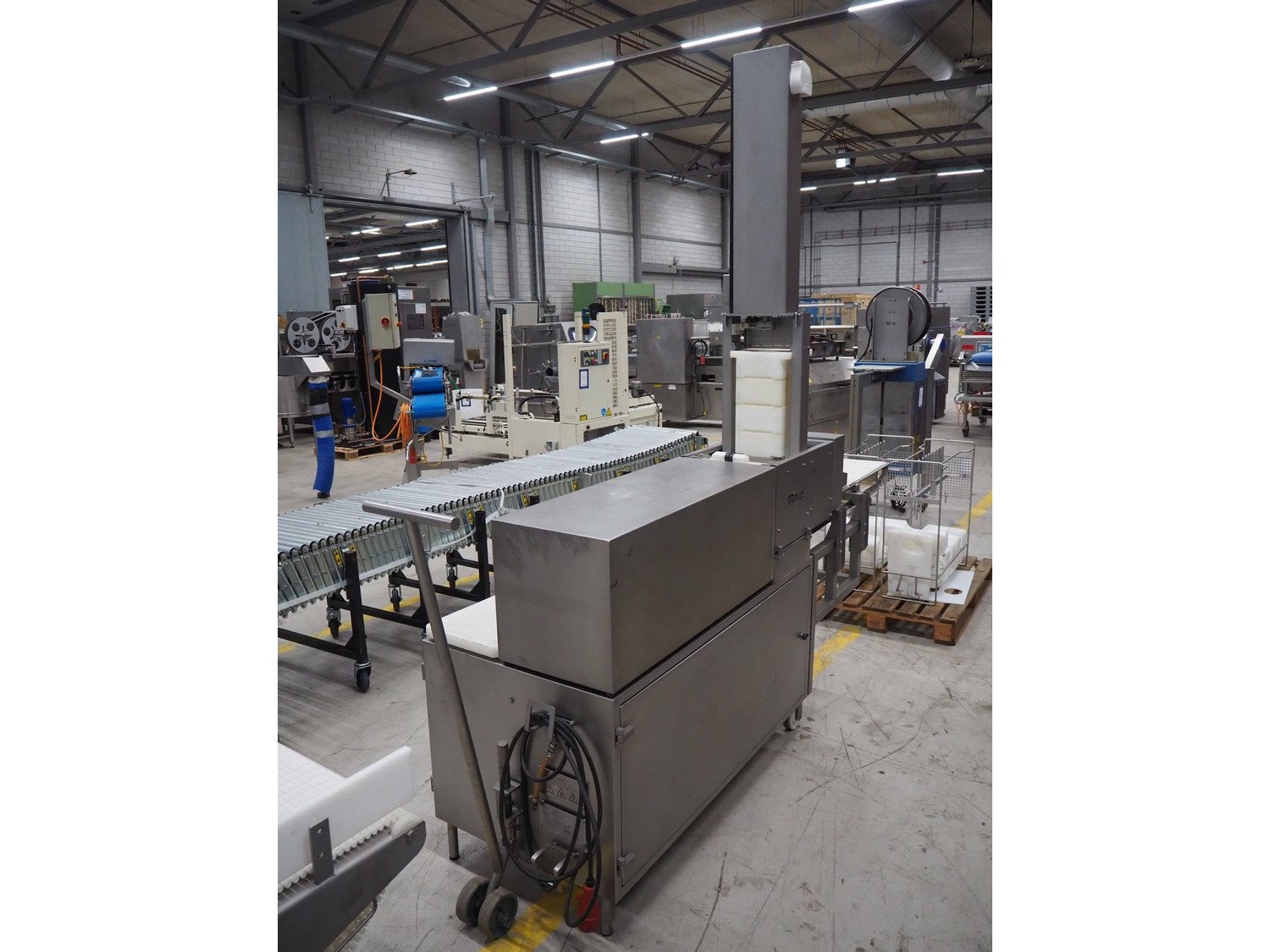 Marel mobile portioning machine, type: Portio 4003 S, serial number: 080S-0020, year of construction: 2004, 400/220 V, 3 Ph, 50/60 Hz, 1.2/2.2 A, 0.5 kW, weight: 500 kg, pressure: 6 / 9 bar, dye: (2x) 90 mm x 90 mm, plastic mesh outfeed belt, belt width: 250 mm, total dimensions: 2600 mm x 740 mm x 2550 mm. Including pallet with parts.