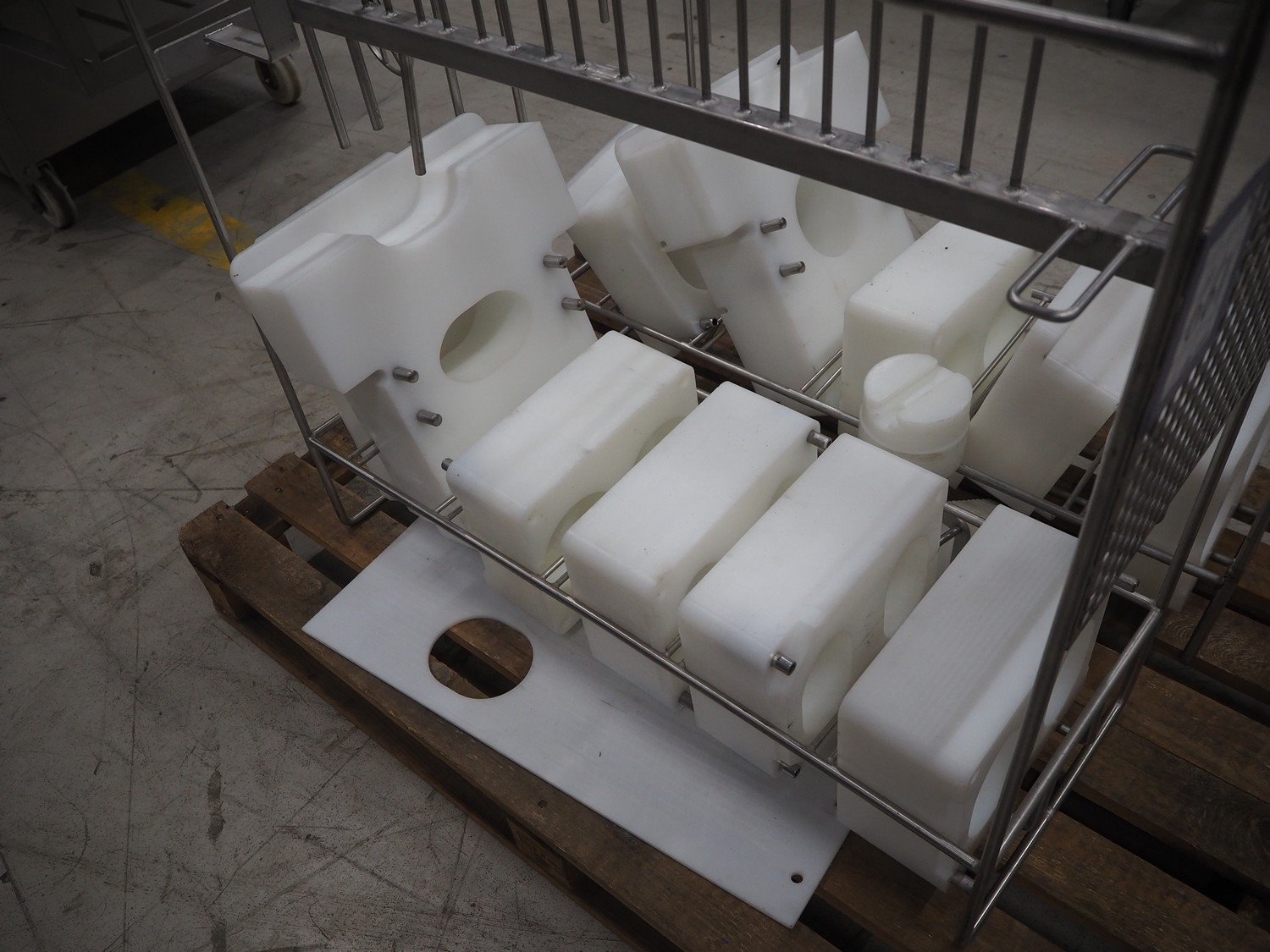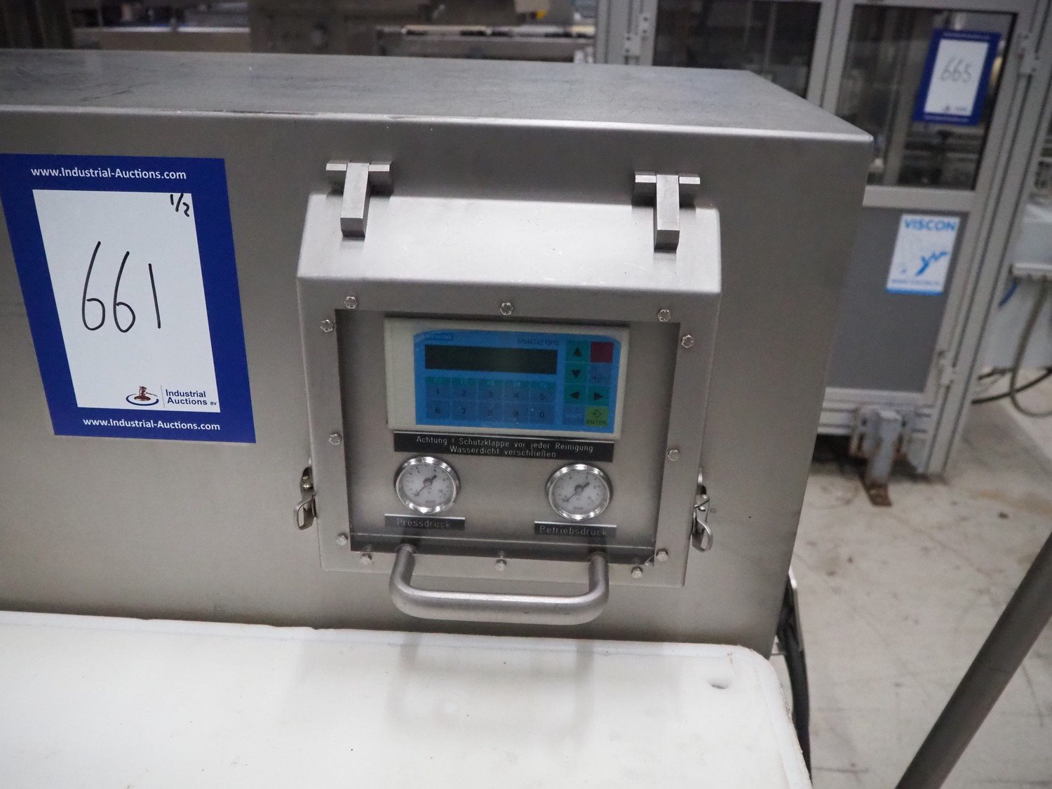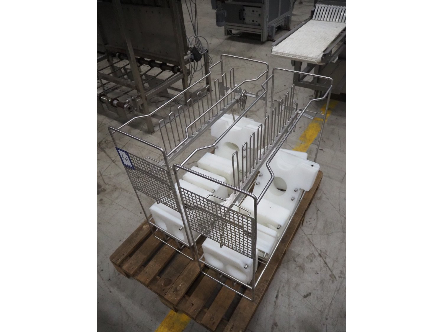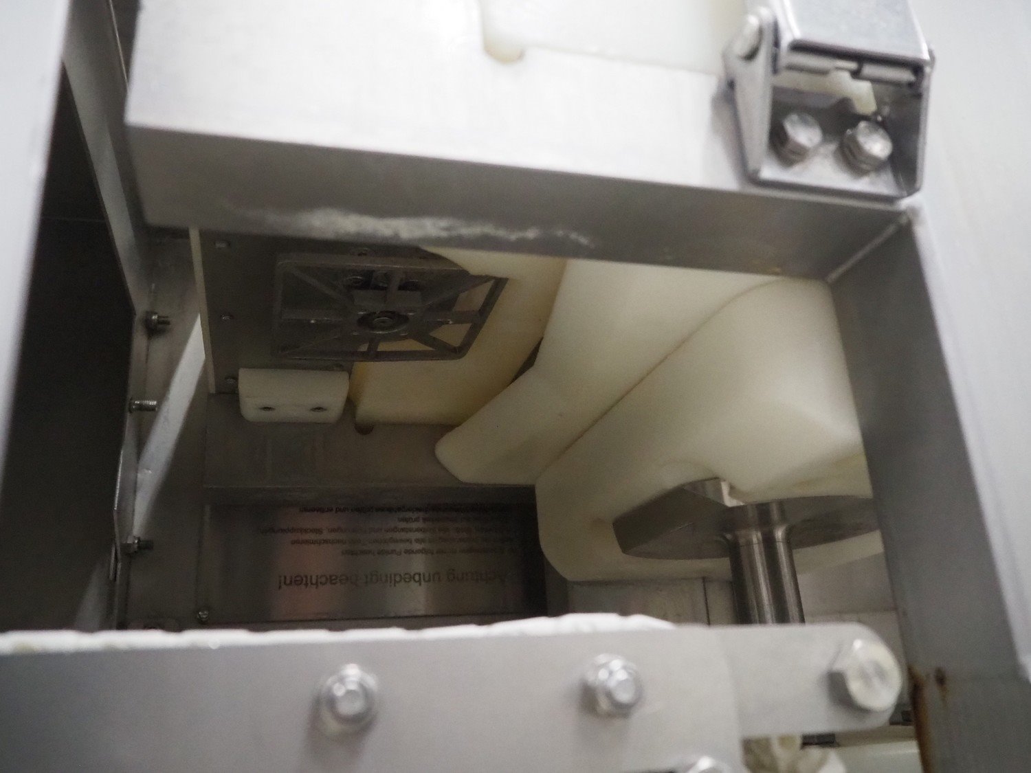 Marel mobile portioning machine, type: Portio 4003 S, serial number: 080S-0020, year of construction: 2004, 400/220 V, 3 Ph, 50/60 Hz, 1.2/2.2 A, 0.5 kW, weight: 500 kg, pressure: 6 / 9 bar, dye: (2x) 90 mm x 90 mm, plastic mesh outfeed belt, belt width: 250 mm, total dimensions: 2600 mm x 740 mm x 2550 mm. Including pallet with parts.