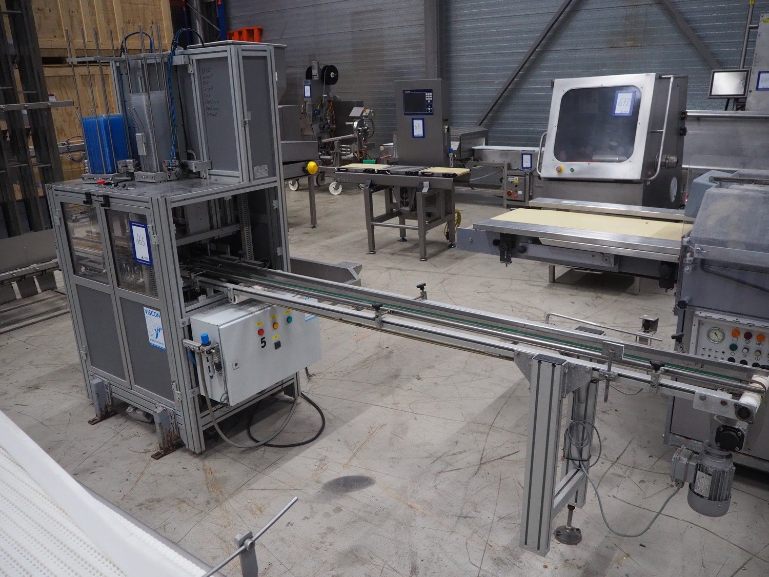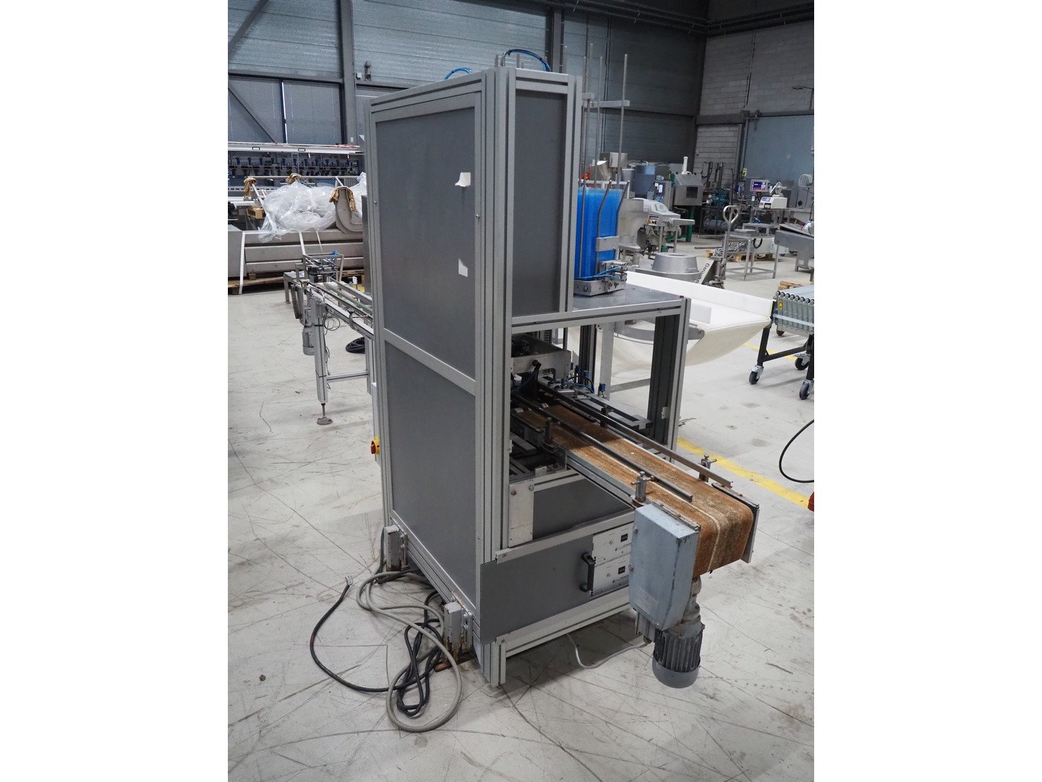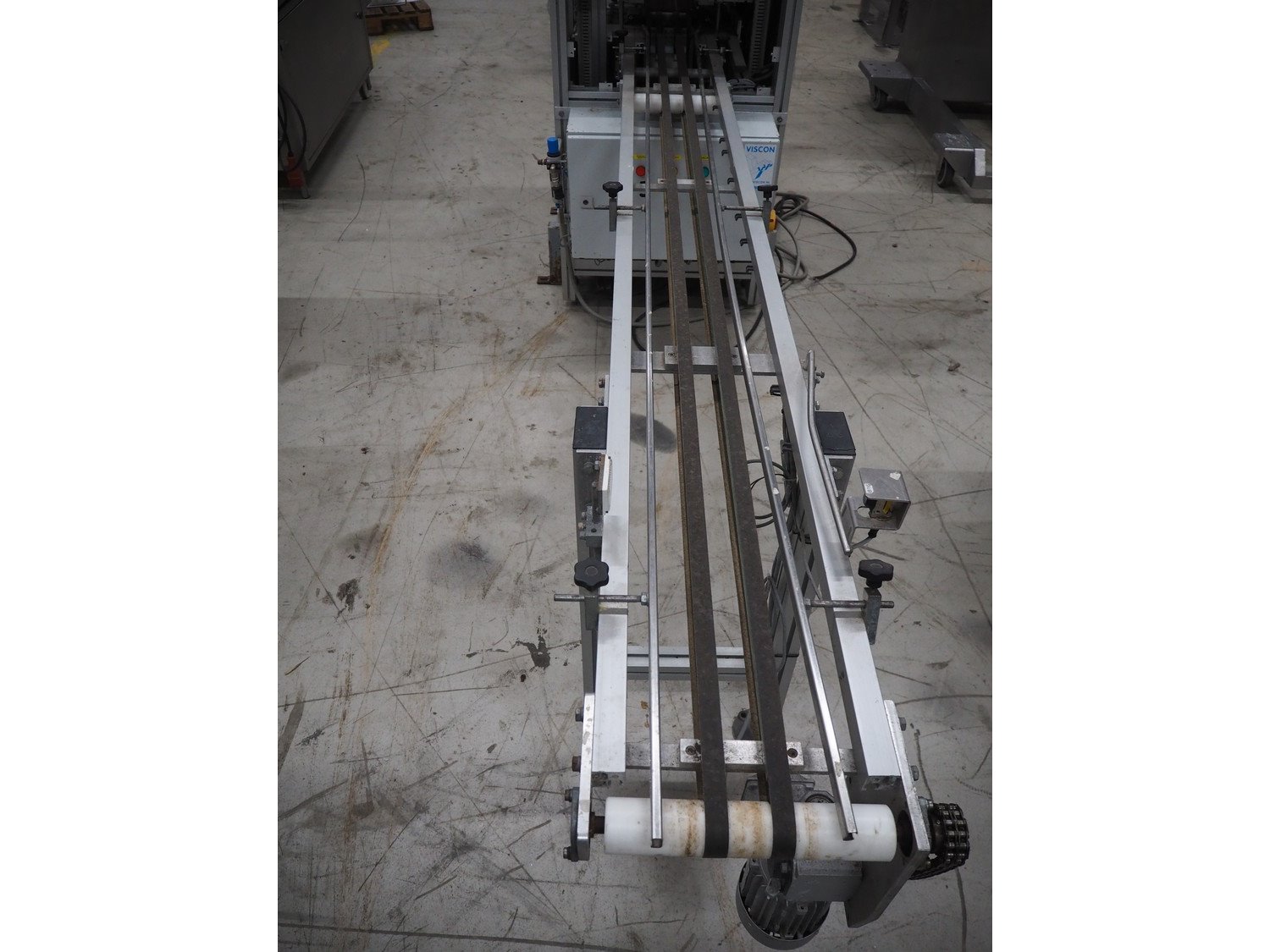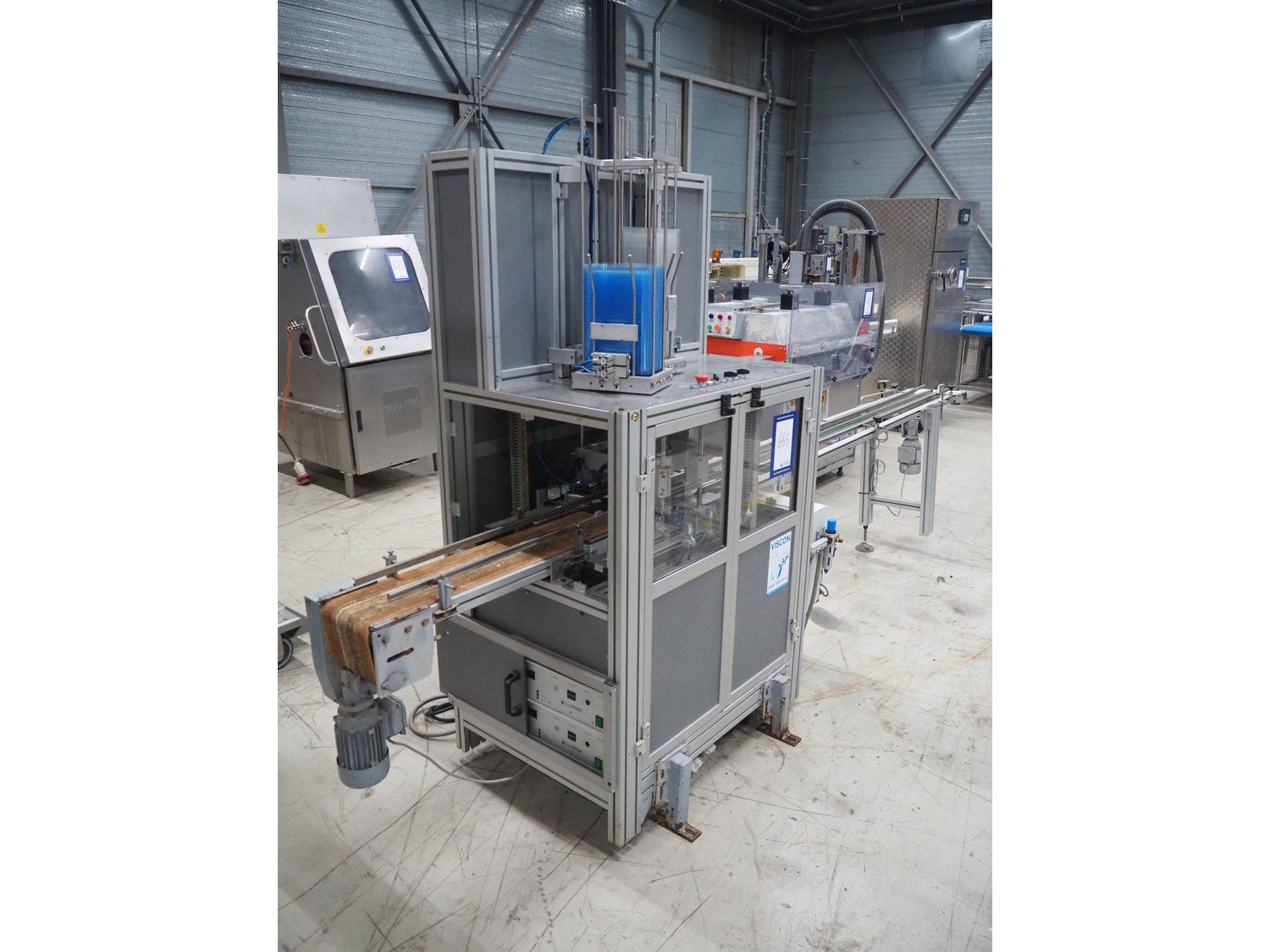 Viscon lid applicator, type: Dekselmachine, serial number 67331-430, year of construction: 2007, weight: 270 kg, plastic belt, belt width: 195 mm, lid size: 120 mm x 140 mm / 190 mm x 150 mm, total dimensions: 3800 mm x 1000 mmx 2000 mm.