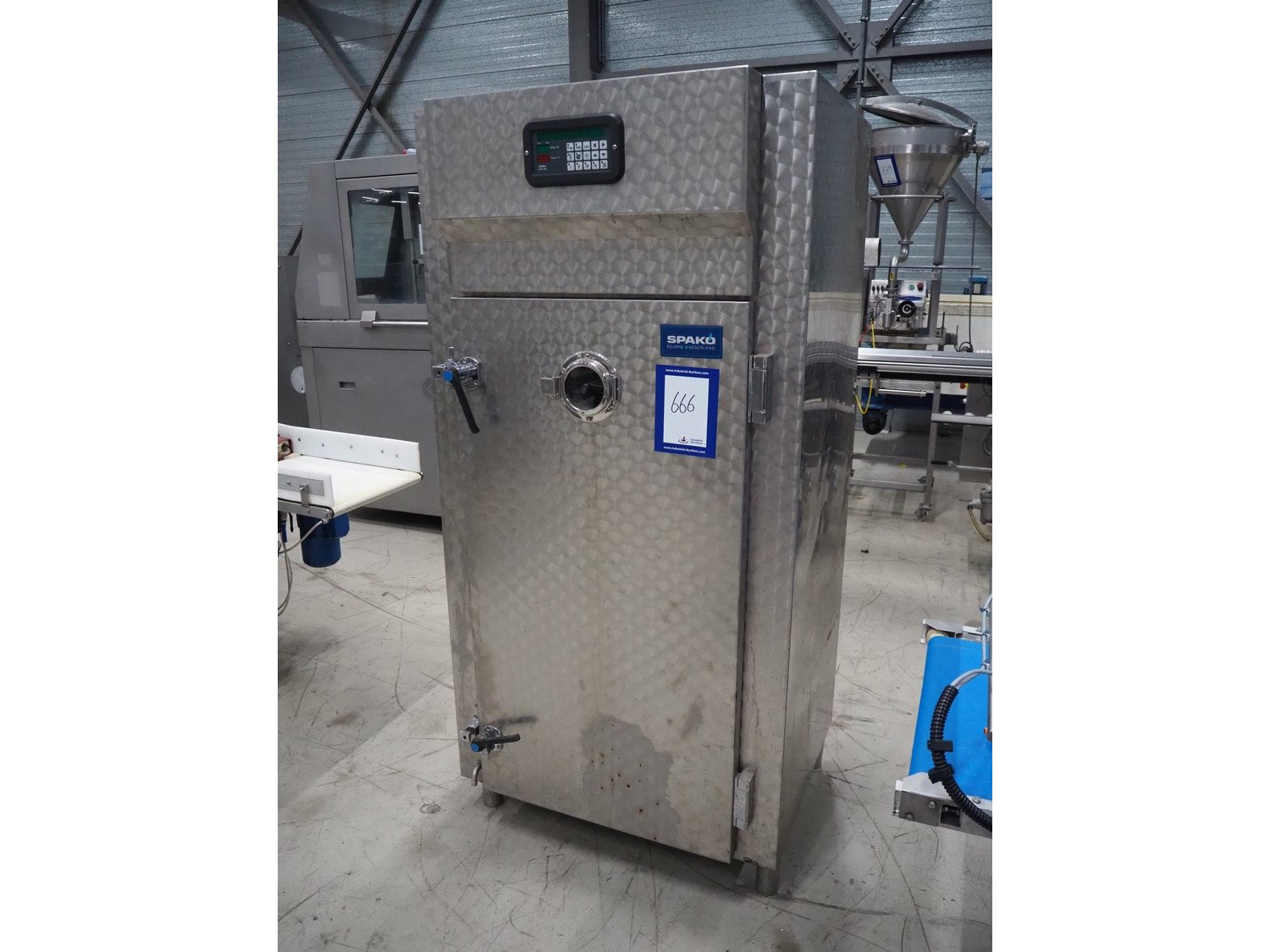 Spako smoking / cooking chamber, with aditec control panel, type: MRA 810, 7 floors, dimensions each floor: 695 mm x 615 mm, total dimensions: 970 mm x 840 mm x 2000 mm. Technical condition unknown.