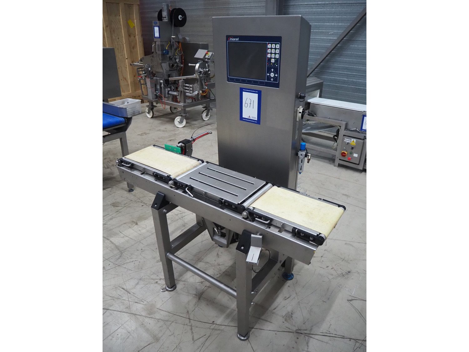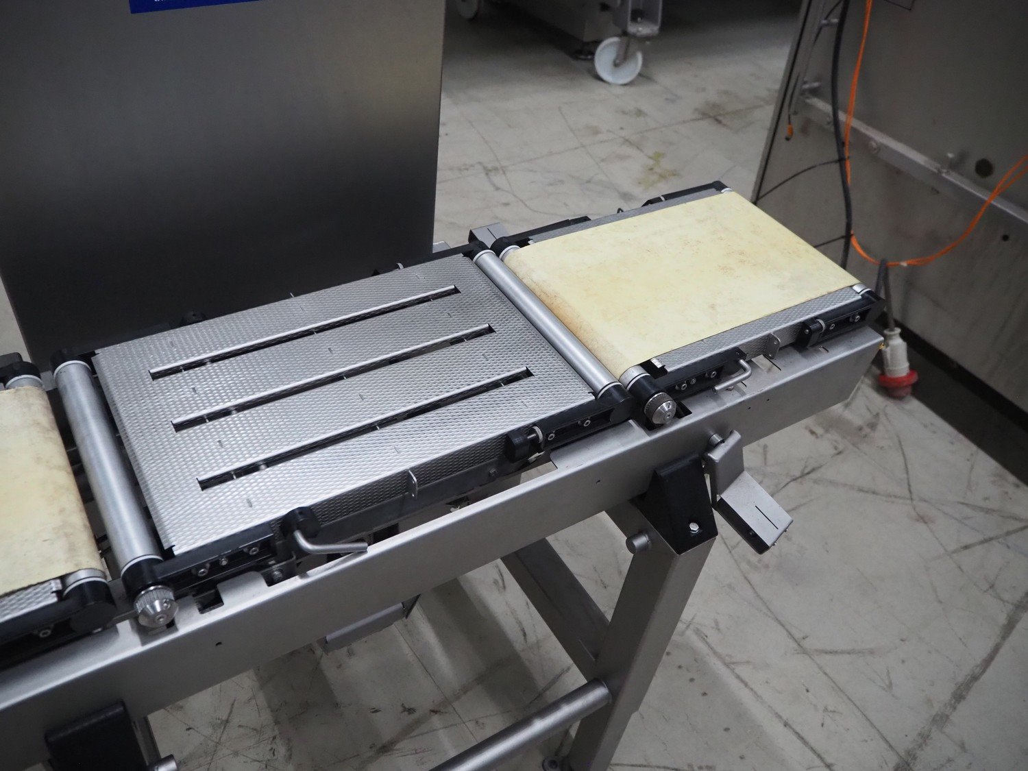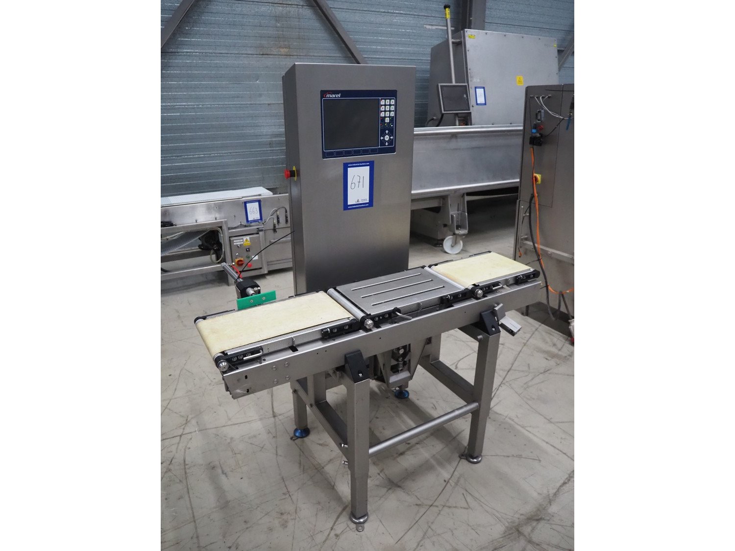 Marel checkweigher, type: M-Check RF8 8023.30, serial number: E014590, type load cell: Z6F C3, serial number: 31036805, maximum: 31036805, minimum: 0.05 kg, e= 0.001 kg, T= -Max, plastic belt, belt width: 230 mm, total dimensions: 1400 mm x 850 mm x 1680 mm. Missing one transport belt.