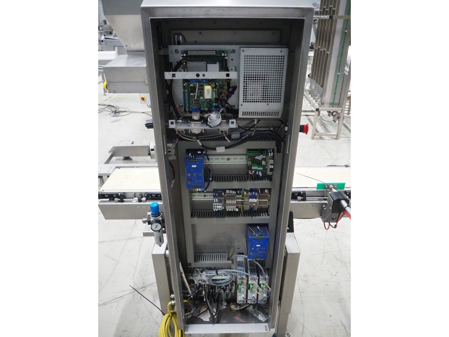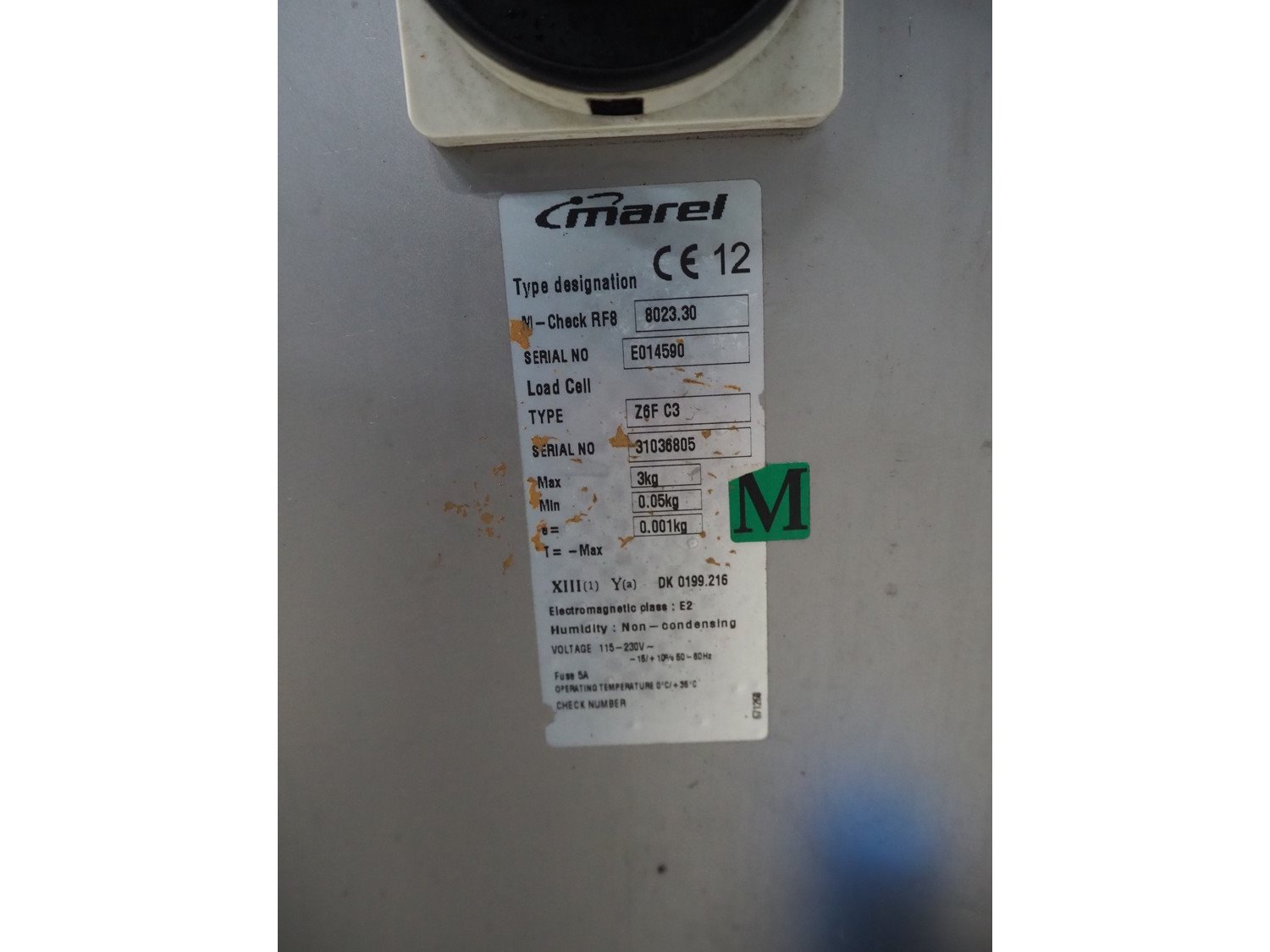 Marel checkweigher, type: M-Check RF8 8023.30, serial number: E014590, type load cell: Z6F C3, serial number: 31036805, maximum: 3 kg, minimum: 0.05 kg, e= 0.001 kg, T= -Max, plastic belt, belt width: 230 mm, total dimensions: 1400 mm x 850 mm x 1680 mm. Missing one transport belt. Technical condition unknown.