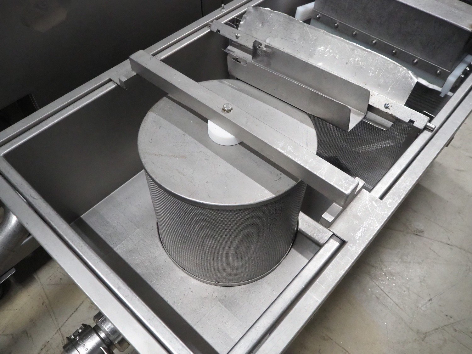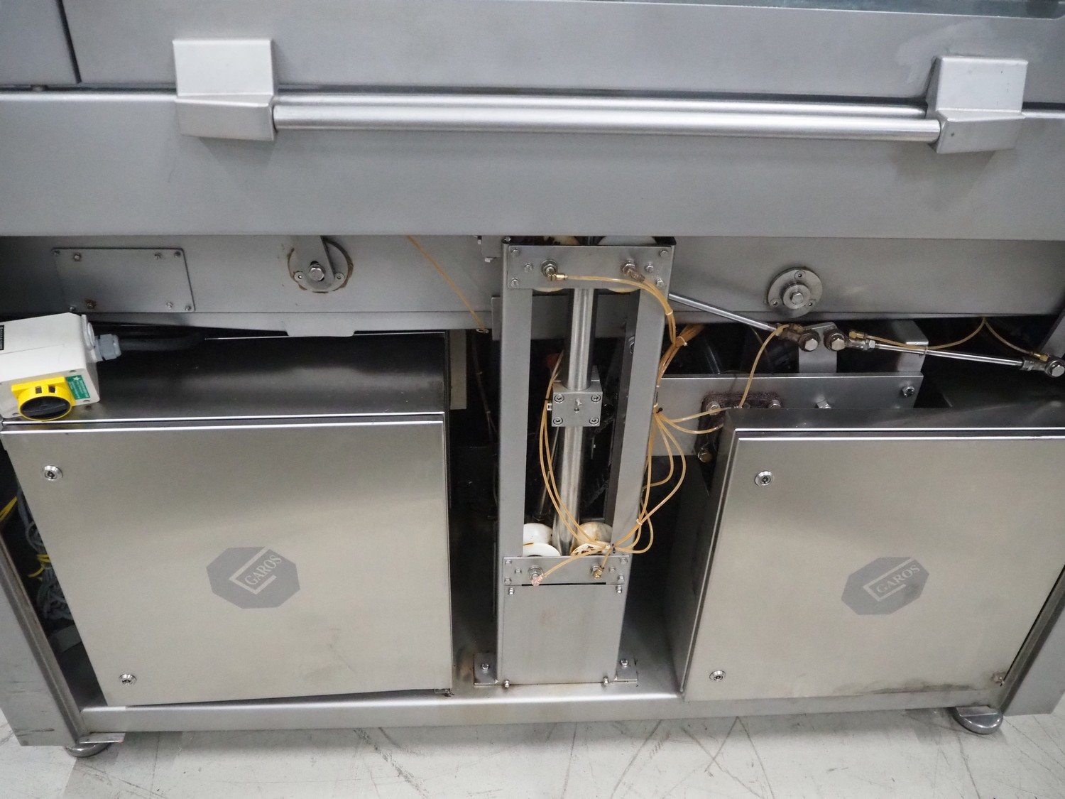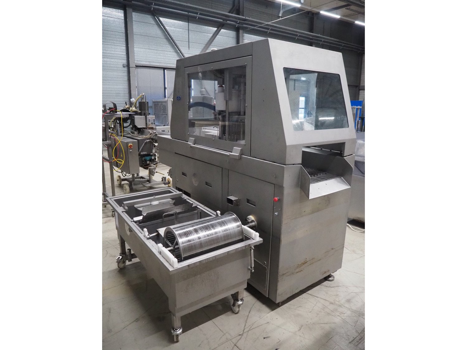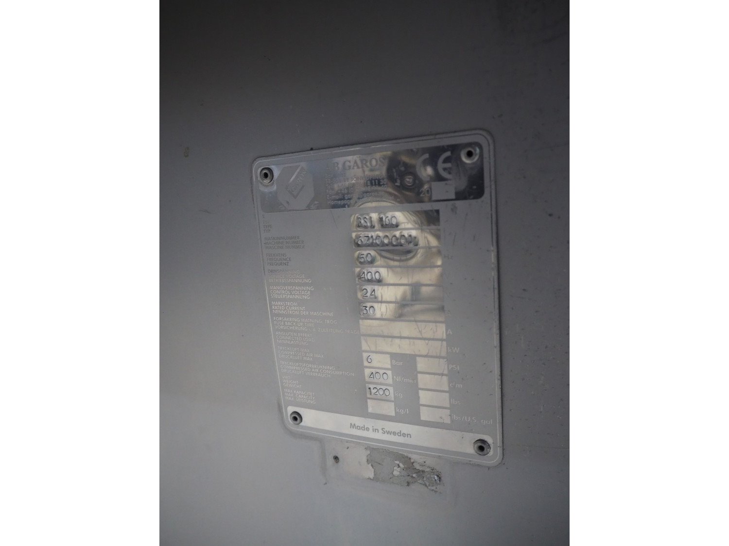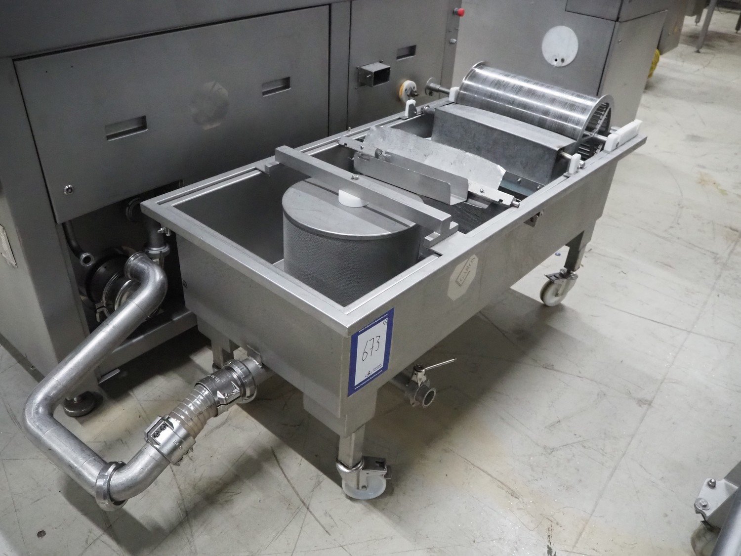 Garos injector, type: GSI 160, machine number: 67100001, 400 V, 50 Hz, 30 A, weight: 1200 kg, s/s walking beam, beam width: 550 mm, 160 needles, total dimensions: 2350 mm x 980 mm x 2350 mm. Including mobile filter tub, dimensions: 1950 mm x 750 mm x 800 mm.