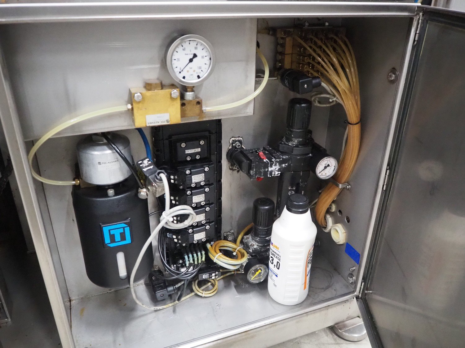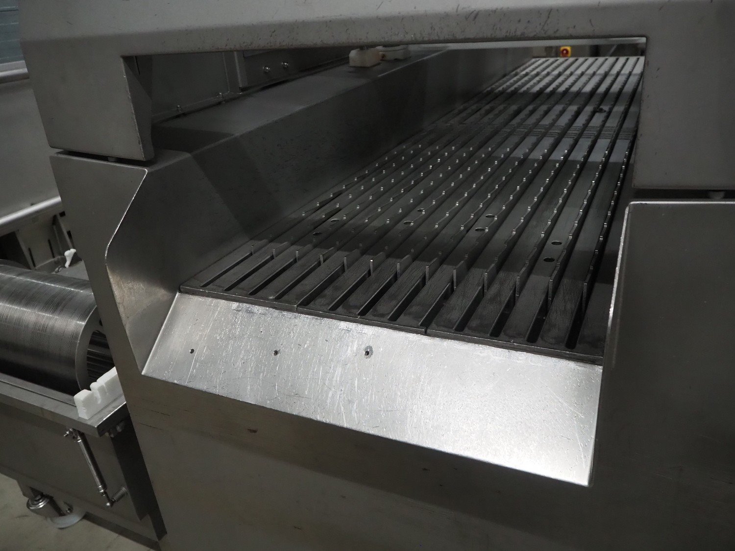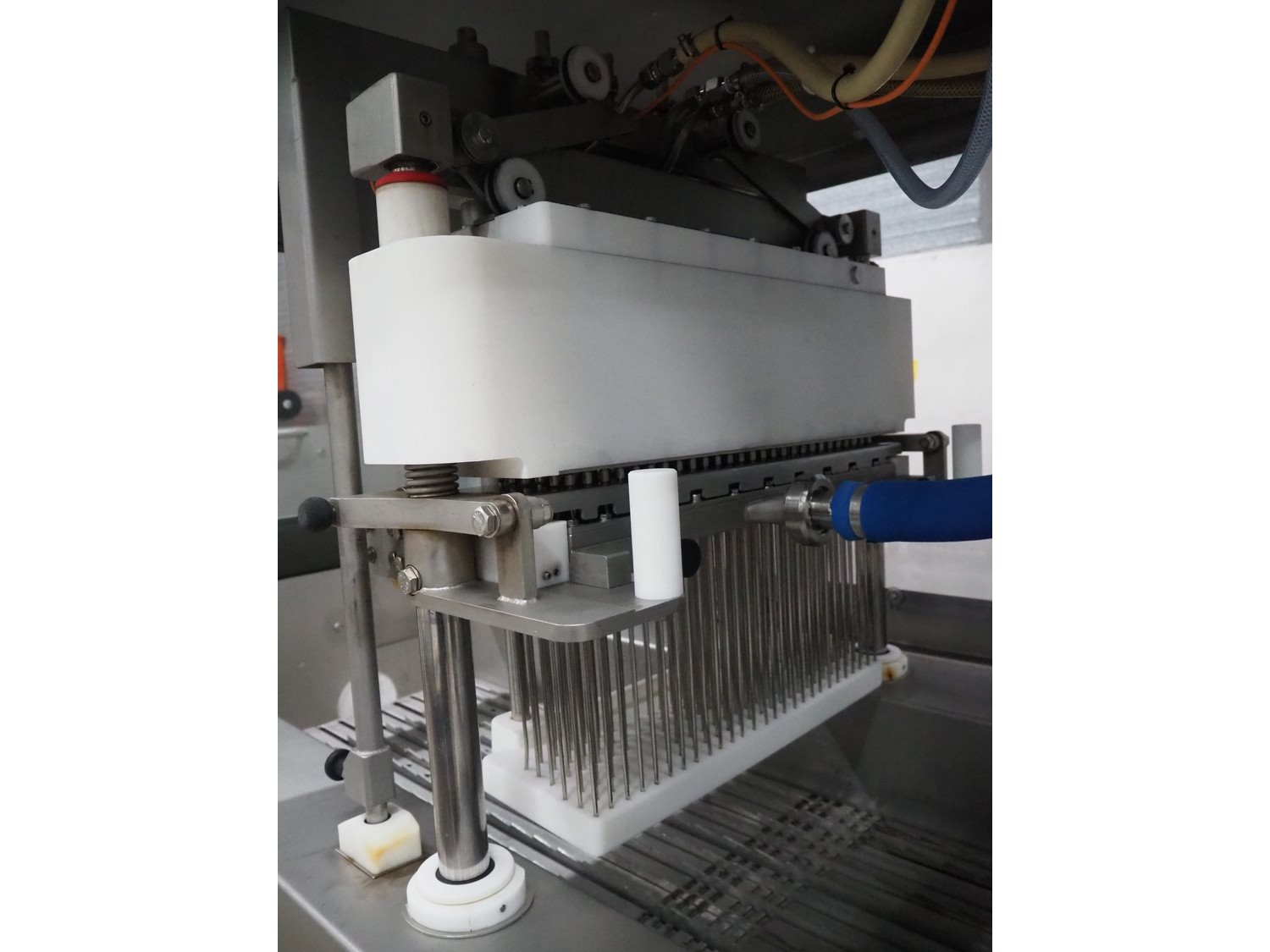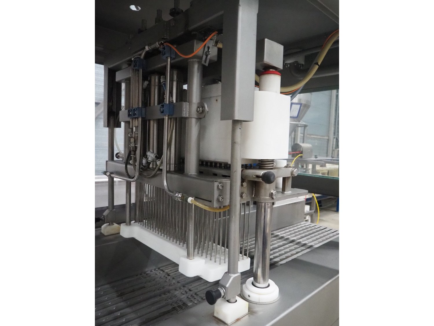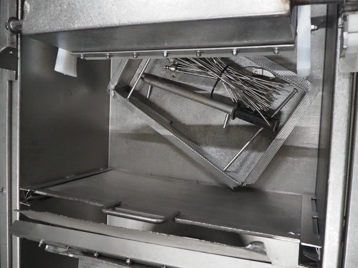Garos injector, type: GSI 160, machine number: 67100001, 400 V, 50 Hz, 30 A, weight: 1200 kg, s/s walking beam, beam width: 550 mm, 160 needles, total dimensions: 2350 mm x 980 mm x 2350 mm. Including mobile filter tub, dimensions: 1950 mm x 750 mm x 800 mm.