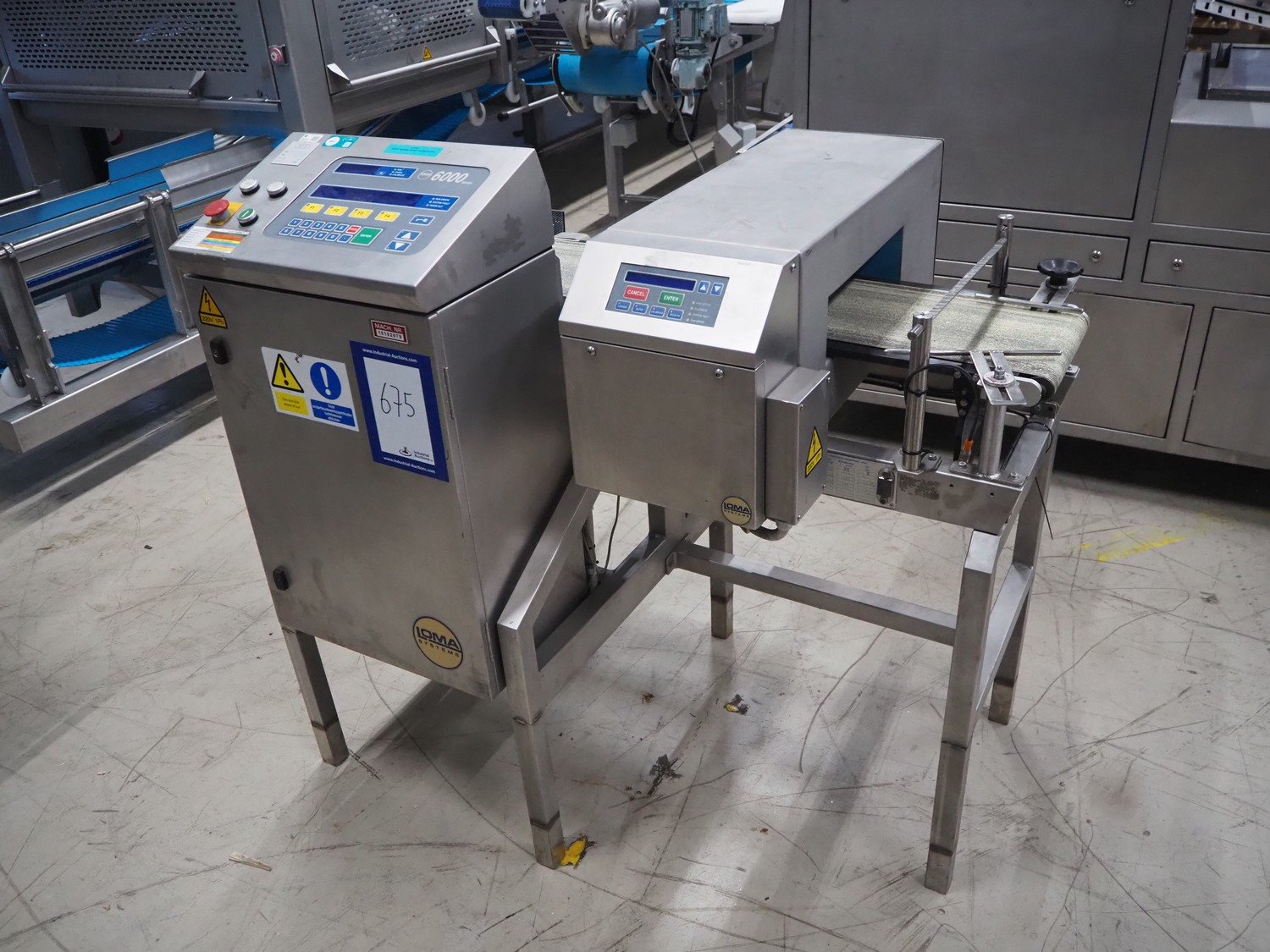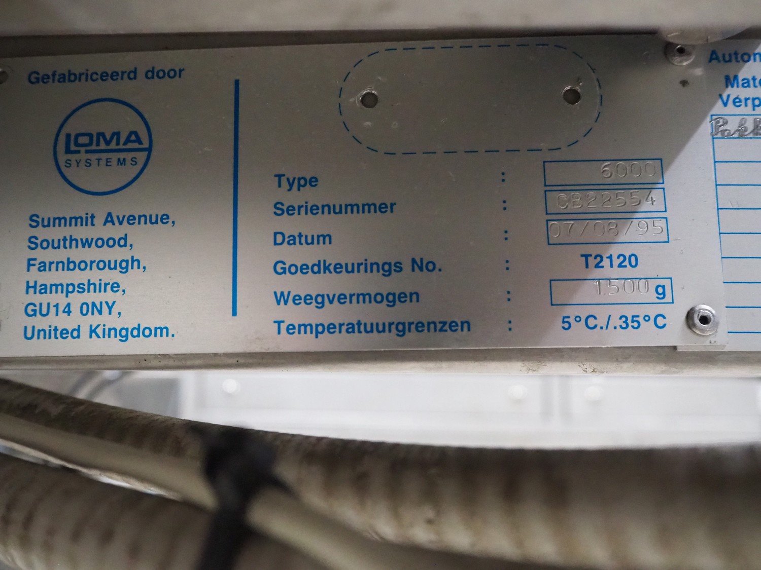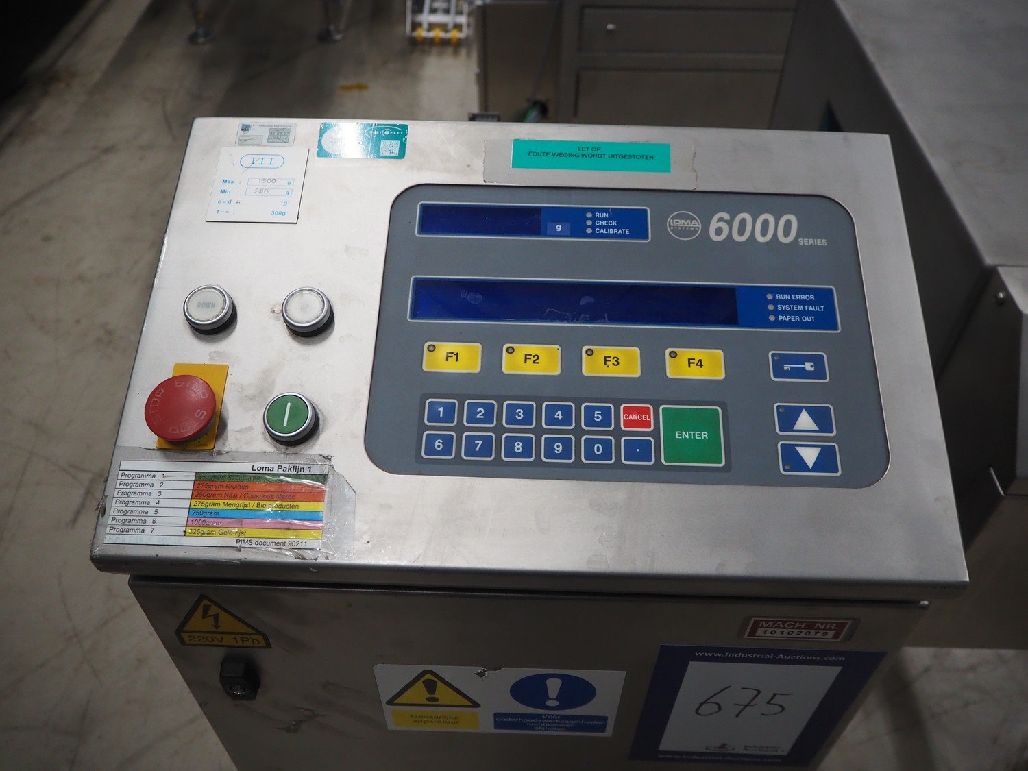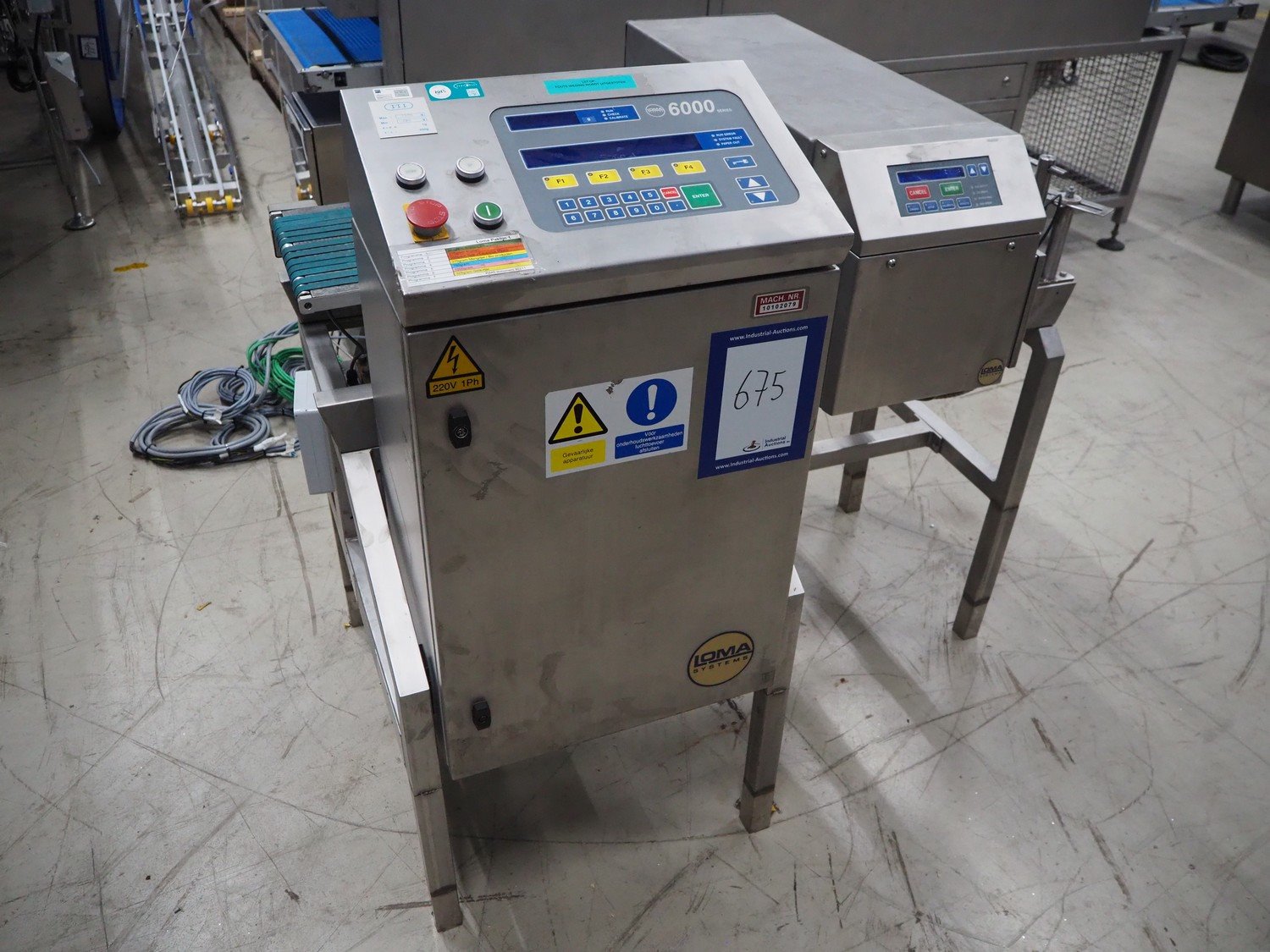 Loma checkweigher with metal detector, type: 6000, serial number: CB22554, year of construction: 1995, 220 V, 1 Ph, 50 Hz, weight: 173 kg, maximum weight: 1500 gram, minimum weight: 200 gram, e=d= 1 g. T= 300 g, plastic belt, belt width: 245 mm, clearance: 350 mm x 70 mm, total dimensions: 1300 mm x mm x 950 mm.
