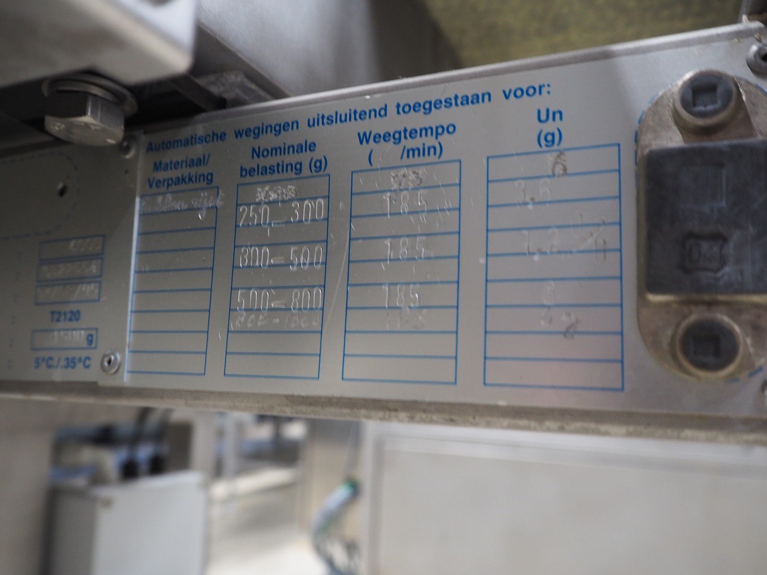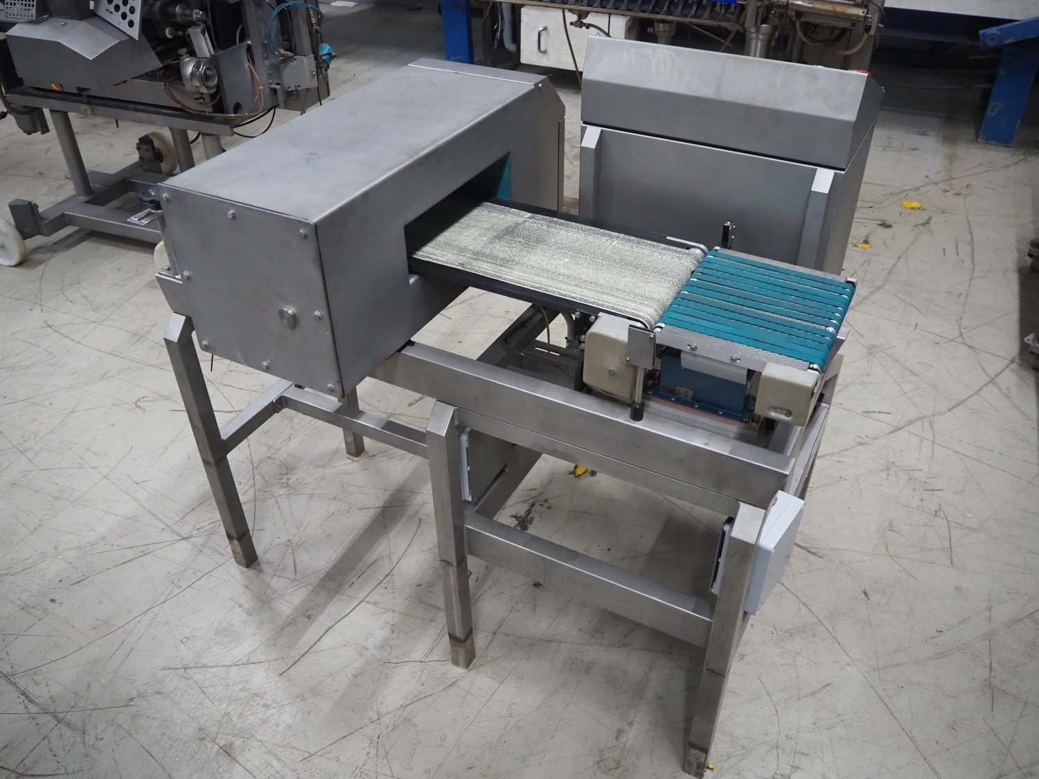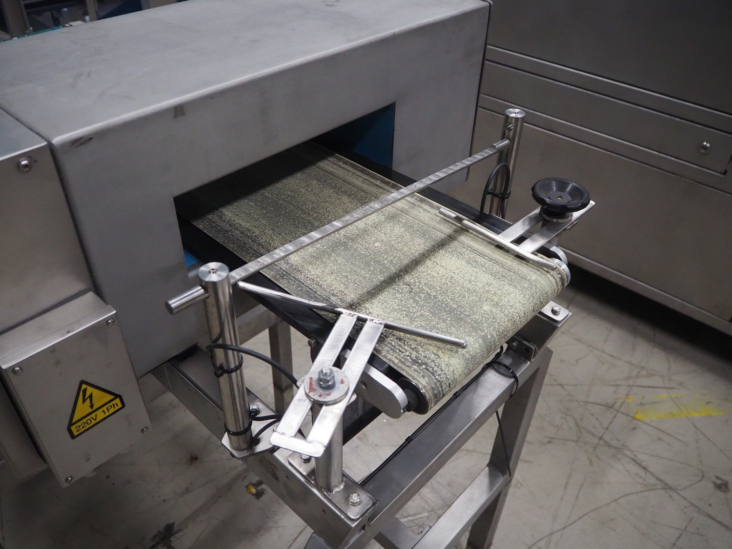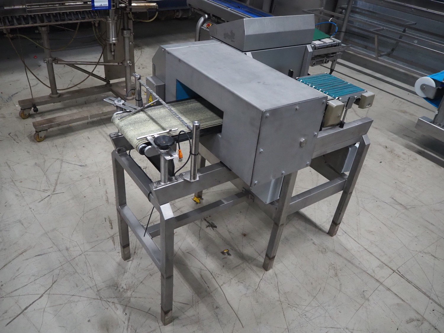 Loma checkweigher with metal detector, type: 6000, serial number: CB22554, year of construction: 1995, 220 V, 1 Ph, 50 Hz, weight: 173 kg, maximum weight: 1500 gram, minimum weight: 200 gram, e=d= 1 g. T= 300 g, plastic belt, belt width: 245 mm, clearance: 350 mm x 70 mm, total dimensions: 1300 mm x mm x 950 mm.