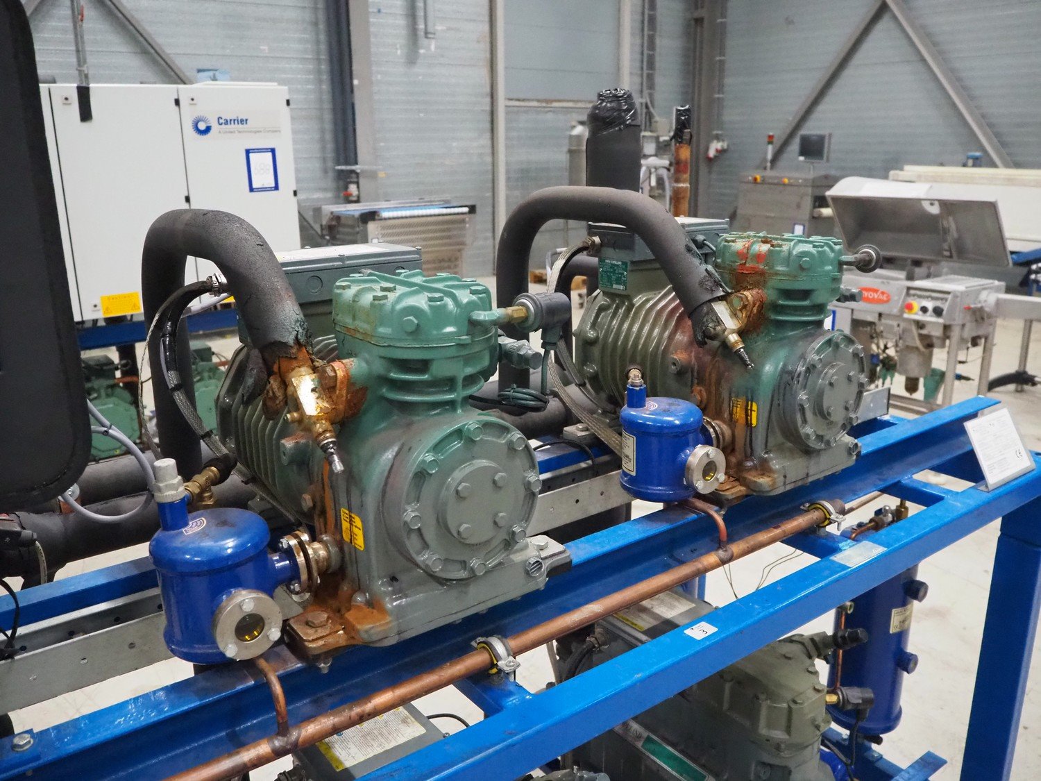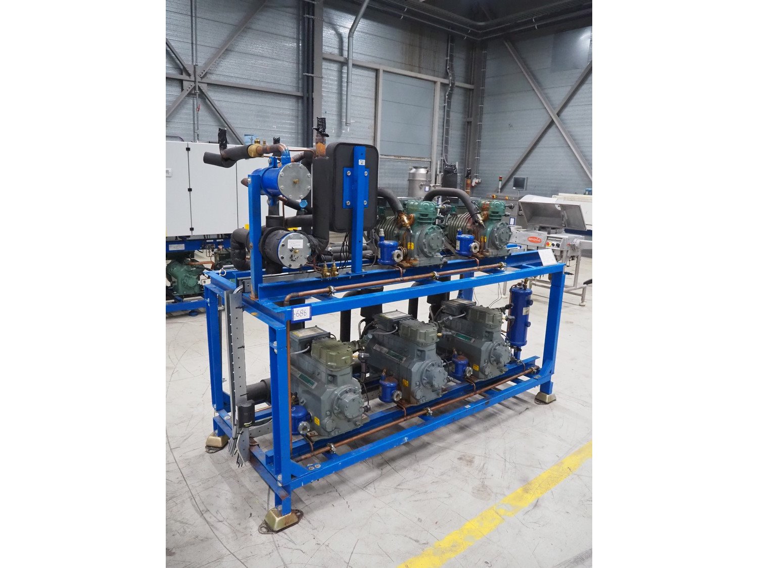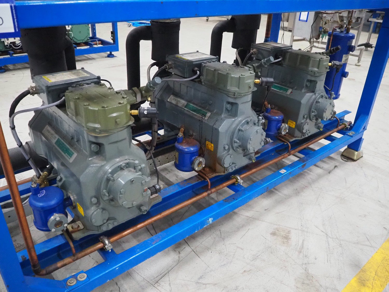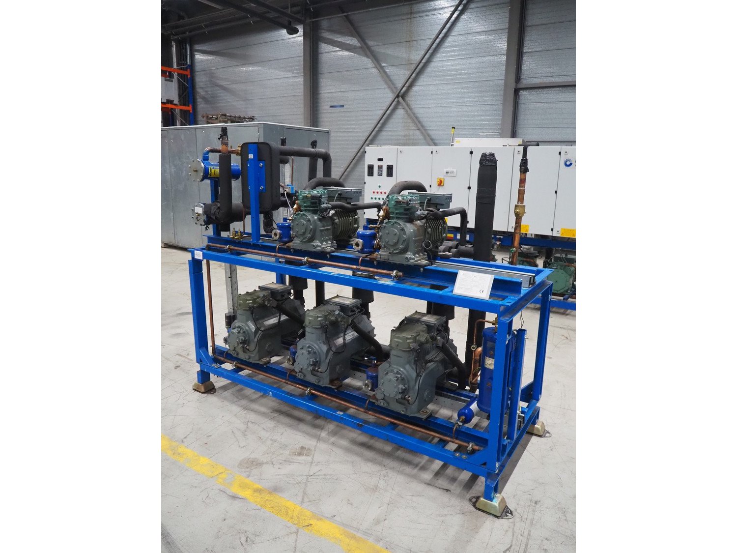 Carrier compressor rack consisting of 5 DWM copeland cooling compressors, model: (2x) DLSGP-40X-EWL, capacity: (2x) 22.50 m³ per hour, model: (3x) D3DS5-150X-AWM/D, capacity: (3x) 49.90 m³ per hour, dimensions: 2200 mm x 900 mm x 1700 mm.