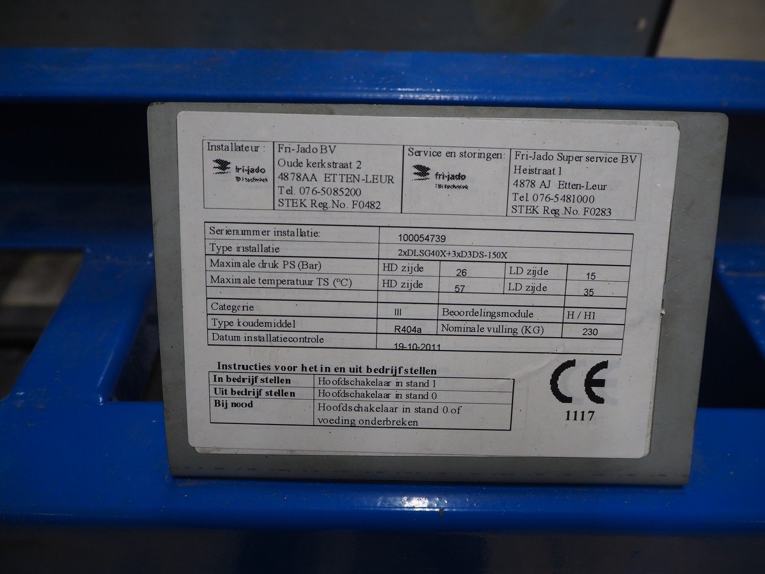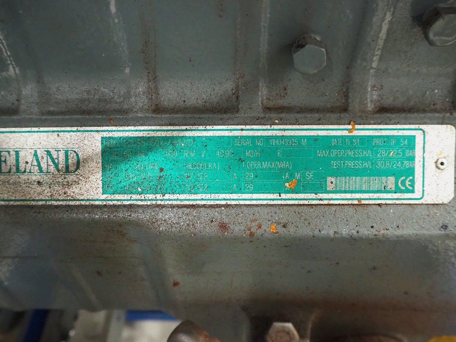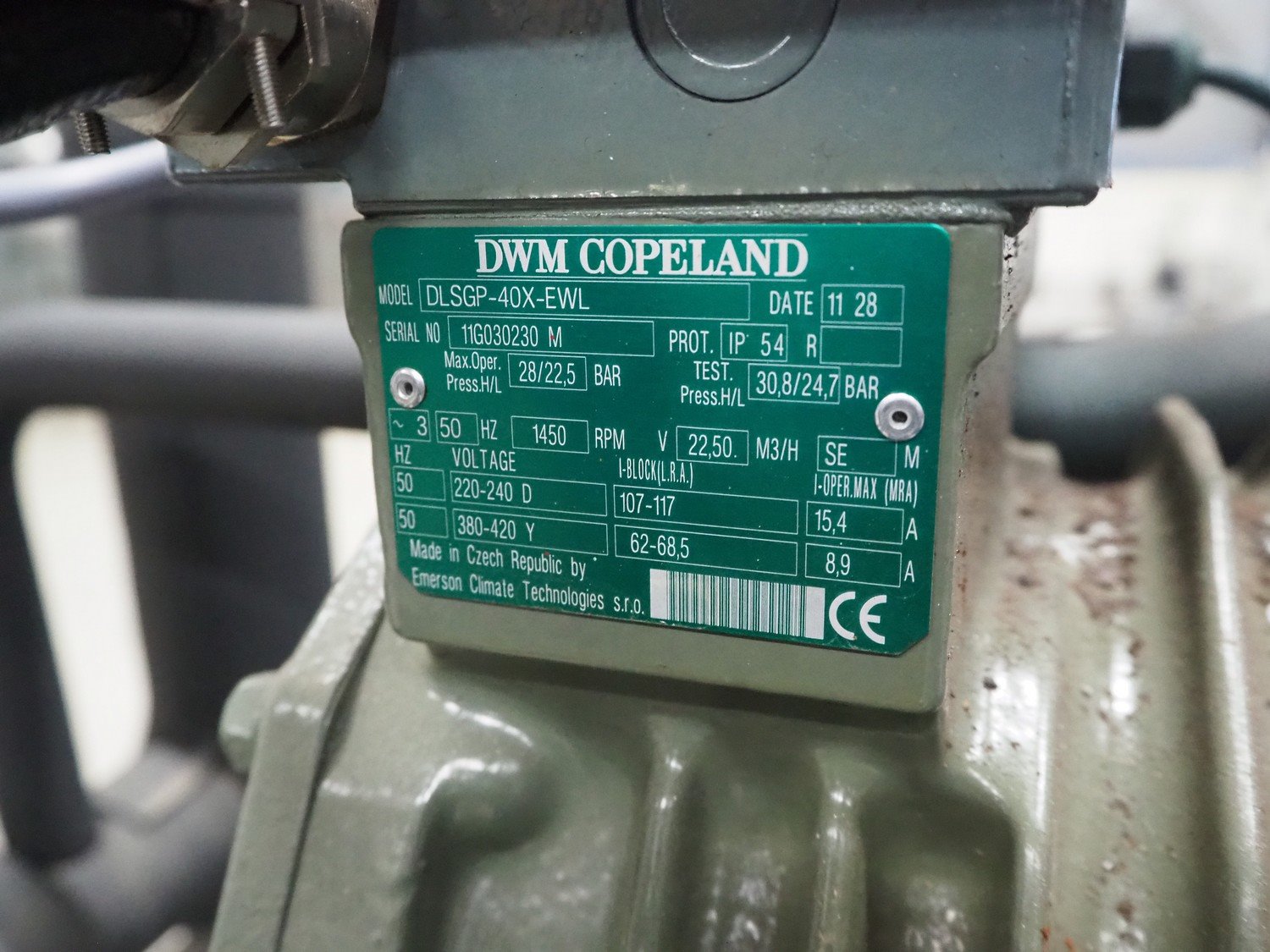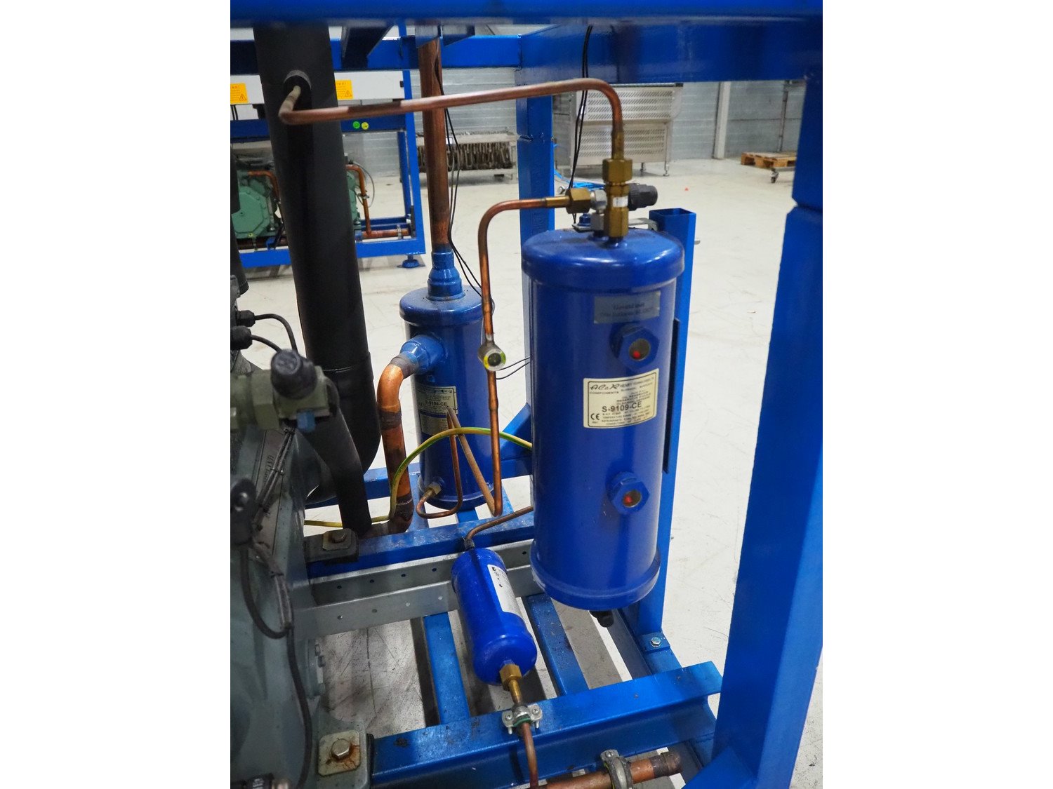 Carrier compressor rack consisting of 5 DWM copeland cooling compressors, model: (2x) DLSGP-40X-EWL, capacity: (2x) 22.50 m³ per hour, model: (3x) D3DS5-150X-AWM/D, capacity: (3x) 49.90 m³ per hour, dimensions: 2200 mm x 900 mm x 1700 mm.