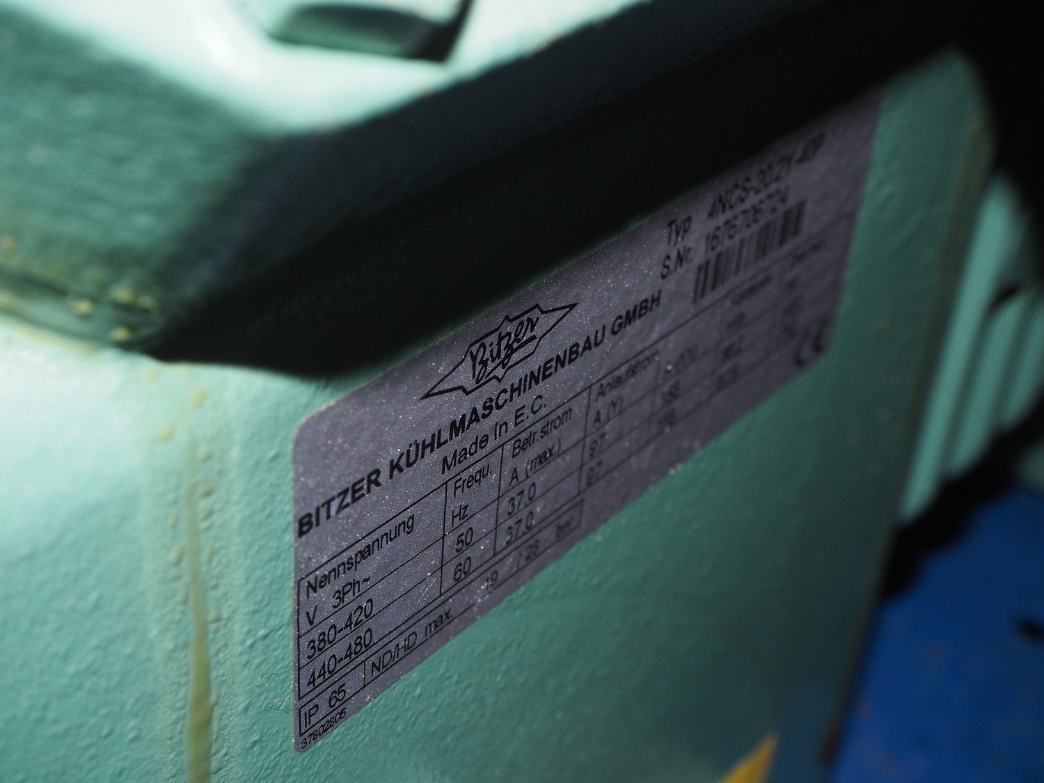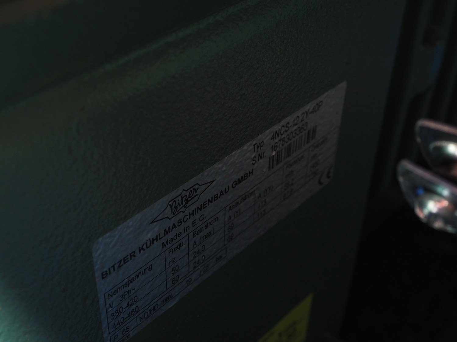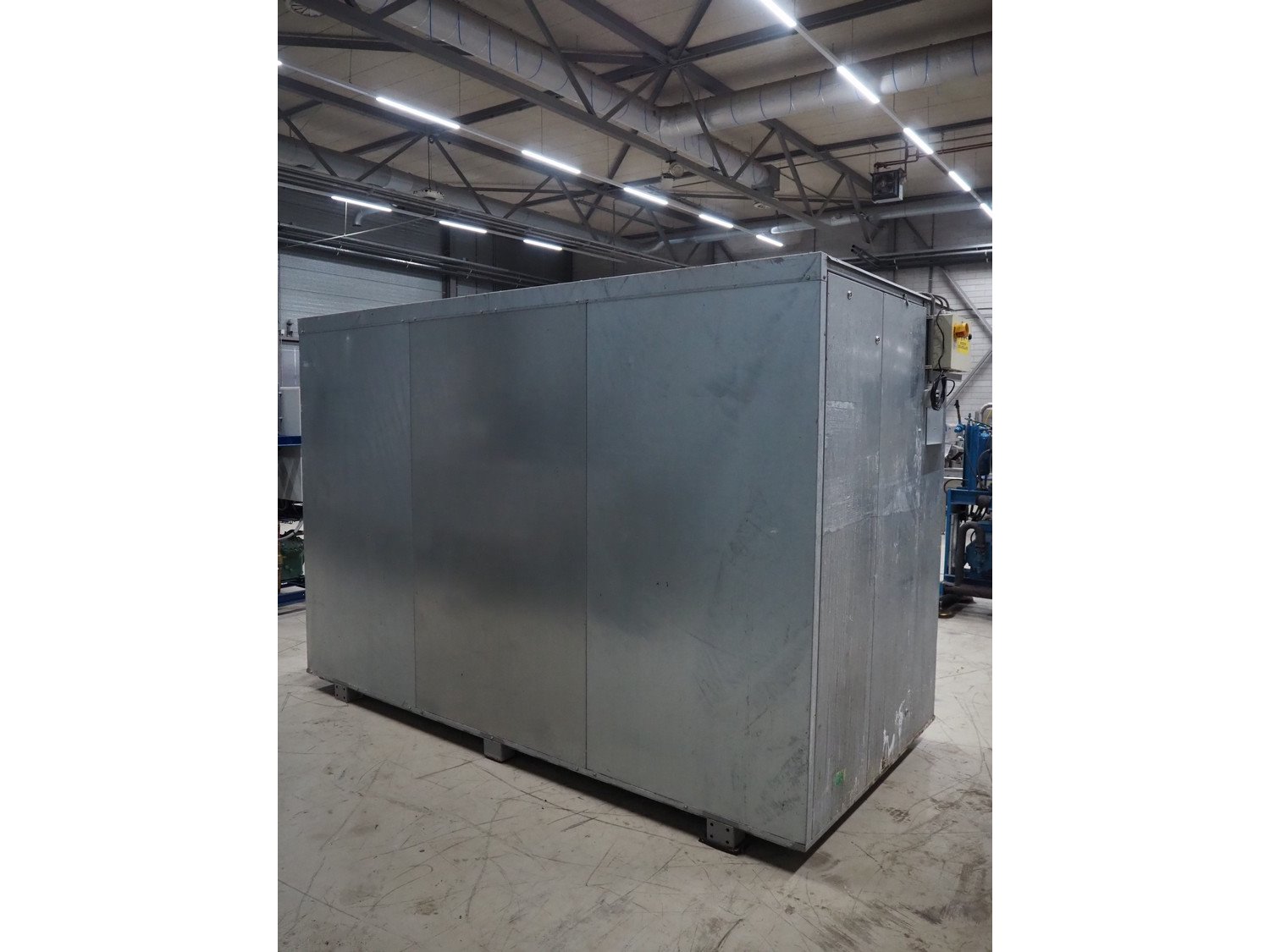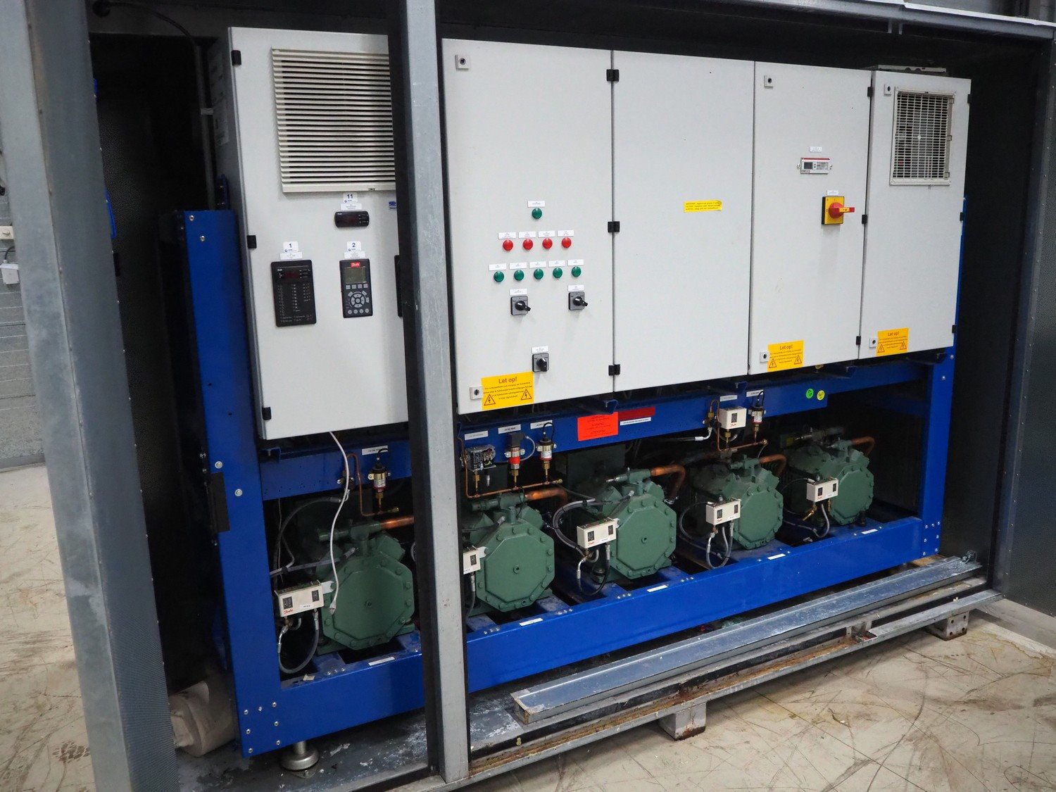 ProFroid Industries S.A. compressor rack in noise cancelling cabinet consisting of 5 Bitzer cooling compressors, model: (2x) 4CC-6.2Y-40S, capacity: (2x) 32.5/39.2 m³ per hour, model: (3x) 4NCS-12.2Y-40P, dimensions: 3250 mm x 1600 mm x 2250 mm.