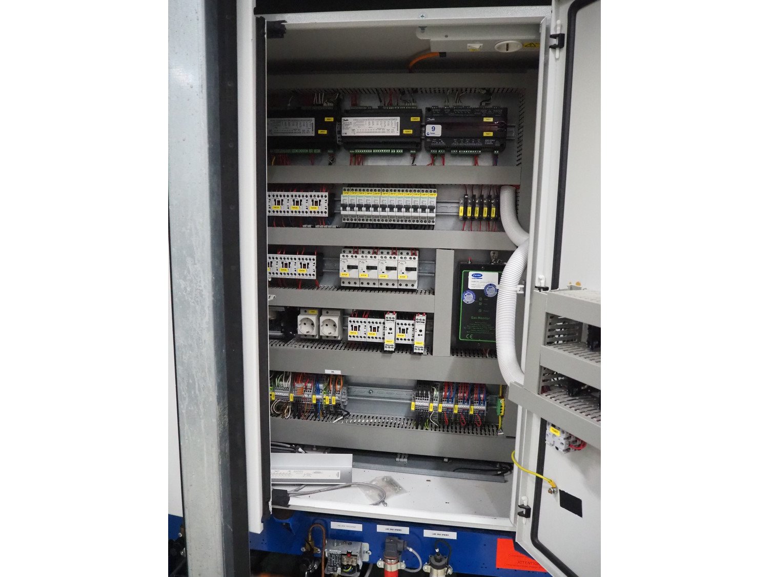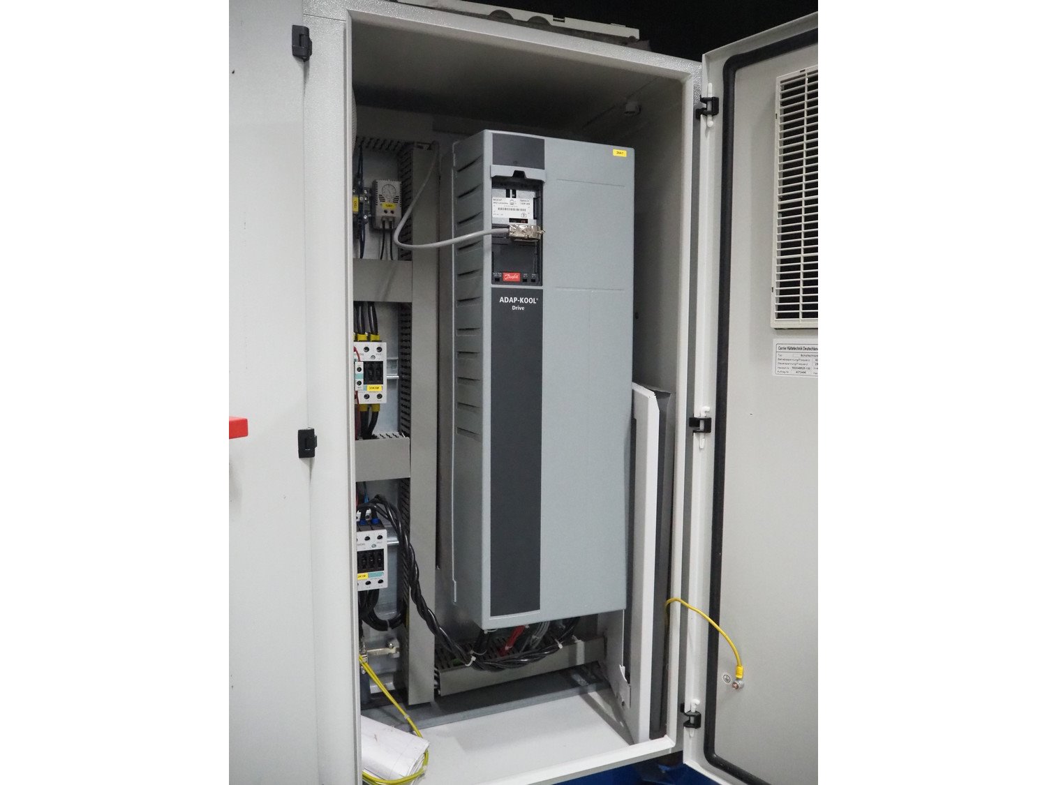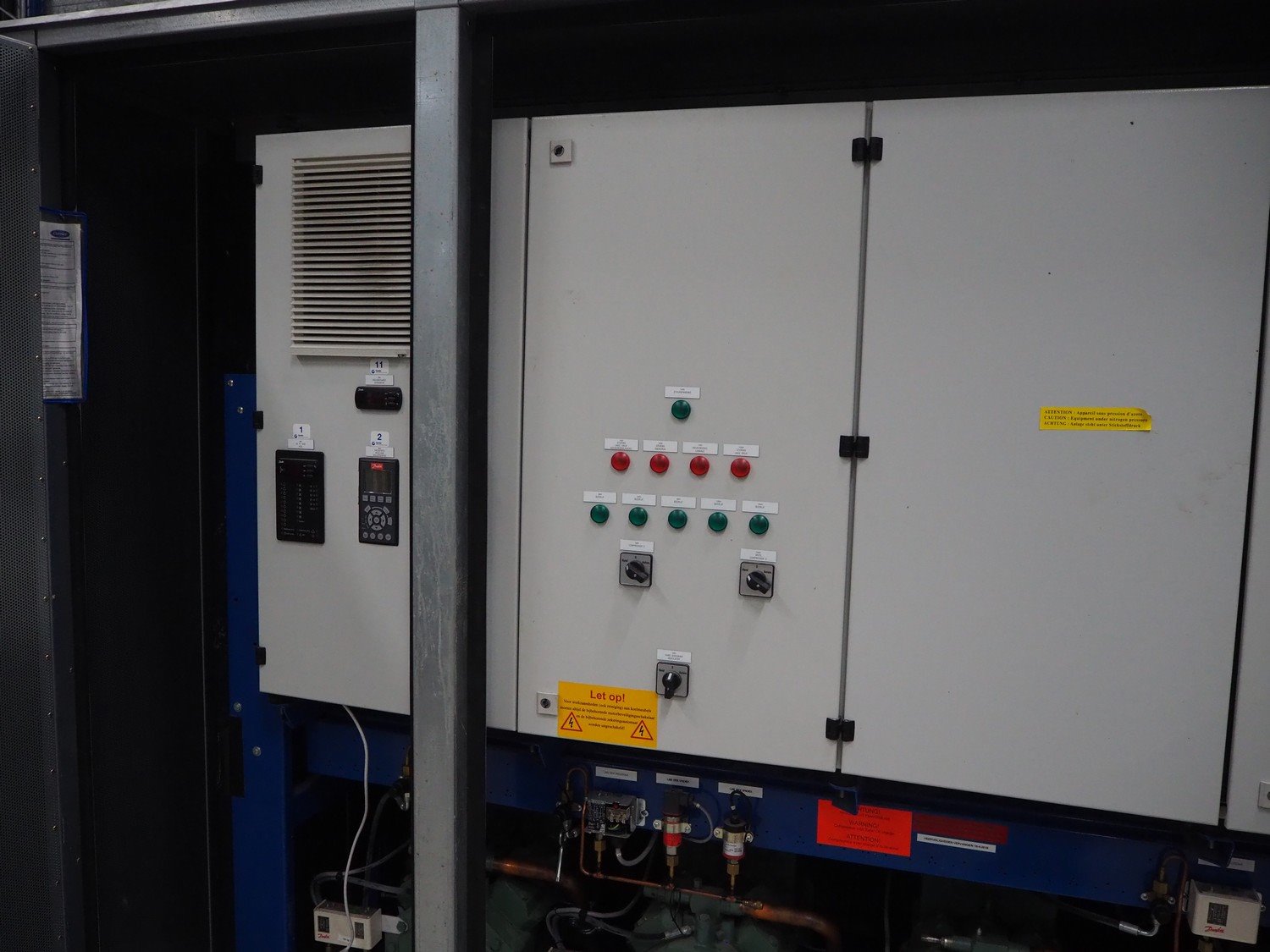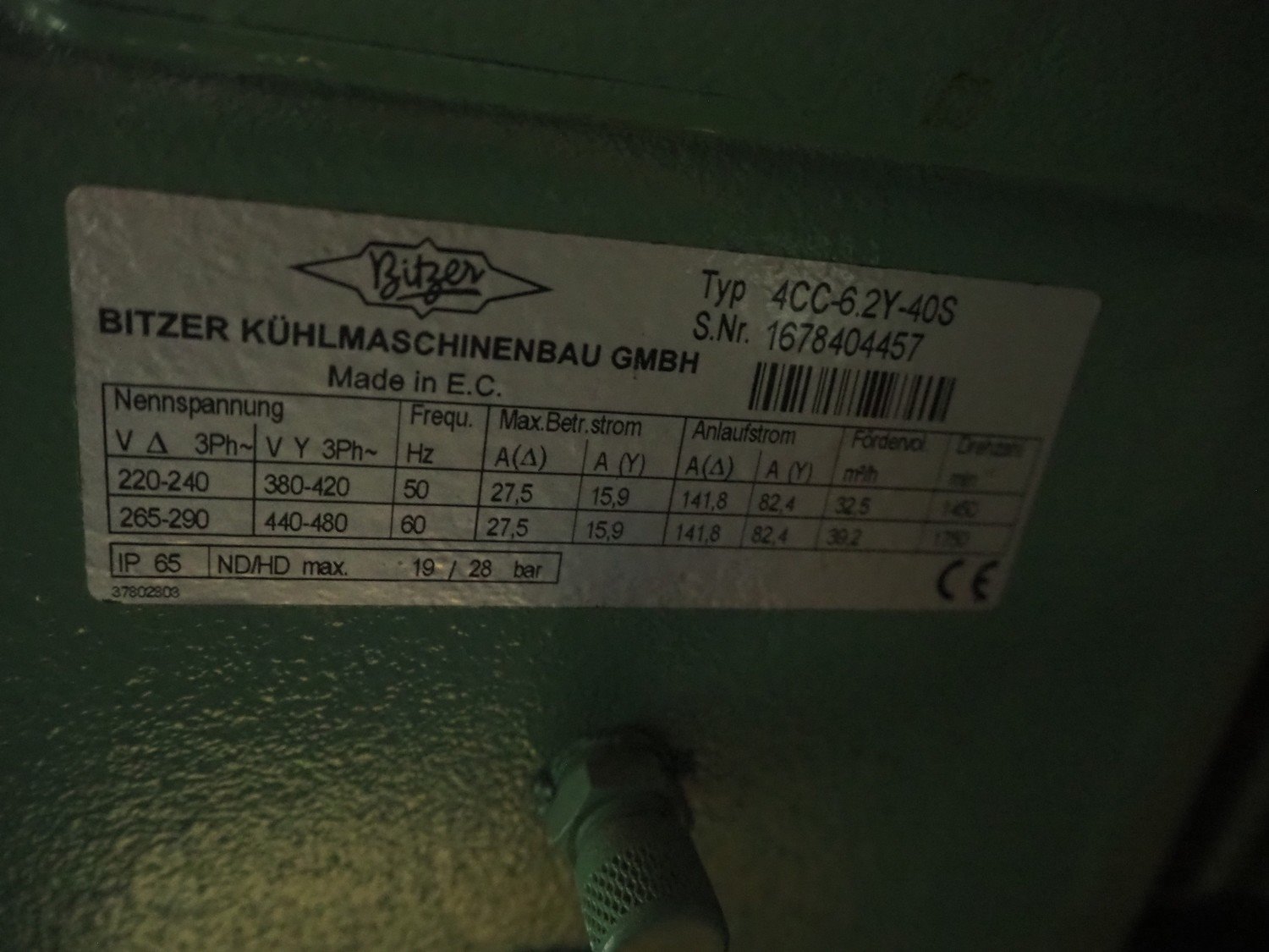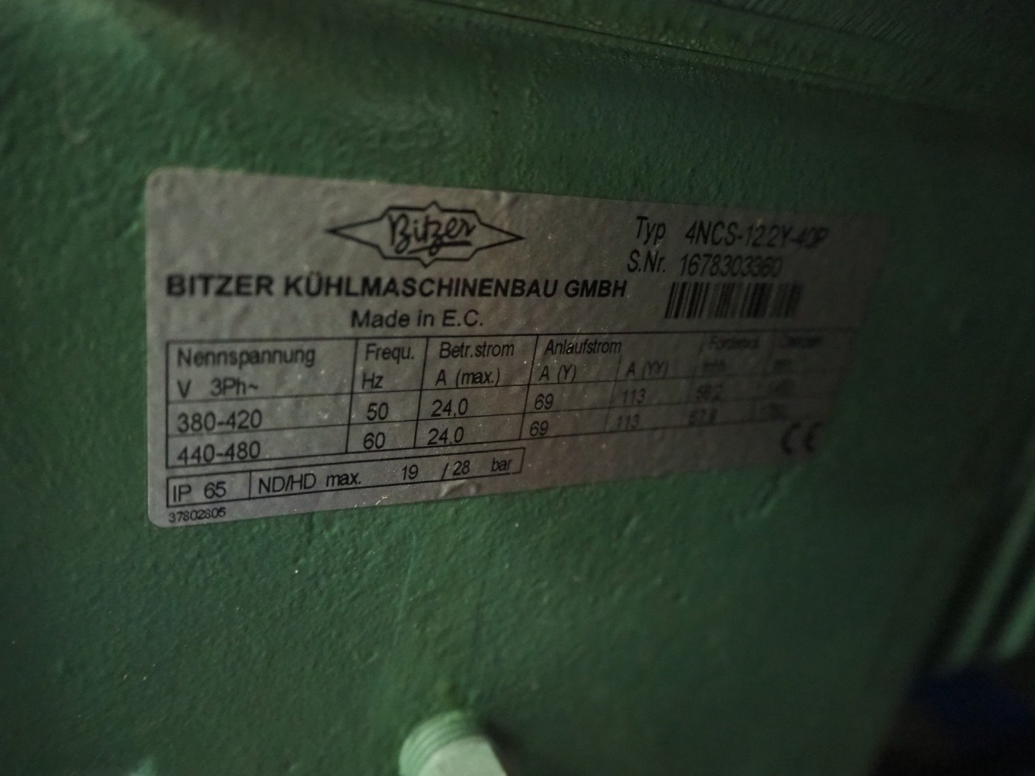 ProFroid Industries S.A. compressor rack in noise cancelling cabinet consisting of 5 Bitzer cooling compressors, model: (2x) 4CC-6.2Y-40S, capacity: (2x) 32.5/39.2 m³ per hour, model: (3x) 4NCS-12.2Y-40P, dimensions: 3250 mm x 1600 mm x 2250 mm.