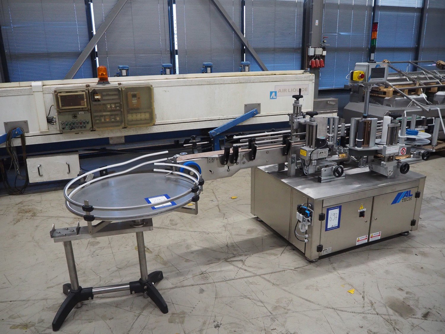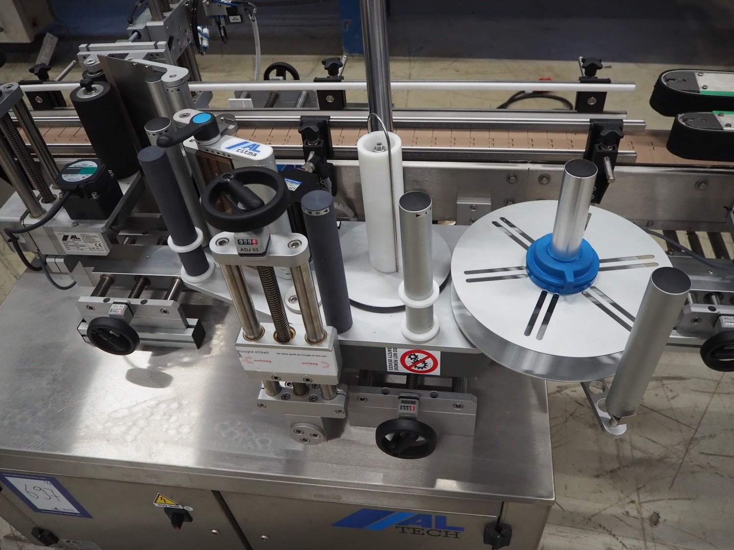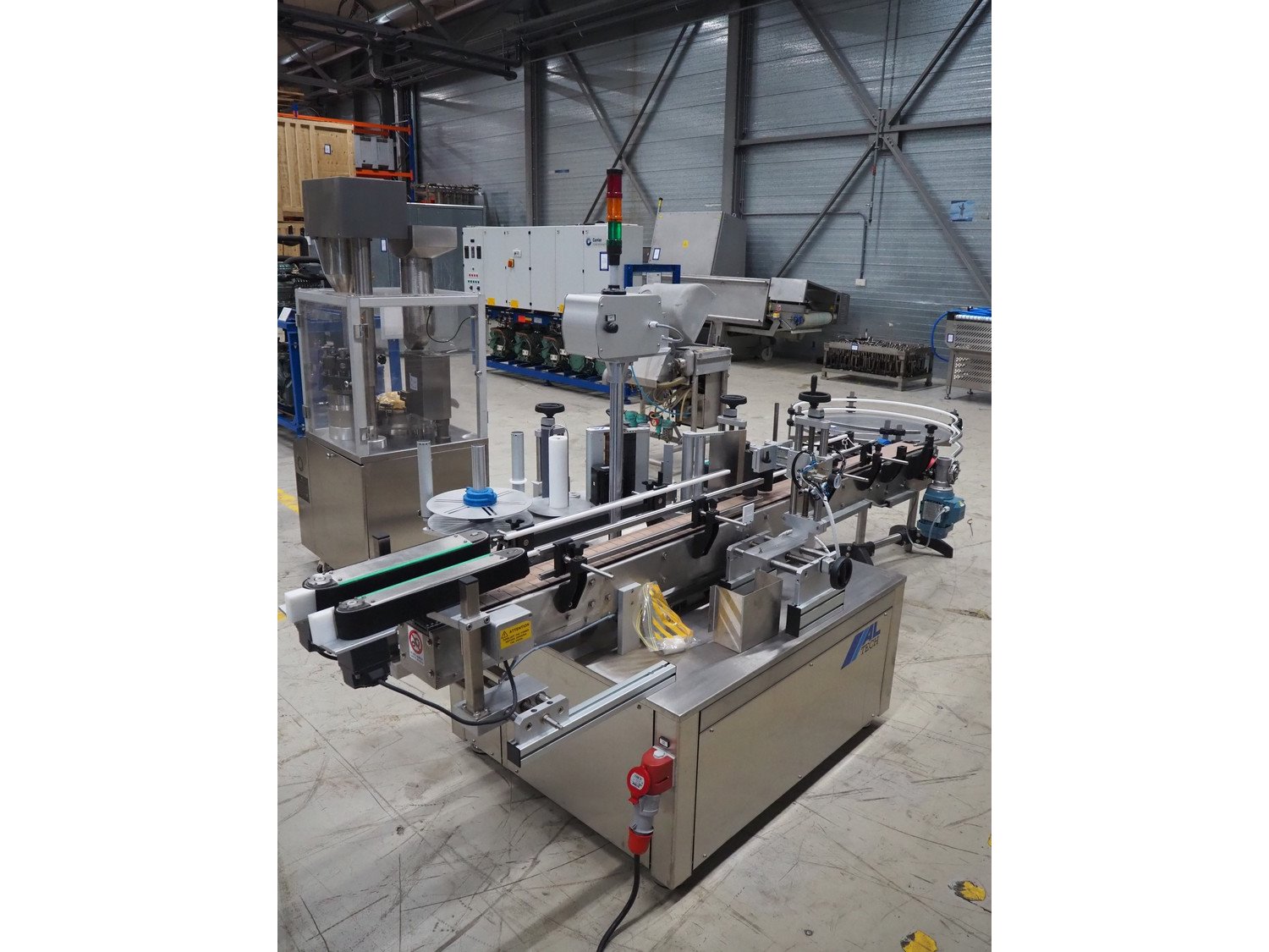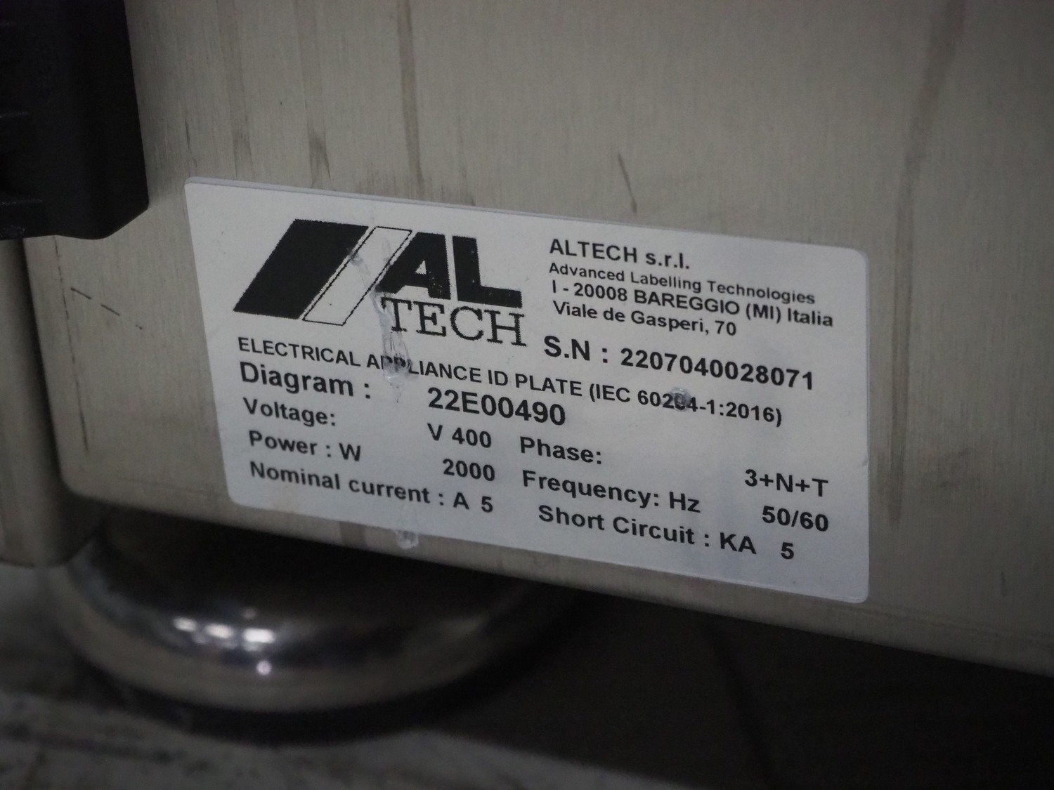 Altech s.r.l. labelling machine with turning table, serial number: 2207040028071, 400 V, 3 Ph, 50/60 Hz, 5 A, 2000 W, plastic belts, belt width: (2x) 55 mm, (1x) 115 mm, total dimensions: 2850 mm x 1150 mm x 1900 mm. With s/s turning table, diameter: 800 mm, total dimensions: 1050 mm x 900 mm x 930 mm.