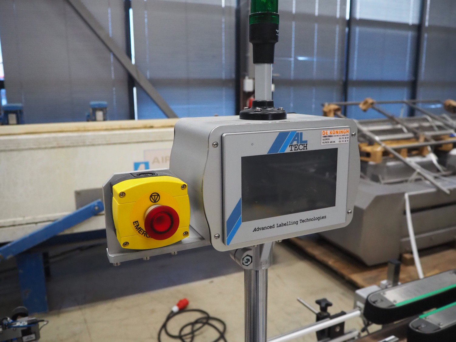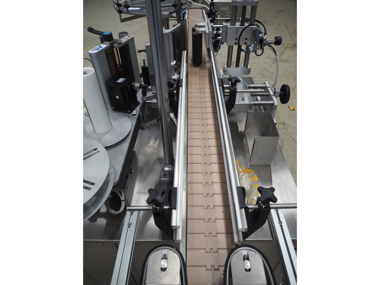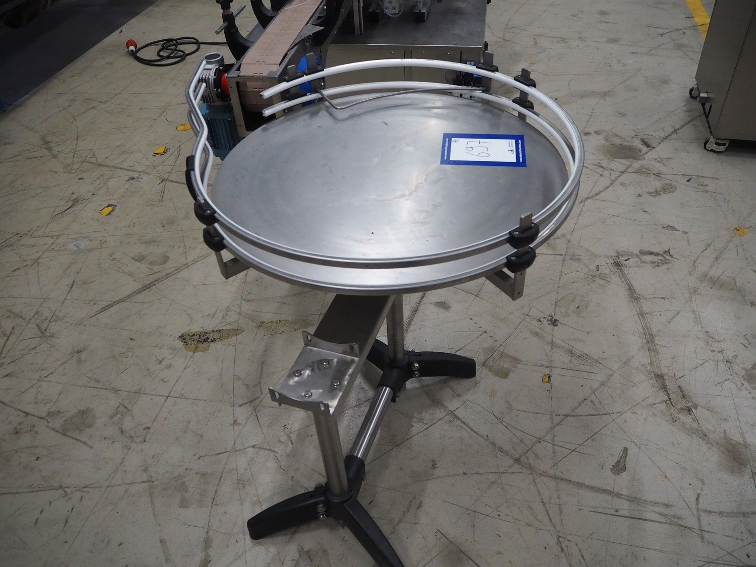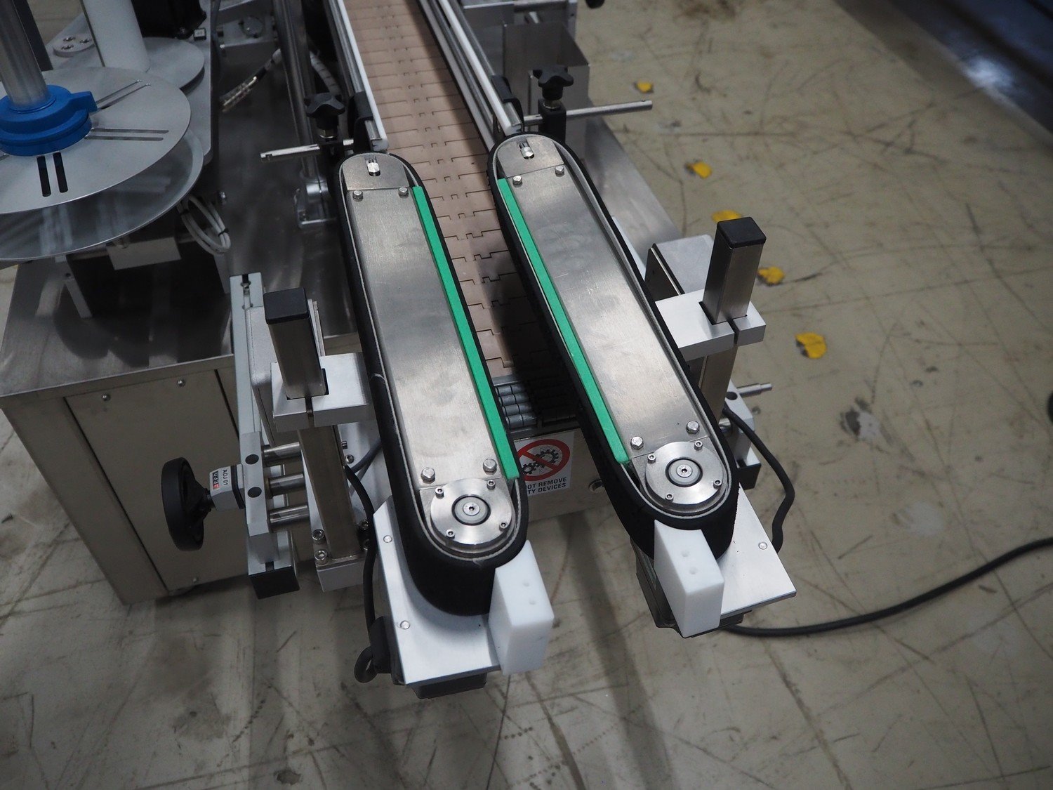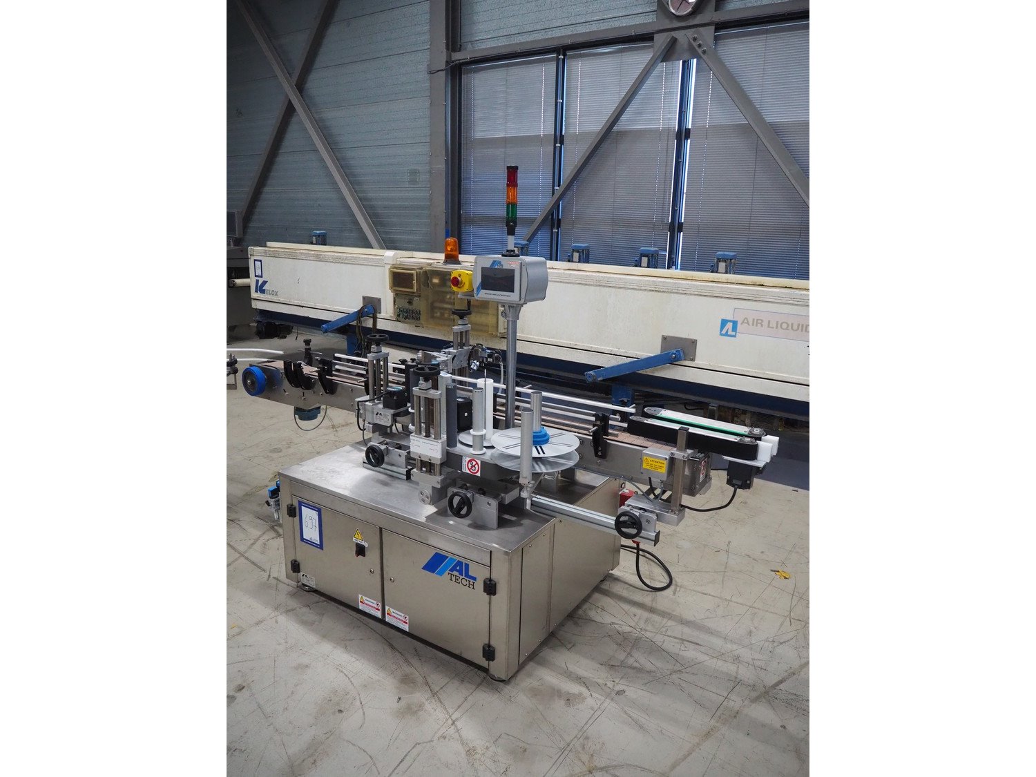 Altech s.r.l. labelling machine with turning table, serial number: 2207040028071, 400 V, 3 Ph, 50/60 Hz, 5 A, 2000 W, plastic belts, belt width: (2x) 55 mm, (1x) 115 mm, total dimensions: 2850 mm x 1150 mm x 1900 mm. With s/s turning table, diameter: 800 mm, total dimensions: 1050 mm x 900 mm x 930 mm.