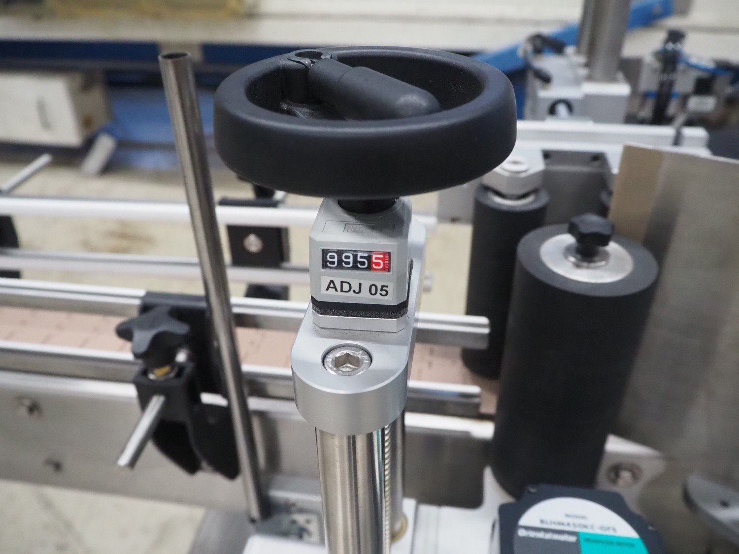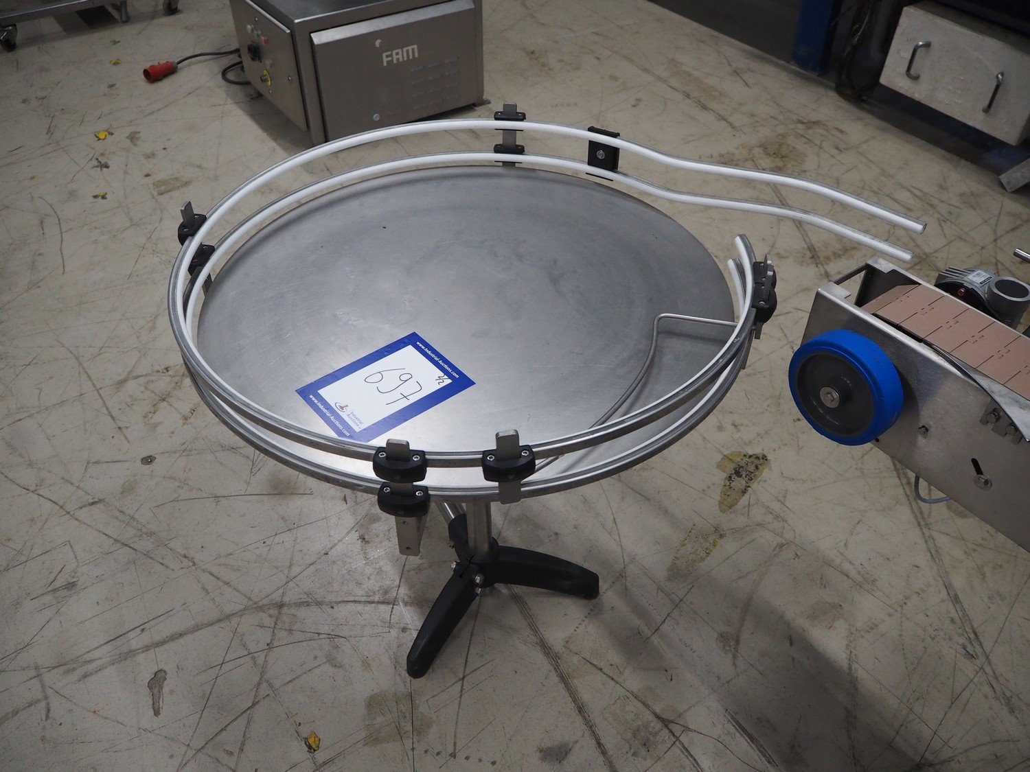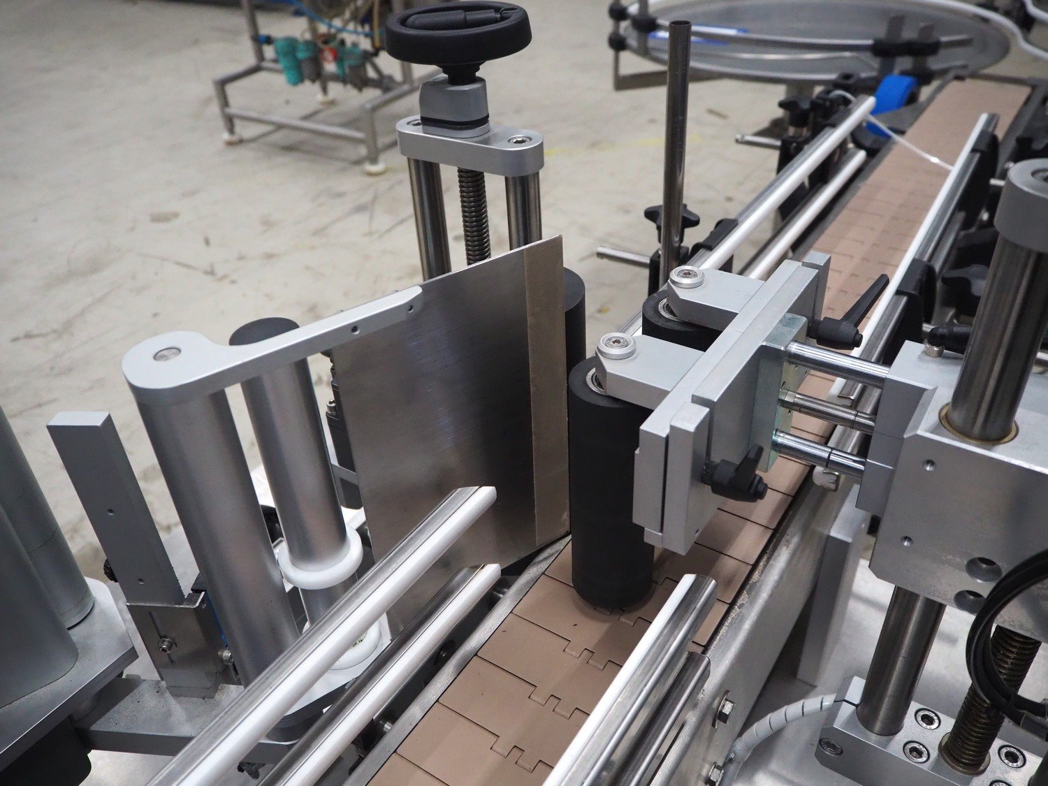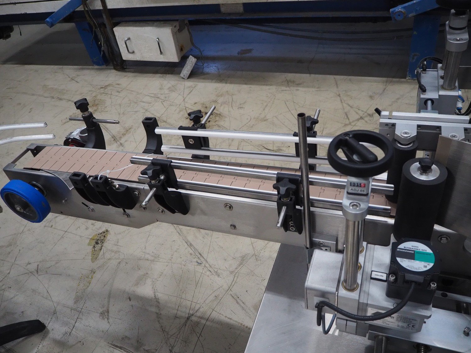 Altech s.r.l. labelling machine with turning table, serial number: 2207040028071, 400 V, 3 Ph, 50/60 Hz, 5 A, 2000 W, plastic belts, belt width: (2x) 55 mm, (1x) 115 mm, total dimensions: 2850 mm x 1150 mm x 1900 mm. With s/s turning table, diameter: 800 mm, total dimensions: 1050 mm x 900 mm x 930 mm.