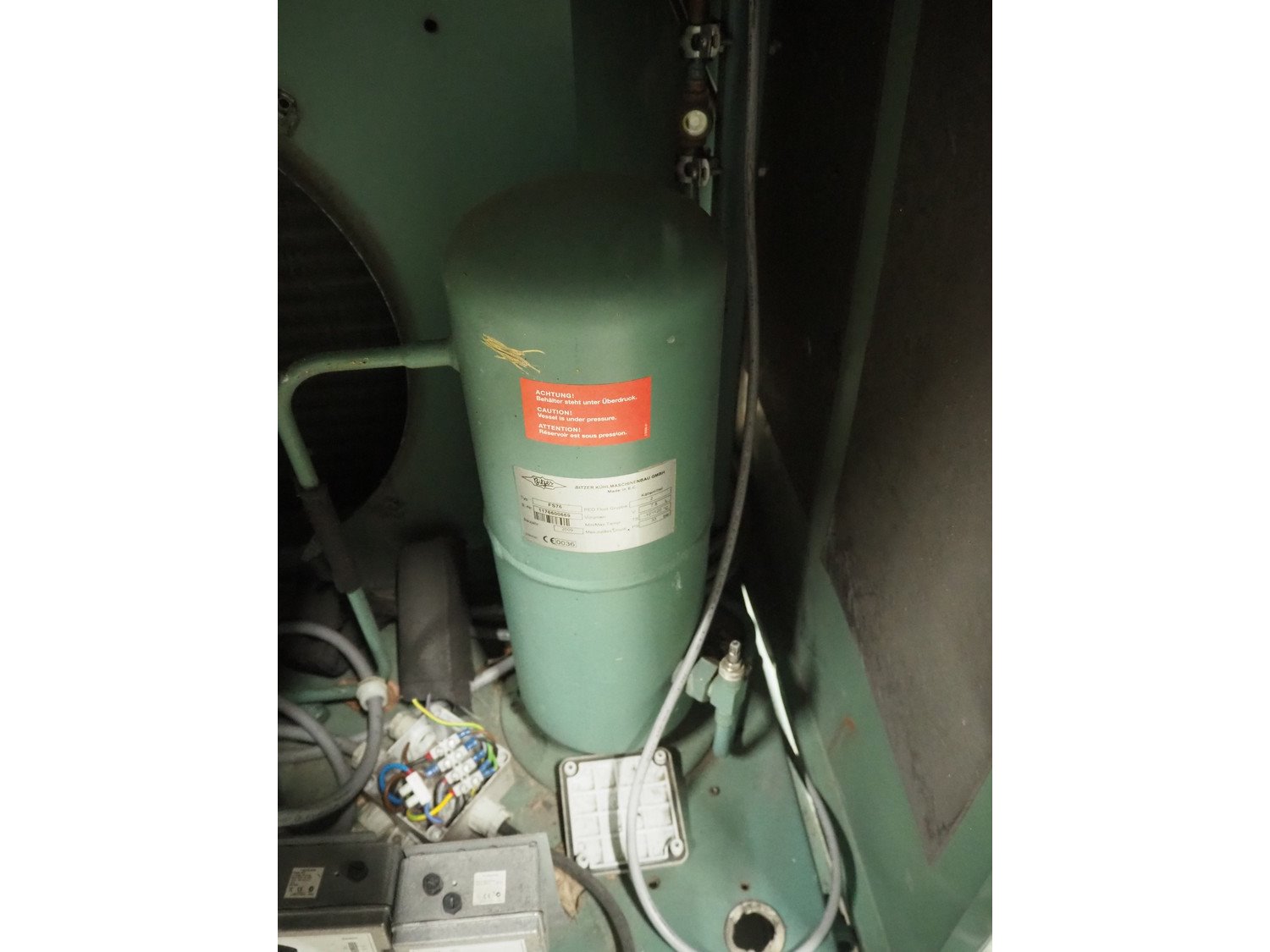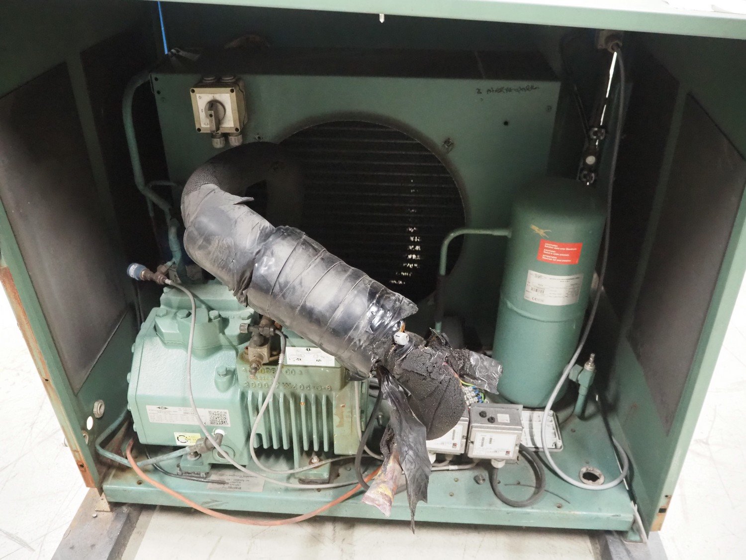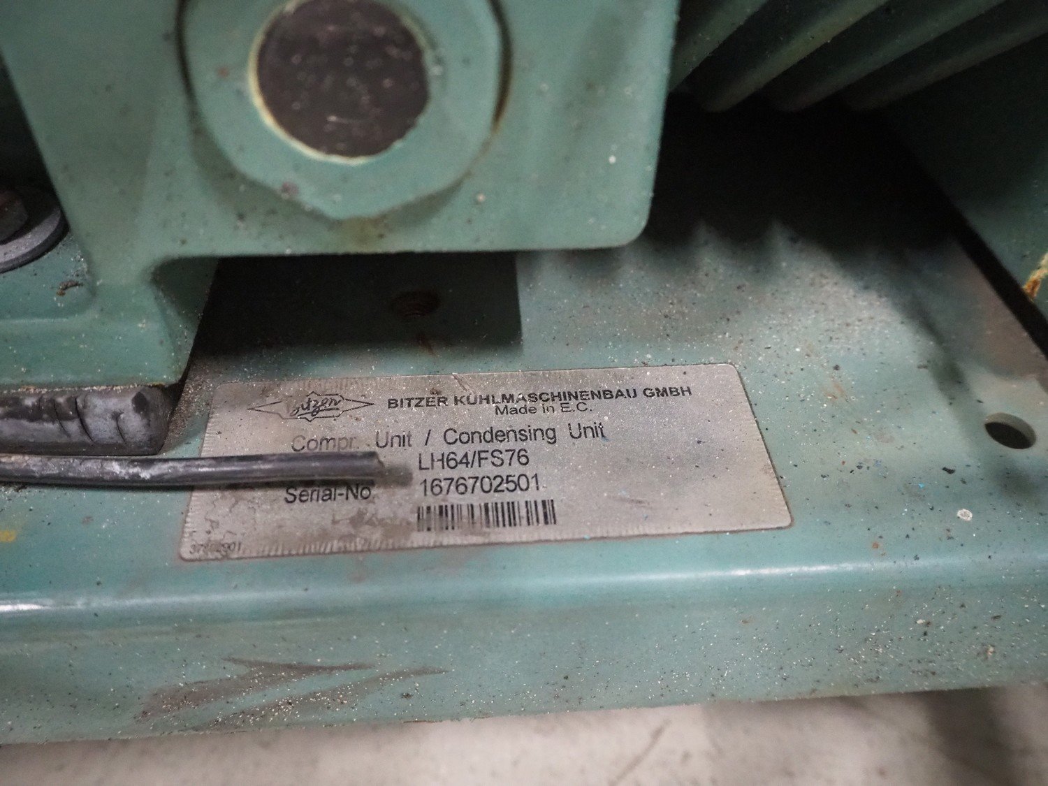 Bitzer Kühlmaschinenbau GmbH condensing unit with cooling compressor, type condensing unit: FS76, serial number: 1676702501, type cooling compressor: 2CES-3Y-40S, serial number: 1696313488, capacity: 16.2/19.4 m³ per hour, dimensions: 900 mm x 1070 mm x 930 mm.