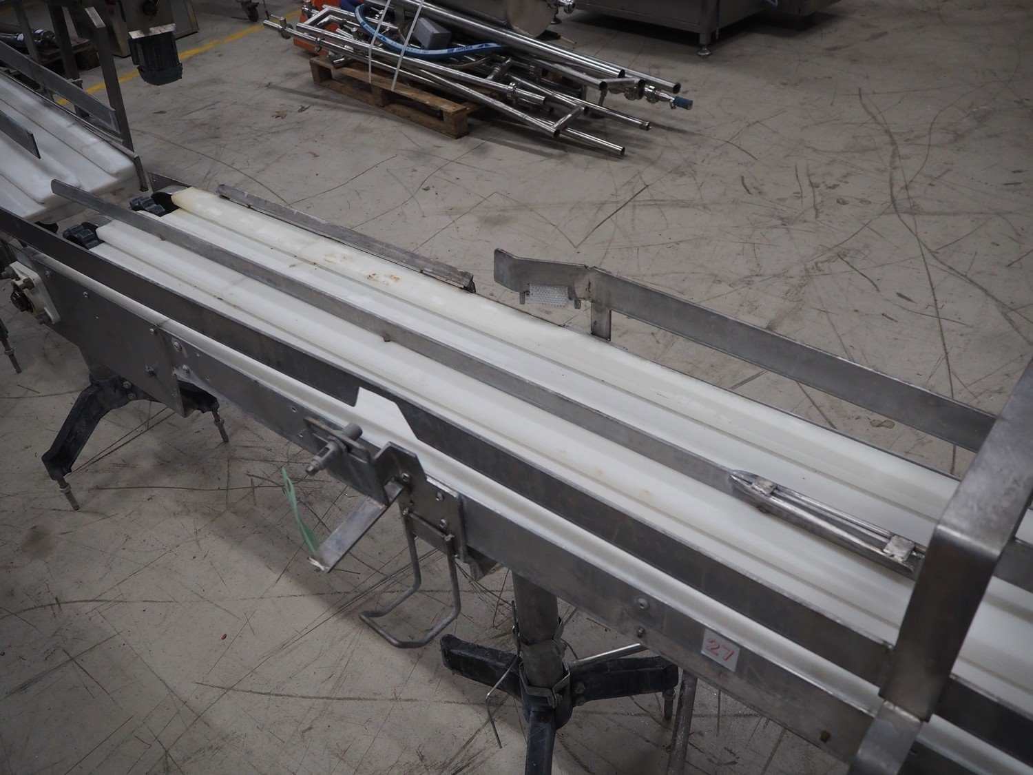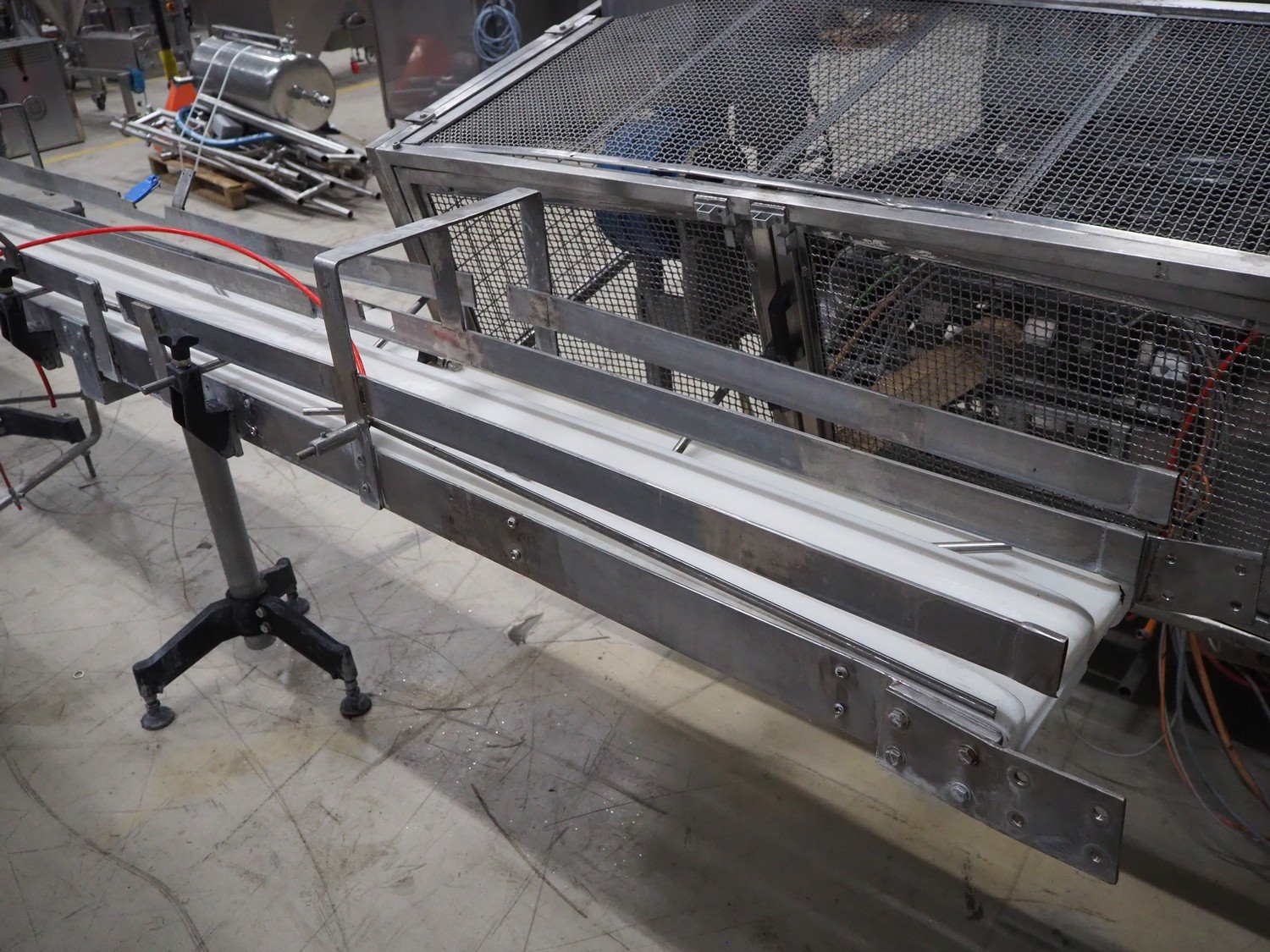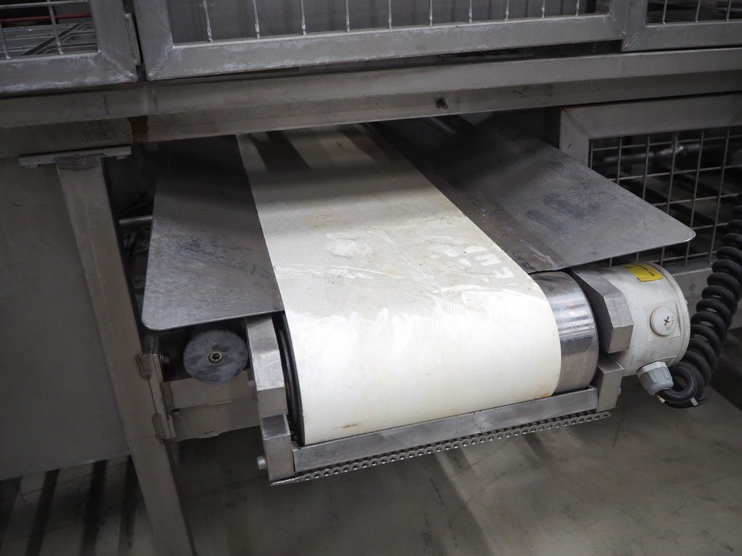 O.G. Hoyer A/S tray filling line, consisting of: Tray denester, plastic belts, belt width: (6x) 30 mm, 3 lanes, lane width: (3x) 150 mm, clearance: (3x) 145 mm x 145 mm, total dimensions: 1940 mm x 770 mm x 1830 mm. O.G. Hoyer A/S tray filler, type: CC2, number: 2502-1903, year of construction: 07-1987, 380 V, 3 Ph, 50 Hz, 10 kW, dimensions dye: (3x) 145 mm x 145 mm, total dimensions: 5550 mm x 1360 mm x 2600 mm. Transport belt, s/s frame, belt width: 140 mm, total dimensions: 4000 mm x 500 mm x 1050 mm. Curve conveyor, s/s frame, bel width: 140 mm, total dimensions: 2250 mm x 1700 mm x 1300 mm. 3 s/s trolleys with parts and dye's, dimensions dye: (3x) 180 mm x 120 mm, total dimensions: 1930 mm x 1000 mm x 1200 mm, 1000 mm x 760 mm x 1120 mm and 1350 mm x 730 mm x 1960 mm. 2 pallets with plastic belts, belt width: 140 mm, total dimensions: 1200 mm x 800 mm x 520 mm and 1200 mm x 800 mm x 380 mm.