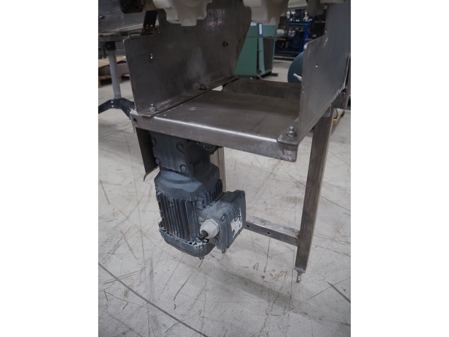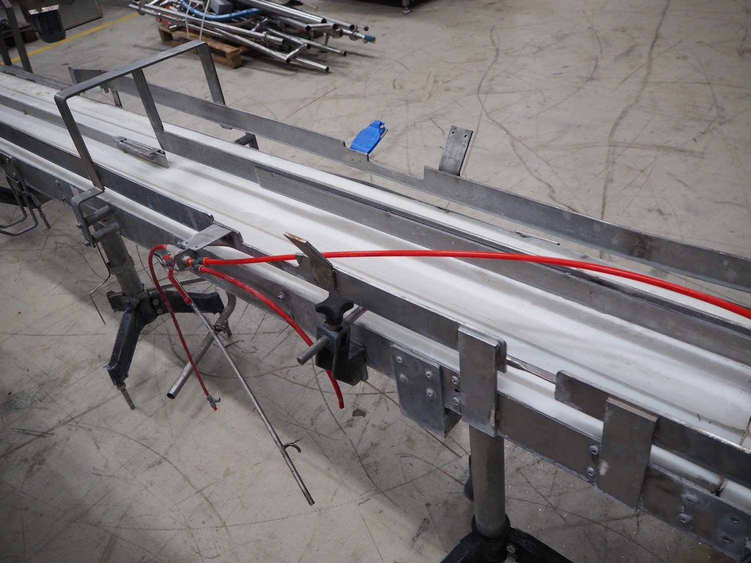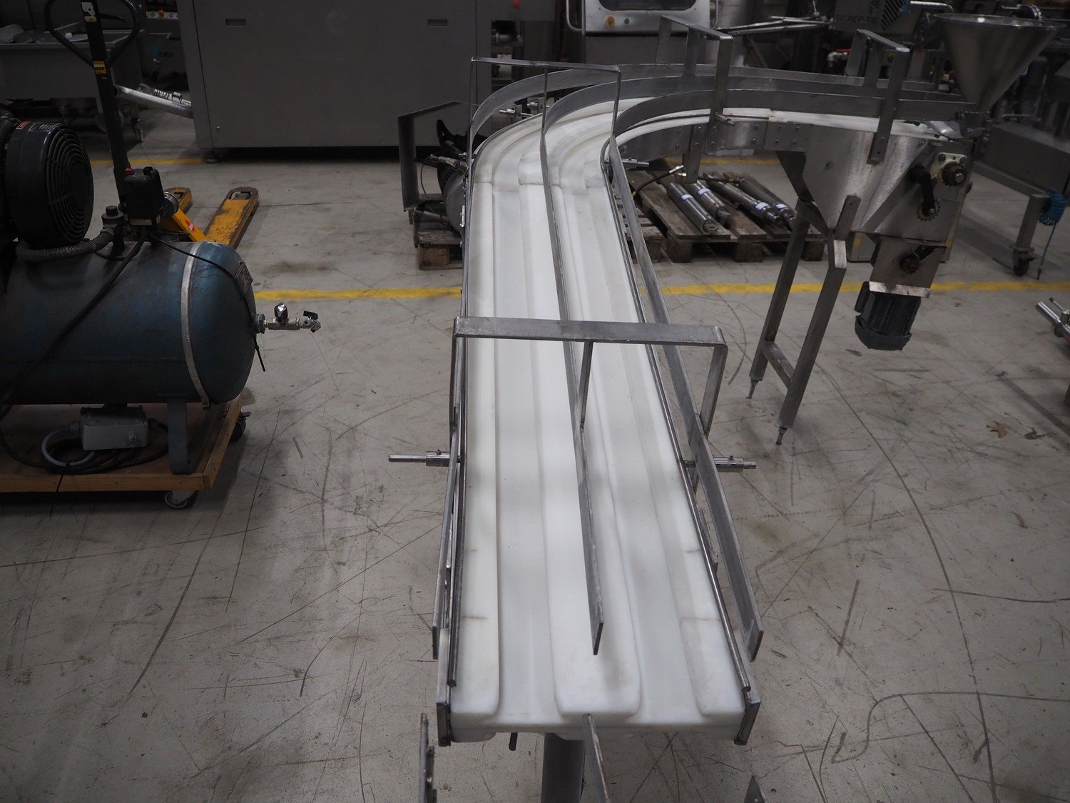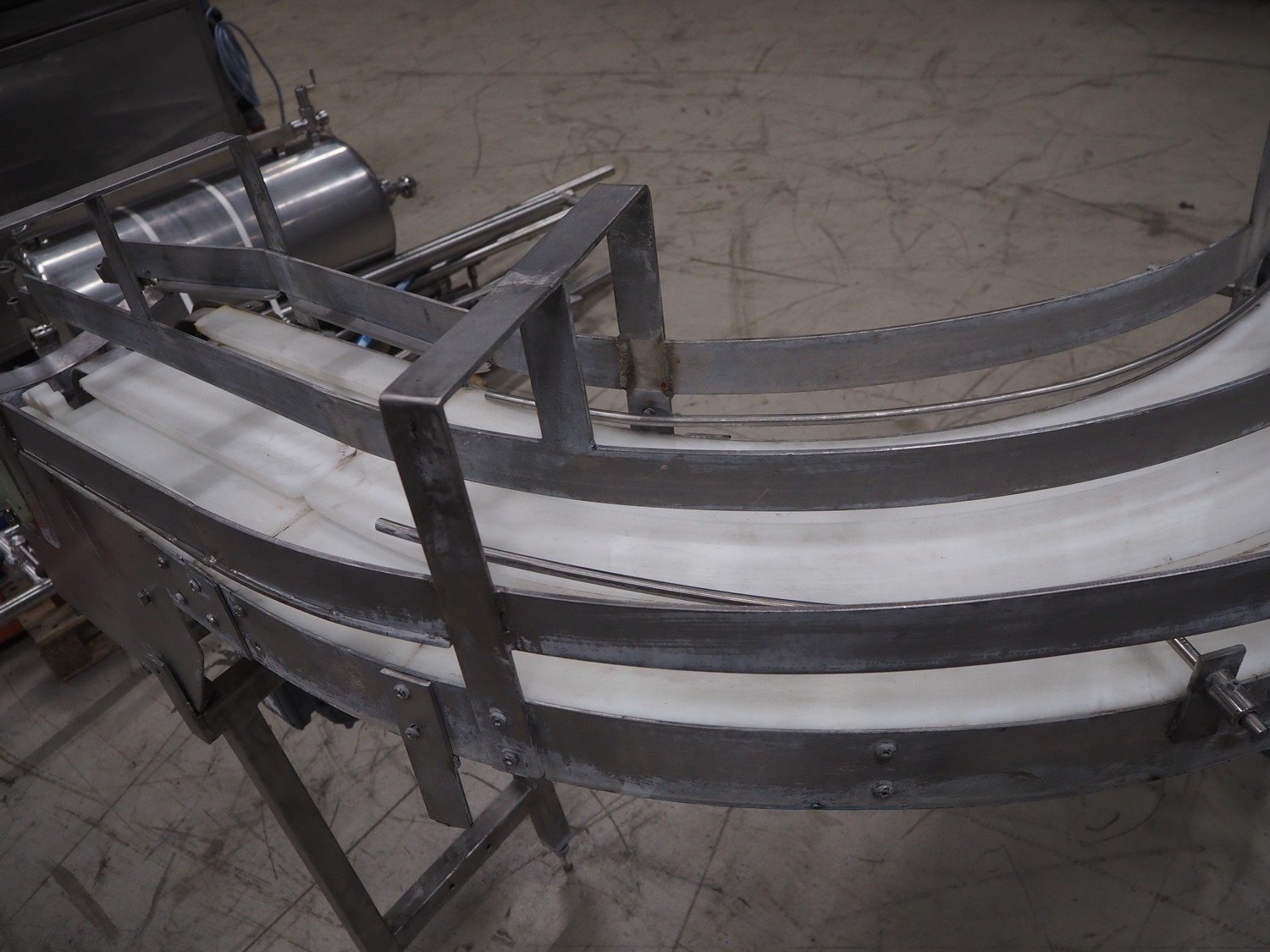 O.G. Hoyer A/S tray filling line, consisting of: Tray denester, plastic belts, belt width: (6x) 30 mm, 3 lanes, lane width: (3x) 150 mm, clearance: (3x) 145 mm x 145 mm, total dimensions: 1940 mm x 770 mm x 1830 mm. O.G. Hoyer A/S tray filler, type: CC2, number: 2502-1903, year of construction: 07-1987, 380 V, 3 Ph, 50 Hz, 10 kW, dimensions dye: (3x) 145 mm x 145 mm, total dimensions: 5550 mm x 1360 mm x 2600 mm. Transport belt, s/s frame, belt width: 140 mm, total dimensions: 4000 mm x 500 mm x 1050 mm. Curve conveyor, s/s frame, bel width: 140 mm, total dimensions: 2250 mm x 1700 mm x 1300 mm. 3 s/s trolleys with parts and dye's, dimensions dye: (3x) 180 mm x 120 mm, total dimensions: 1930 mm x 1000 mm x 1200 mm, 1000 mm x 760 mm x 1120 mm and 1350 mm x 730 mm x 1960 mm. 2 pallets with plastic belts, belt width: 140 mm, total dimensions: 1200 mm x 800 mm x 520 mm and 1200 mm x 800 mm x 380 mm.