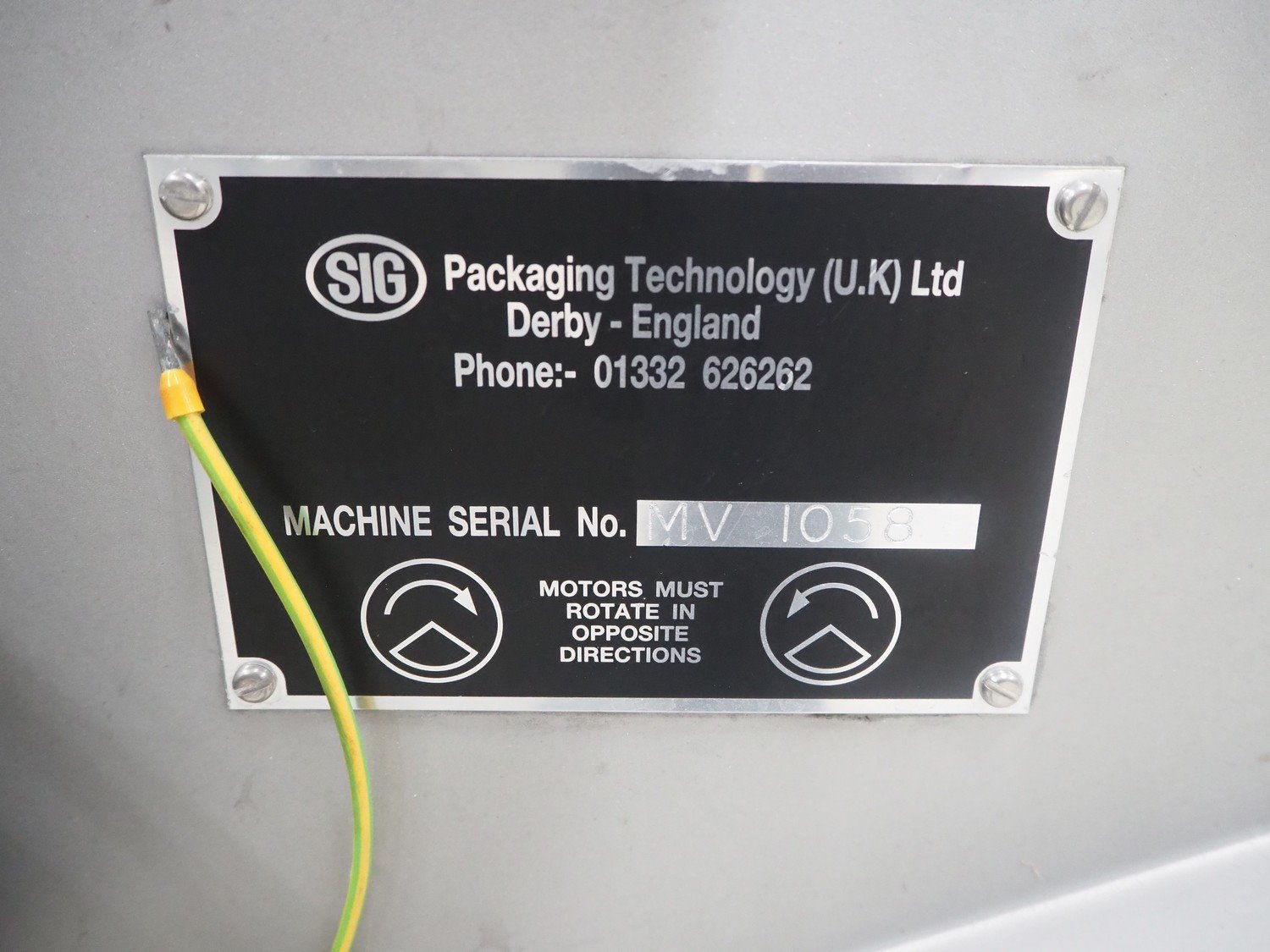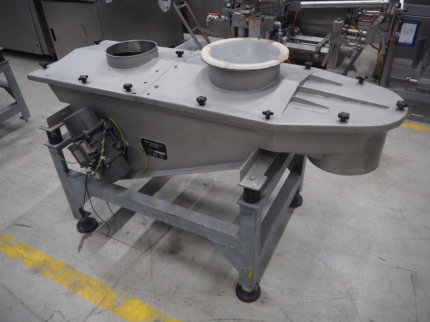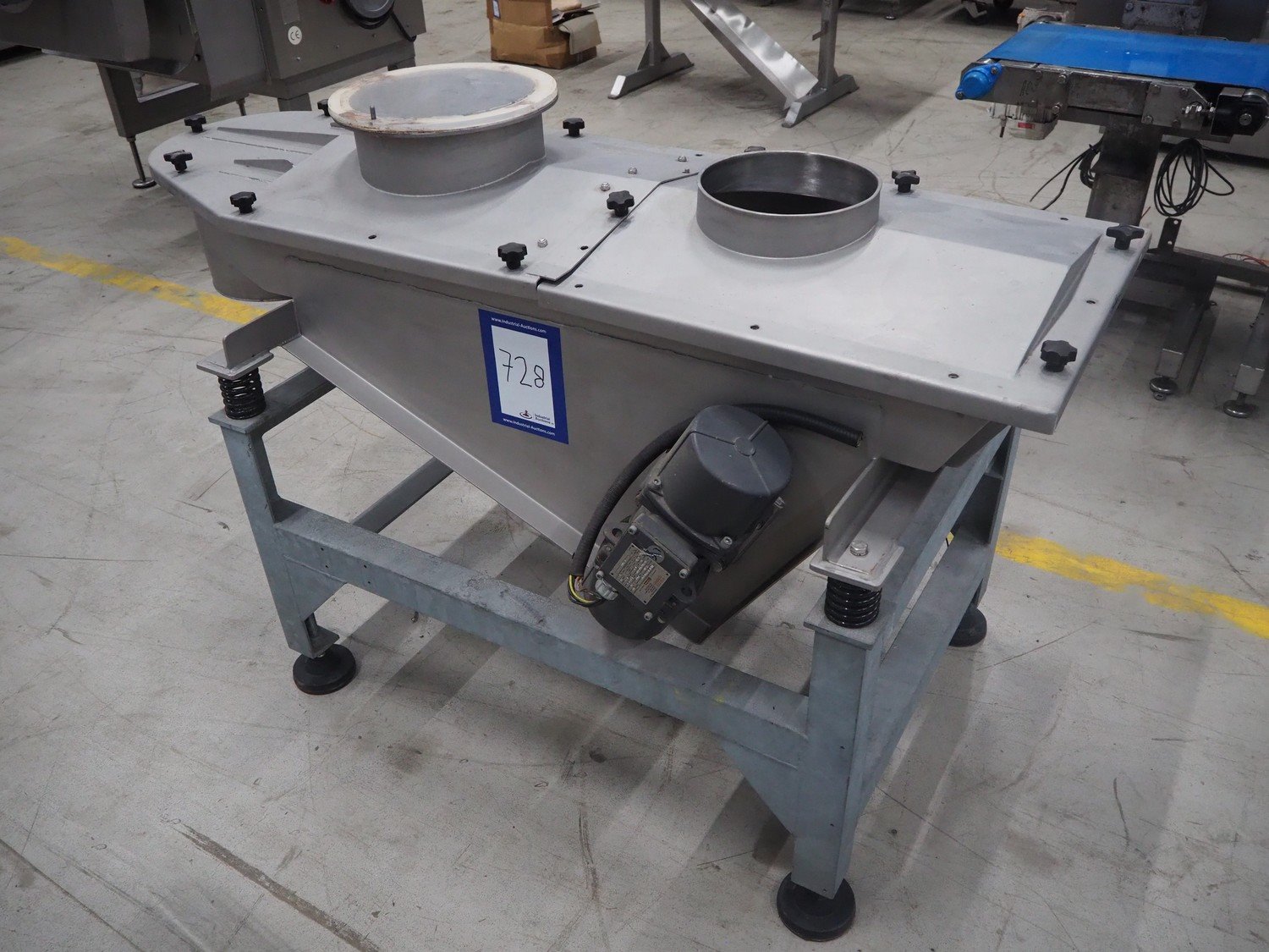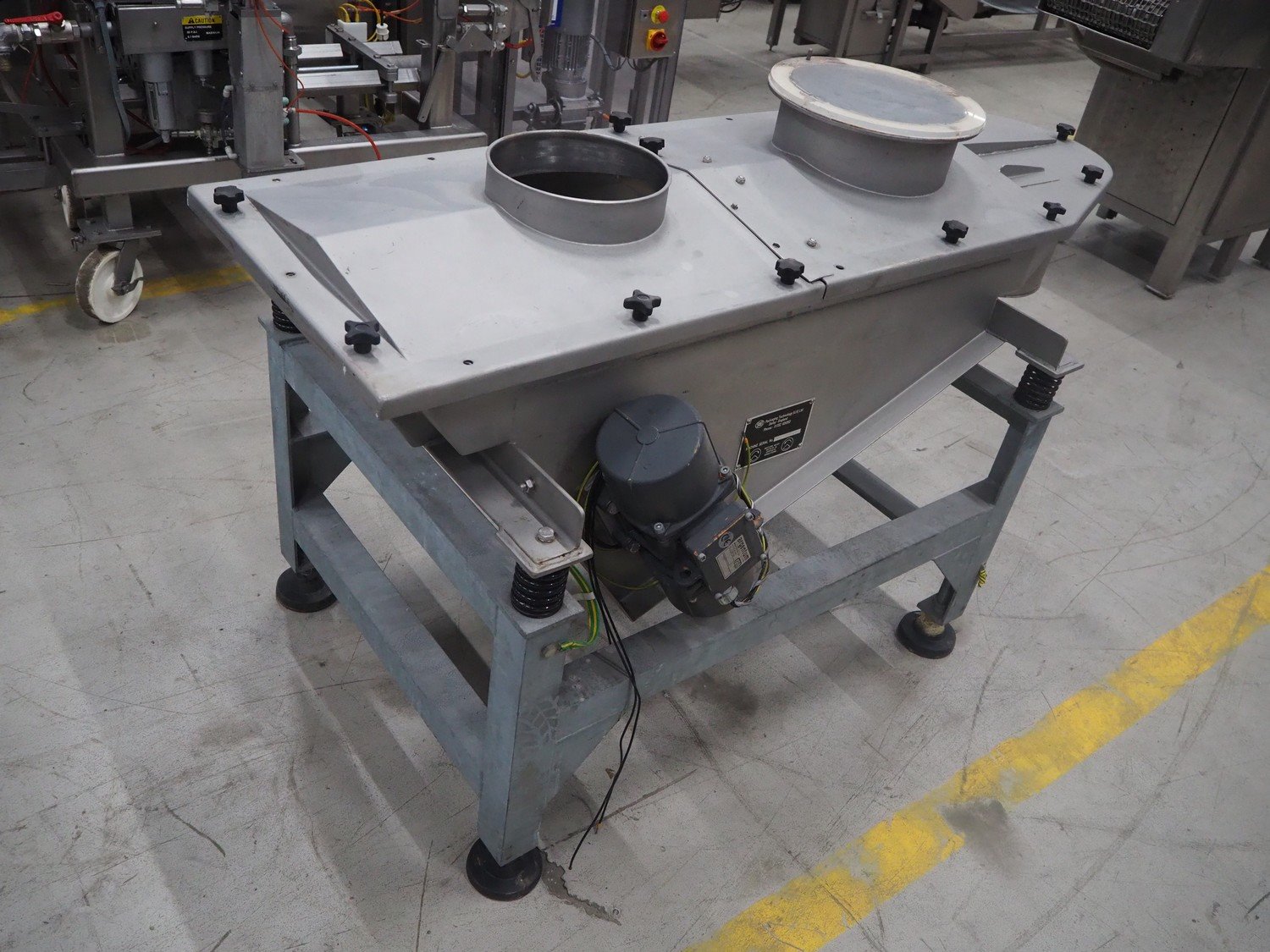 SIG Packaging Technology s/s vibrating gutter, serial number: MV 1058, gutter width: 500 mm, total dimensions: 1800 mm x 900 mm x 1100 mm.