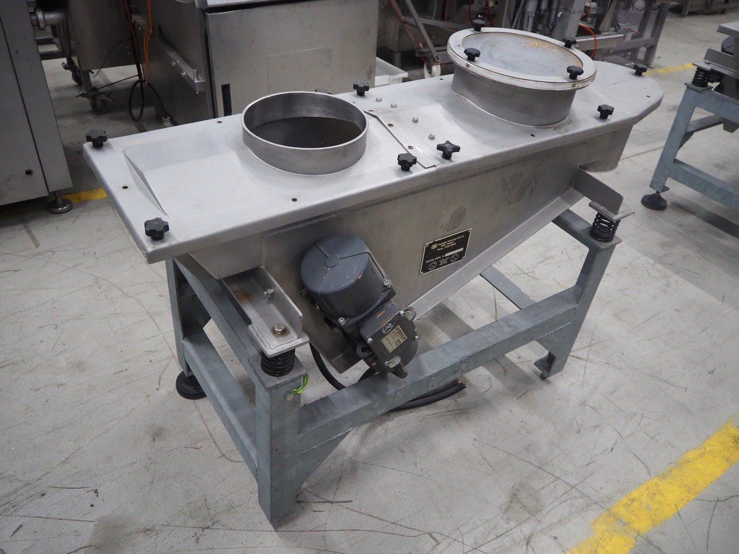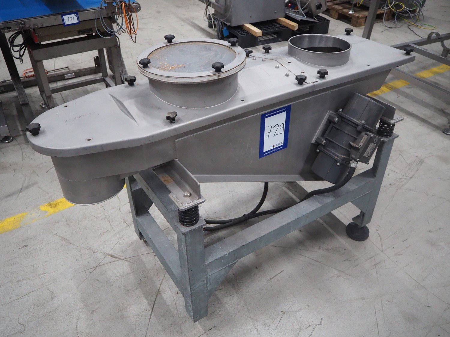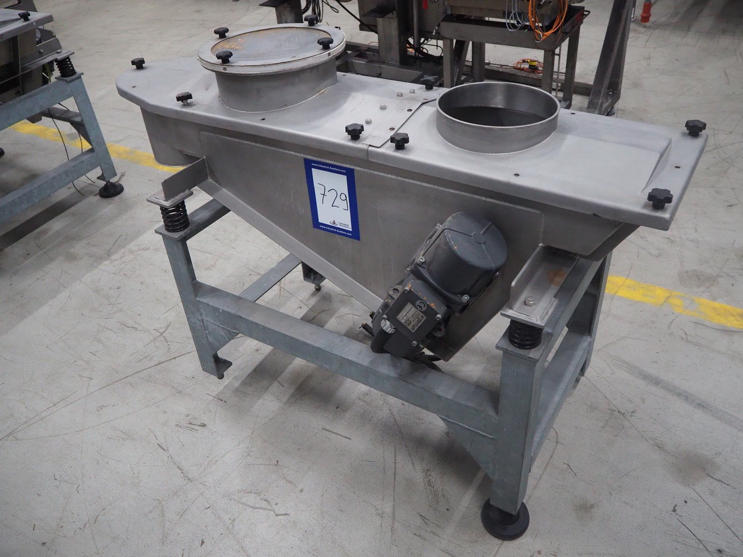 SIG Packaging Technology s/s vibrating gutter, serial number: MV 1059, gutter width: 300 mm, total dimensions: 1600 mm x 800 mm x 950 mm.