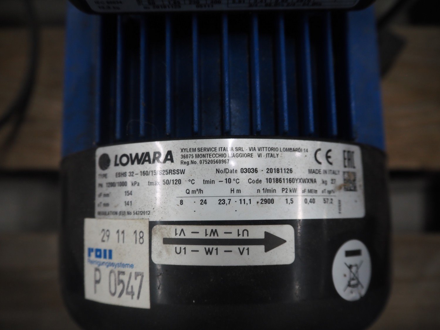 Lowara centrifugal pump, type: ESHS 32-160/15/S25RSSW, number: 03036, year of construction: 2018.11.26, capacity: 154 m³ per hour, dimensions: 490 mm x 250 mm x 300 mm.