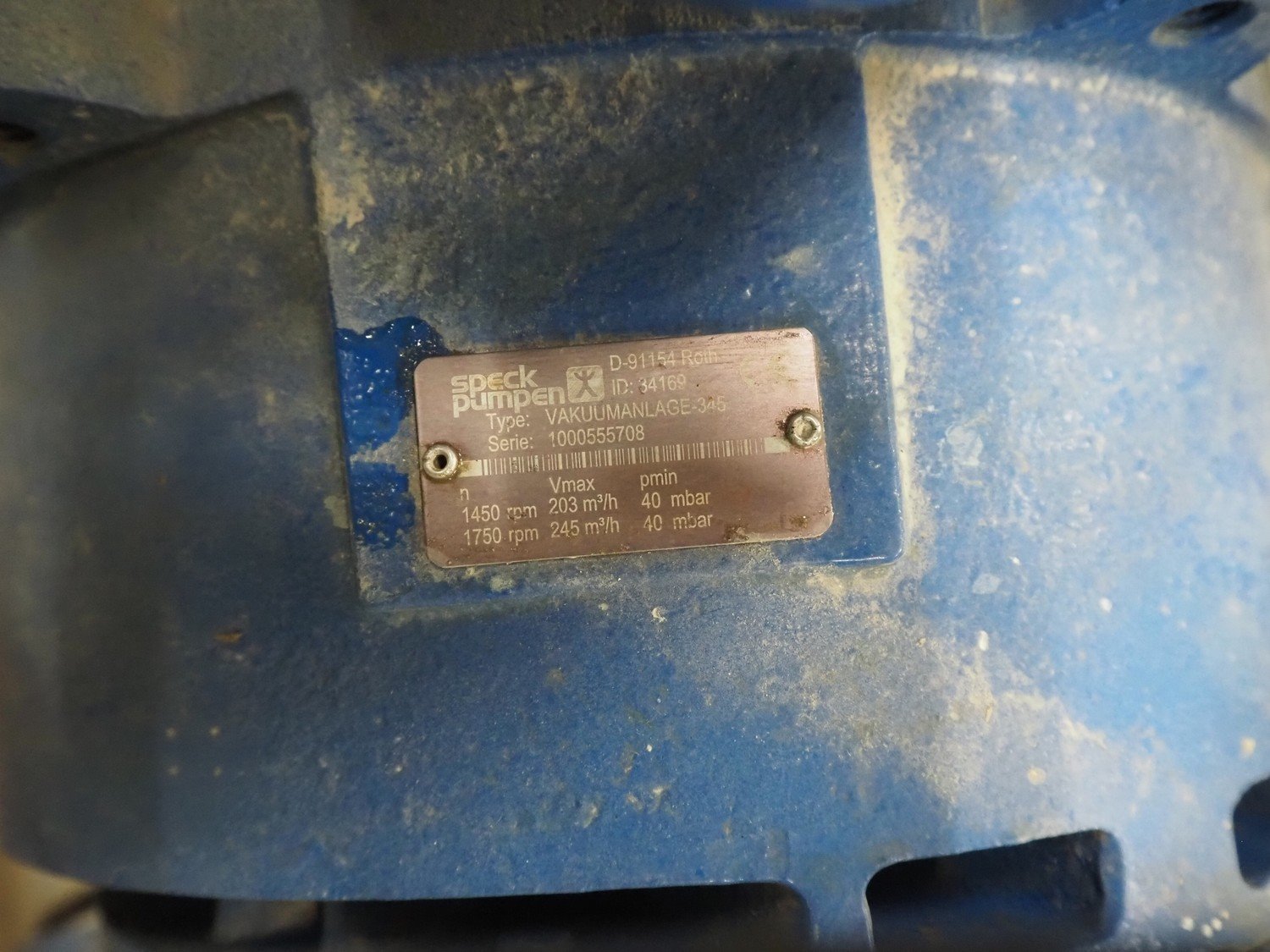 Speck Pumpen vacuum pump, type: Vakuumanlage-345, serial number: 1000555708, capacity: 203-245 m³ per hour, dimensions: 1100 mm x 350 mm x 1440 mm.