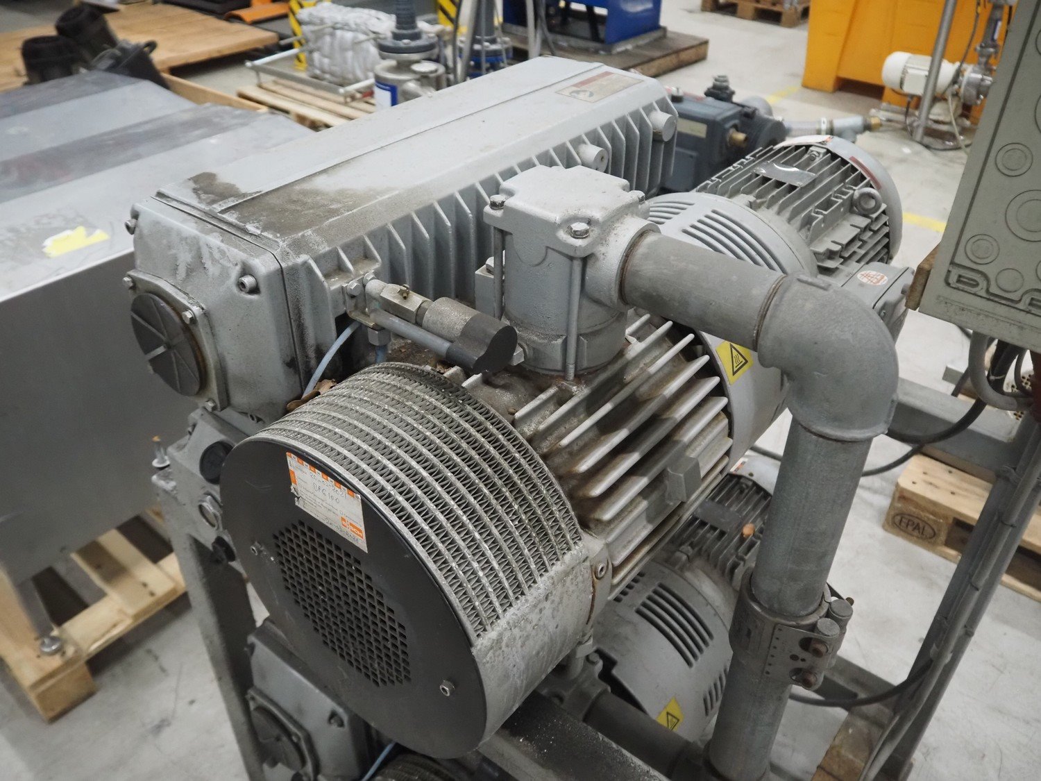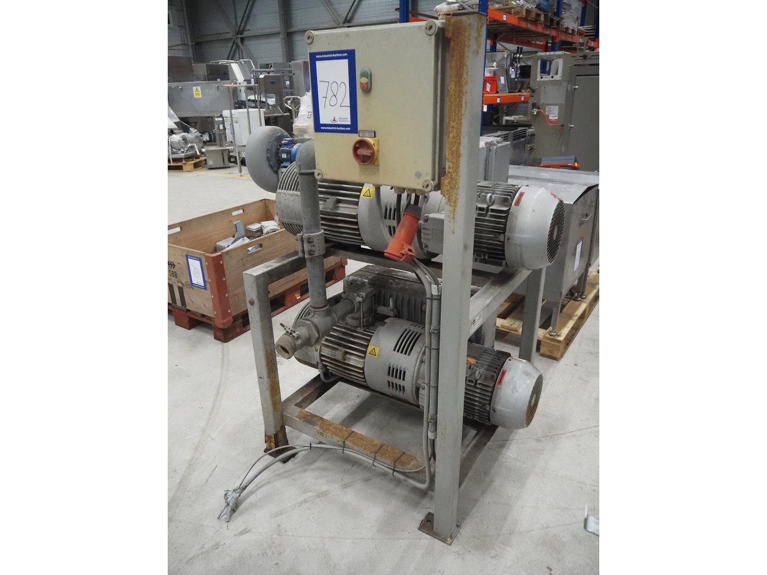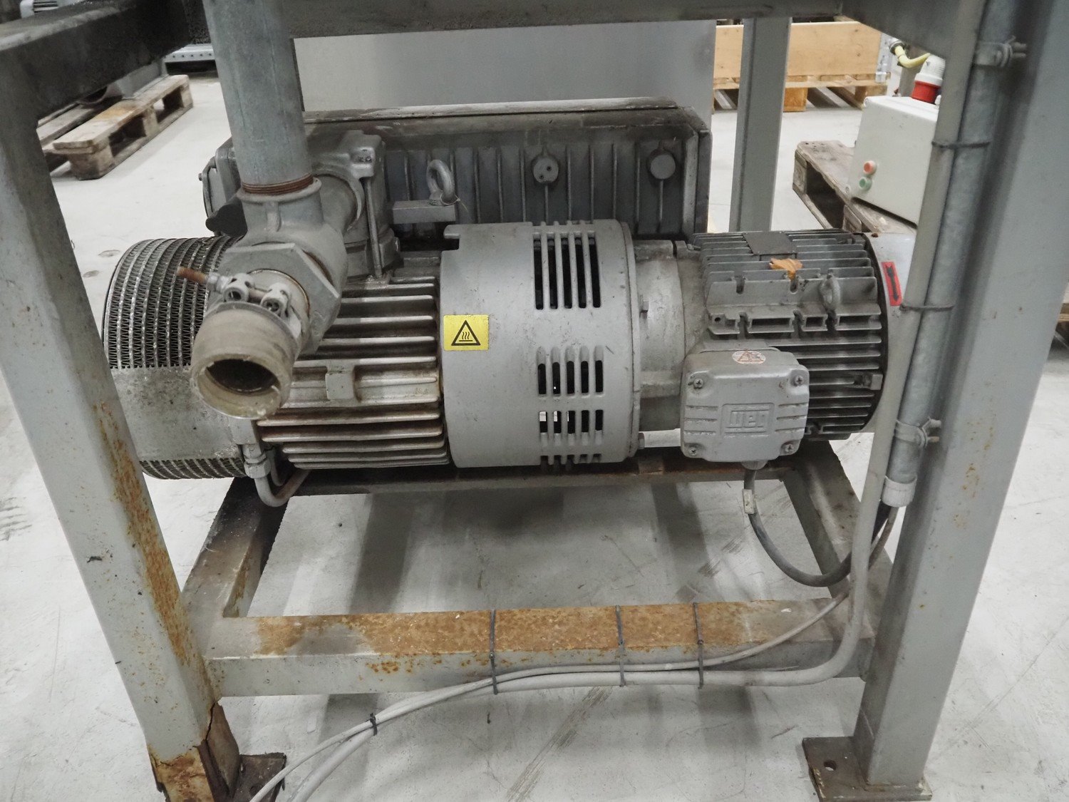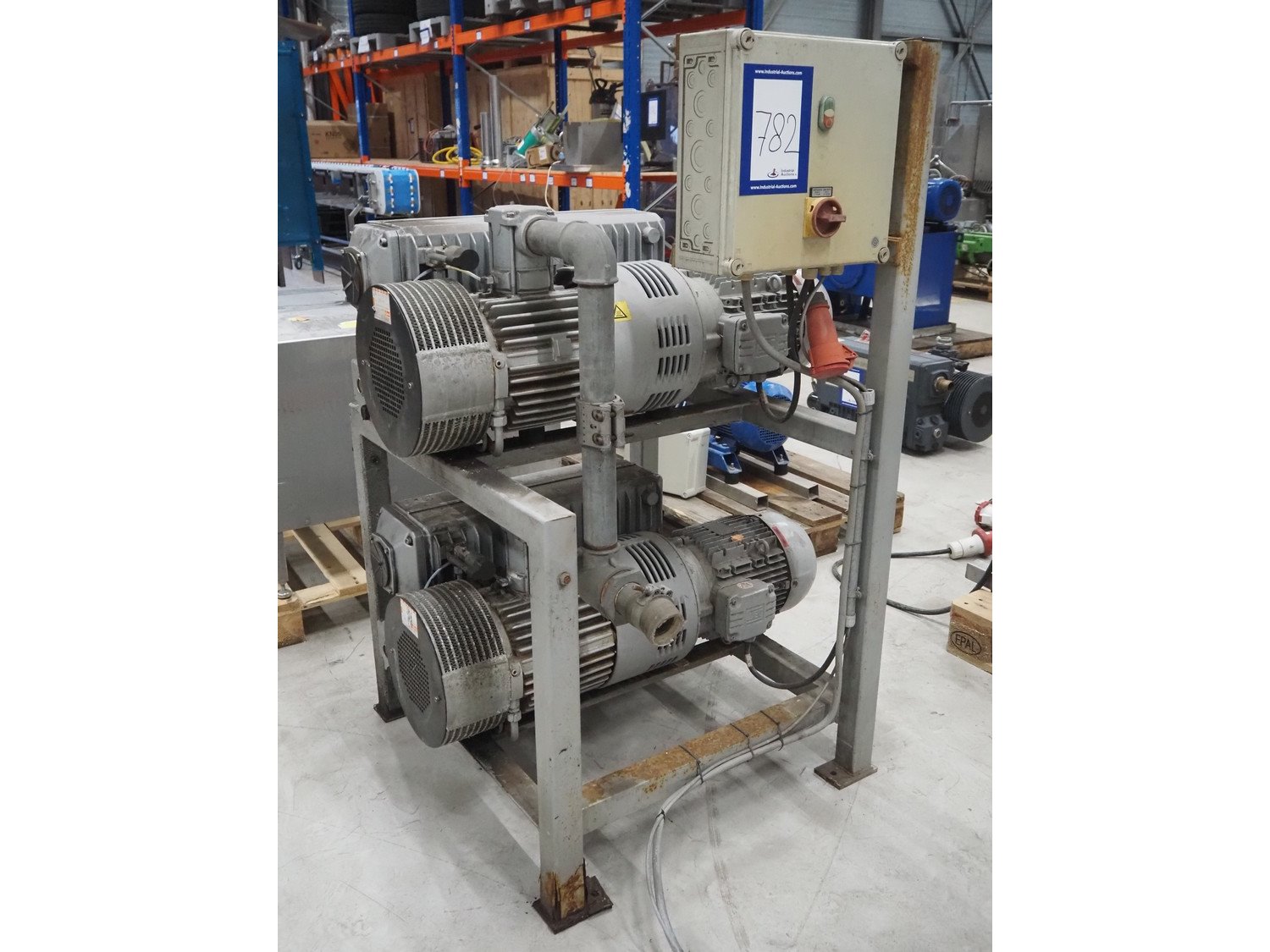 S/s frame with 2 Busch vacuum pumps, type: RA 0302 D 5Z3 CWXZ, number: C1211000500 and C1211000501, year of construction: 2012, capacity: 300 m³ per hour each, dimensions: 1000 mm x 1000 mm x 1520 mm.